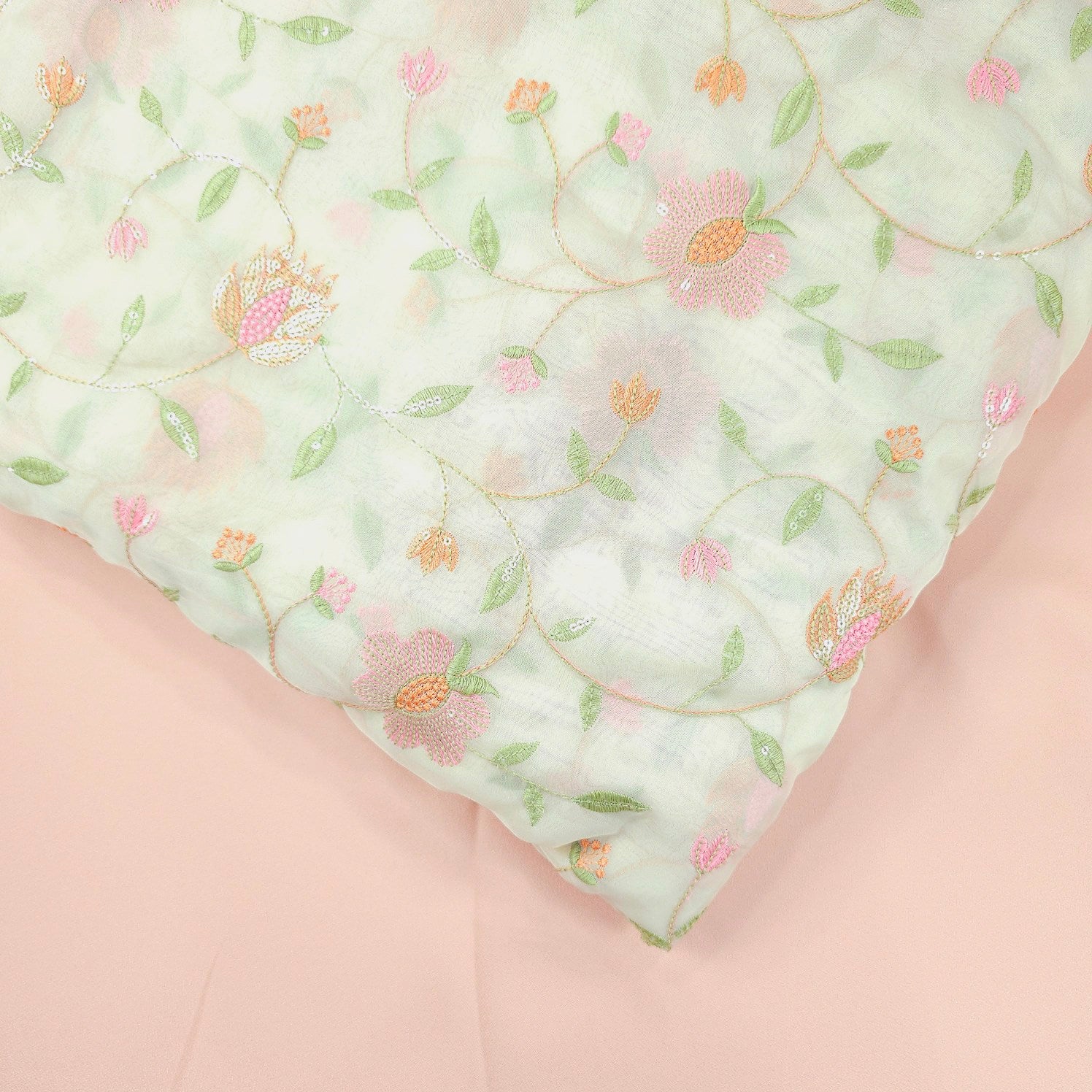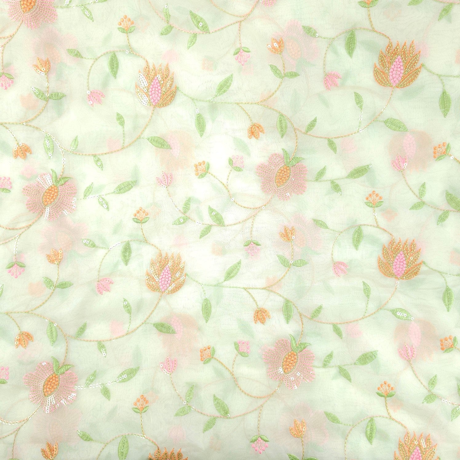 A delicate and sophisticated organza fabric adorned with pastel floral embroidery and subtle sequin detailing. The light and sheer base gives it a soft, airy drape while the intricate threadwork adds a graceful touch of nature. Perfect for festive wear, wedding trousseau, and statement ethnic looks, this fabric effortlessly blends charm with luxury.