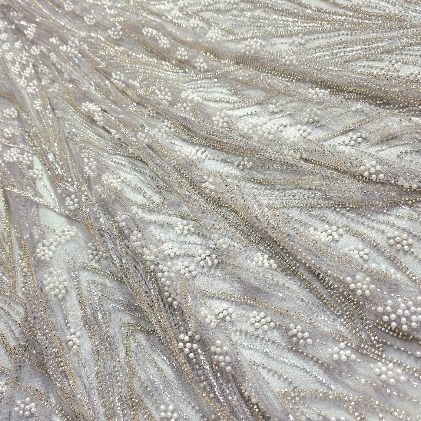 Elegant Net Fabric with intricate sequin and bead embroidery, creating a shimmering leaf and wave-like pattern. The fabric has a luxurious, flowing texture, making it perfect for bridal wear, gowns, and evening ensembles.