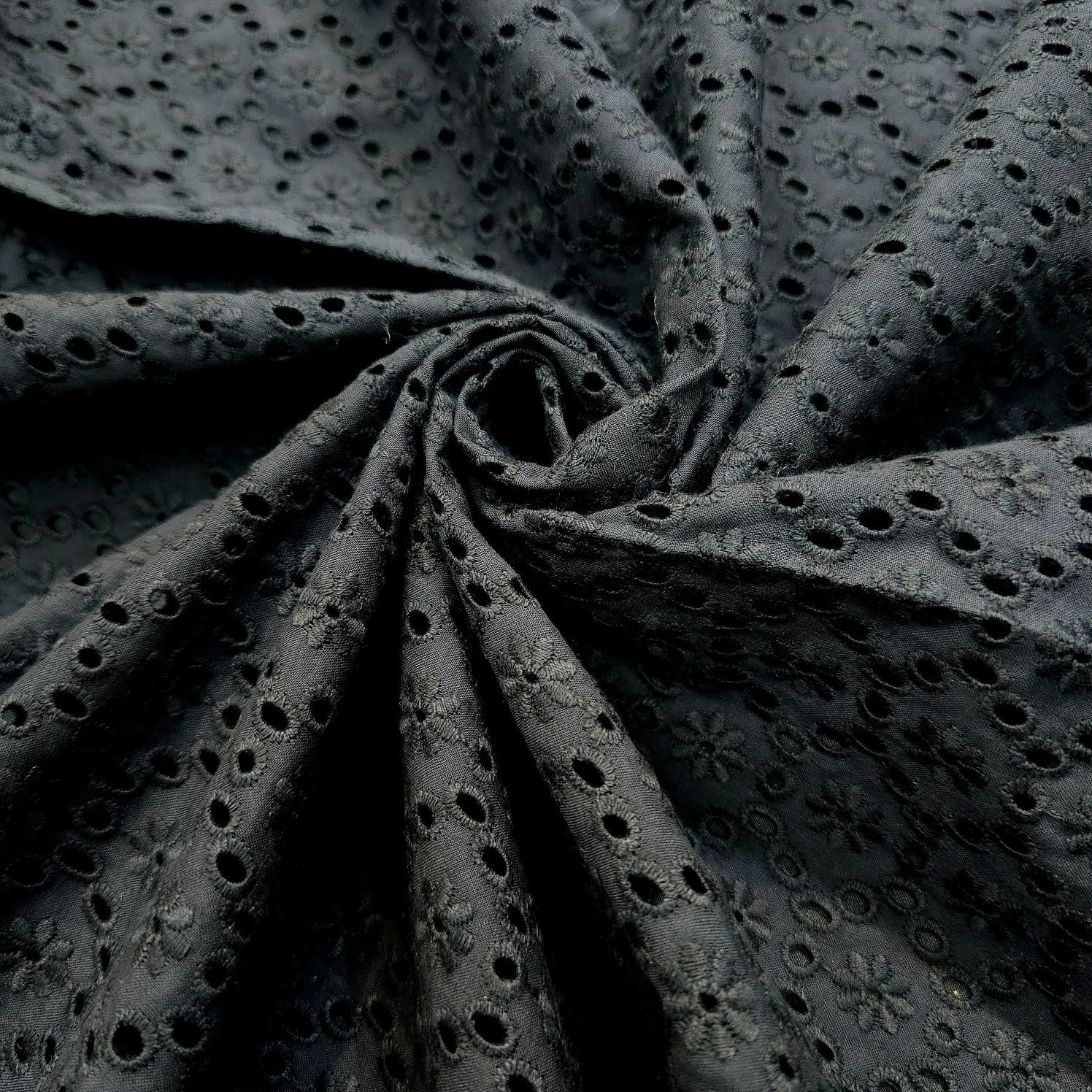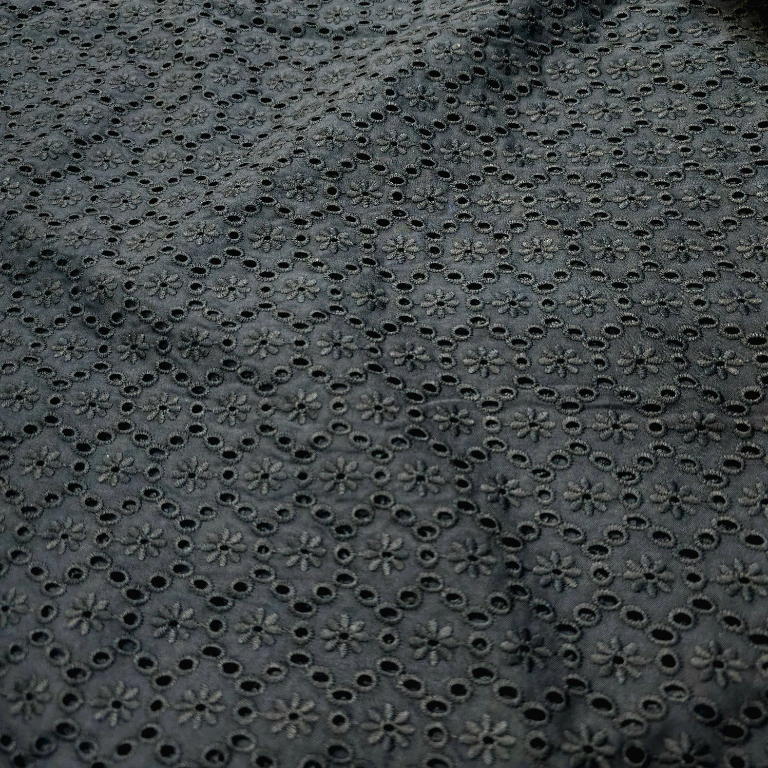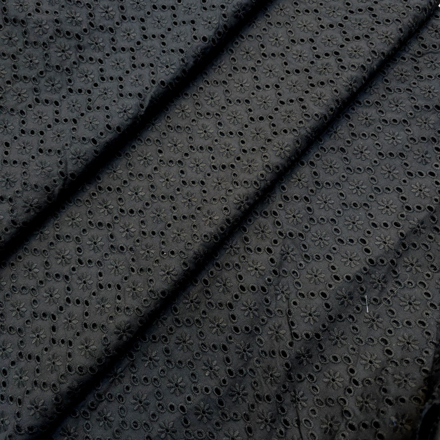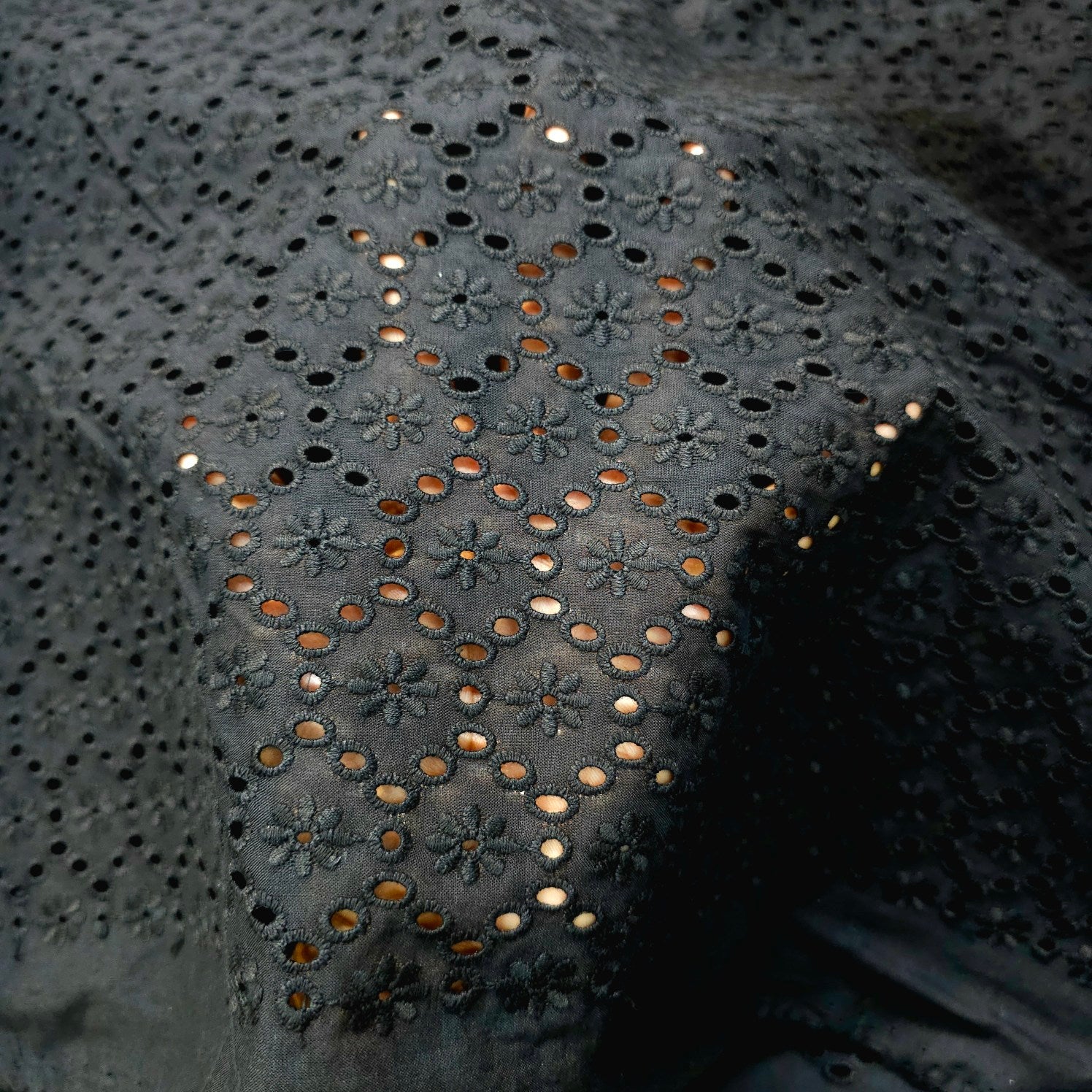 Delicate black chikankari cotton fabric featuring intricate self-embroidery in a soft floral pattern. Light, breathable, and timeless — perfect for creating elegant everyday and summer wear.