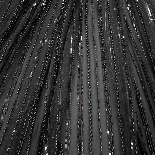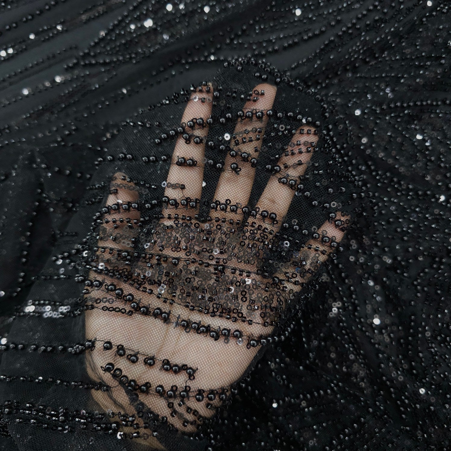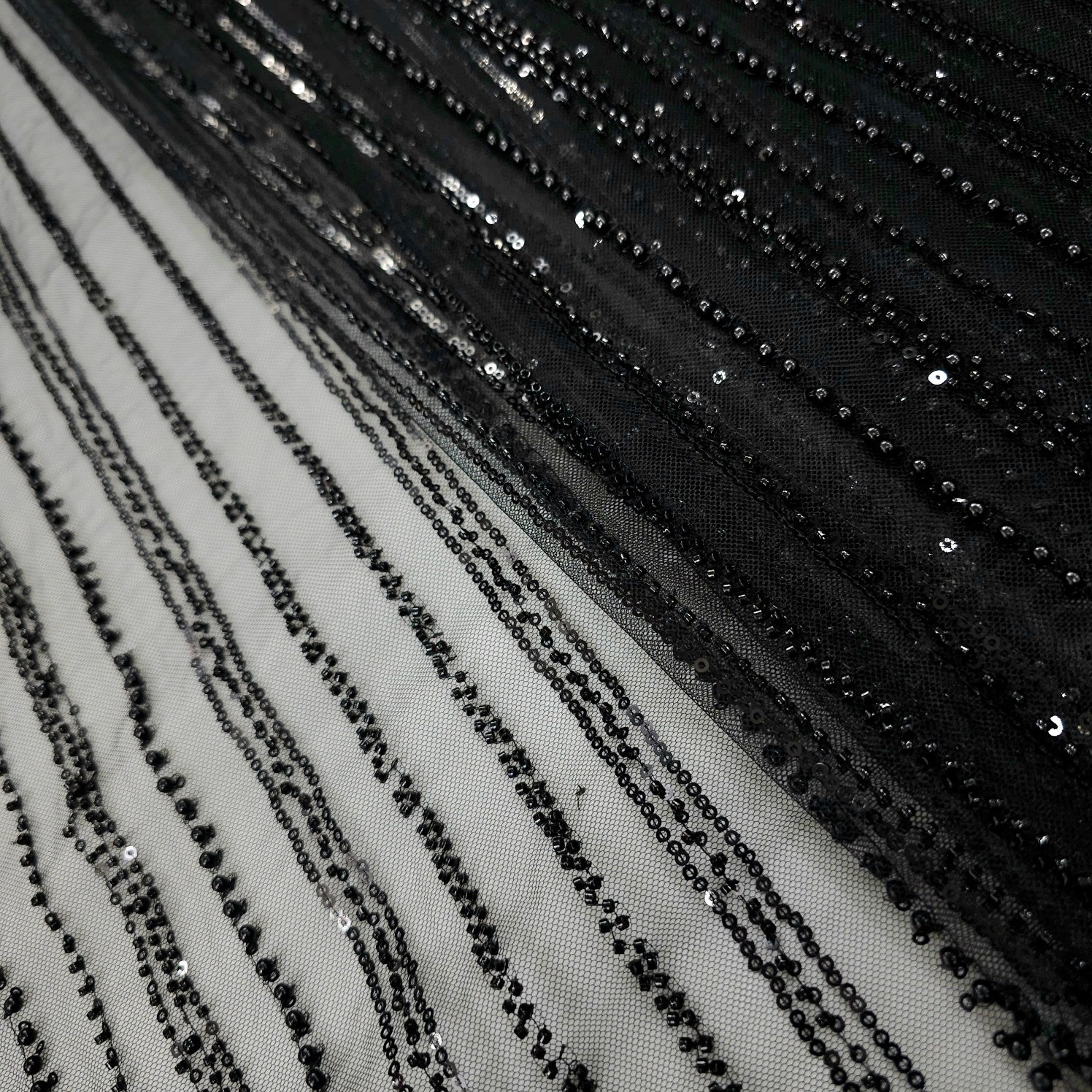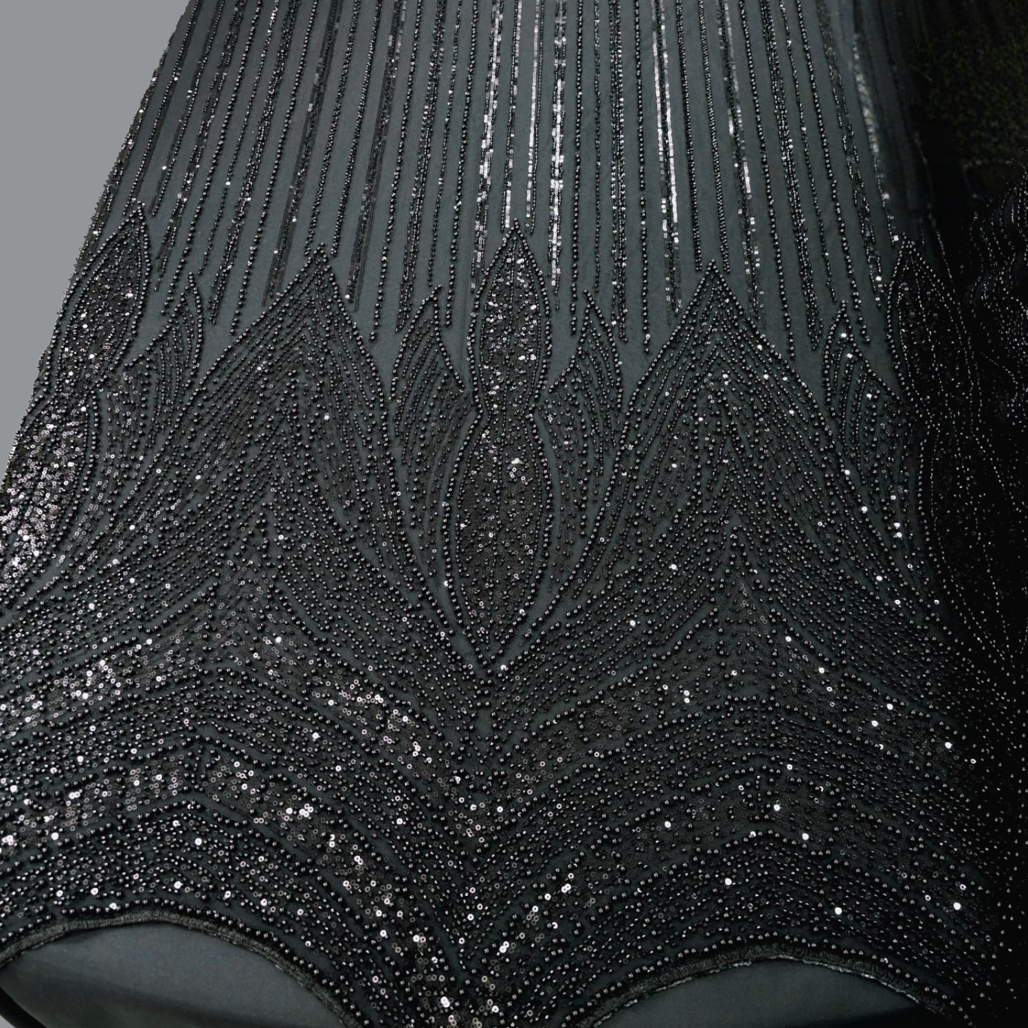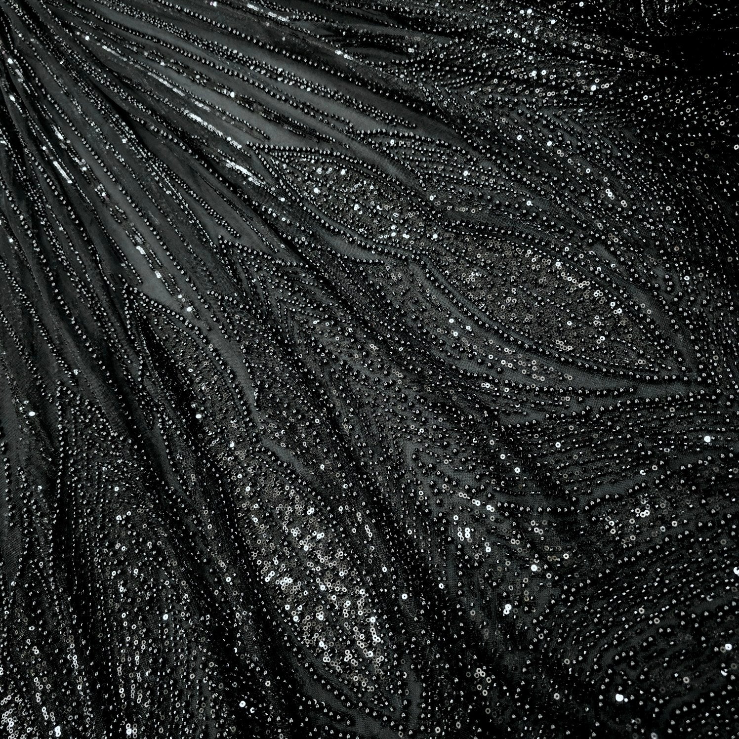 Elegant net fabric with intricate sequin and bead embroidery, creating a shimmering leaf and wave-like pattern. The fabric has a luxurious, flowing texture, making it perfect for bridal wear, gowns, and evening ensembles.