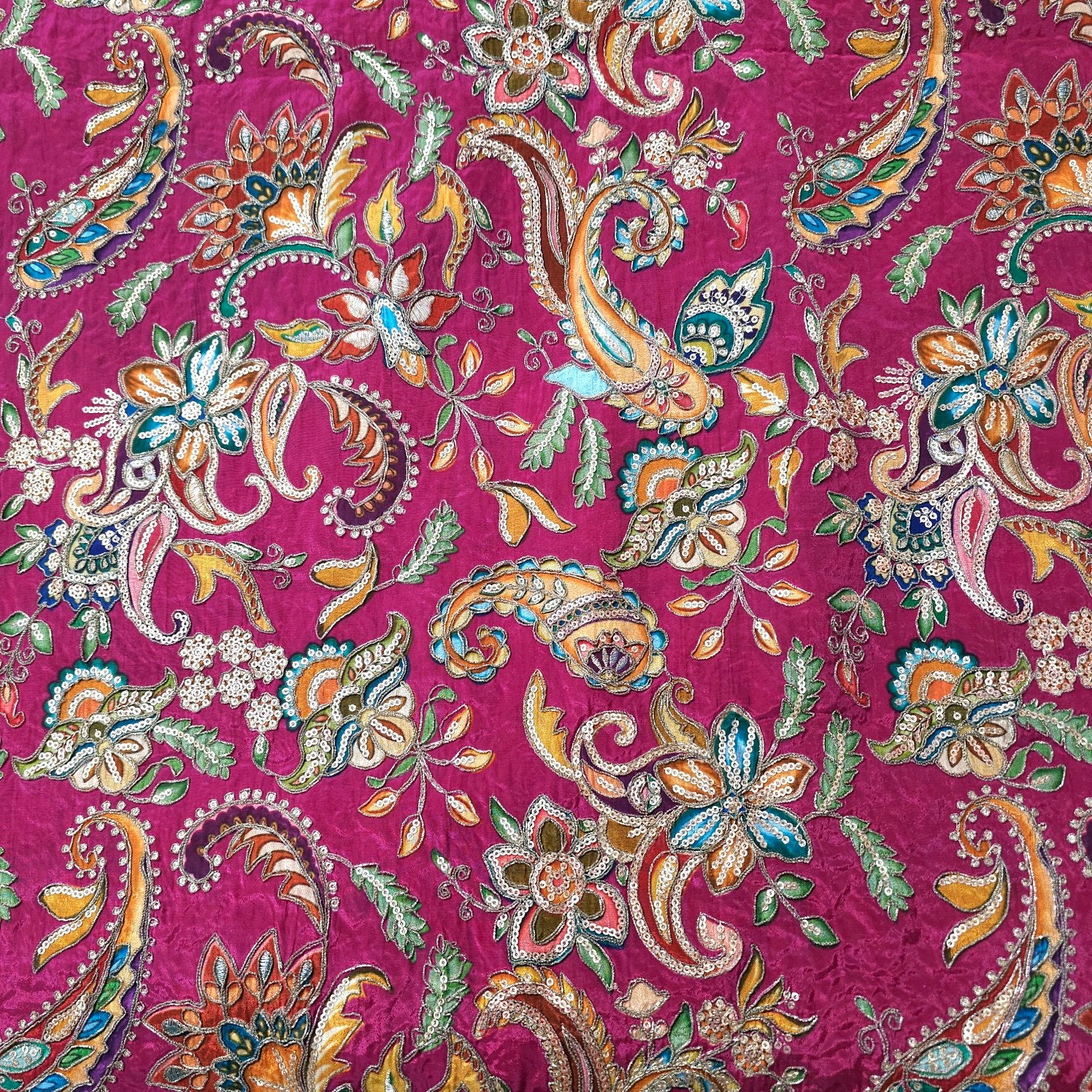 A rich crepe base brought to life with intricate multicolor embroidery, featuring vibrant floral and paisley motifs in shades of yellow, green, blue, and pink. The detailed threadwork is beautifully complemented by shimmering silver zari outlines and delicate sequin accents, adding depth and festive charm. This luxurious fabric blends traditional artistry with bold colors, making it a statement choice for grand ethnic ensembles.