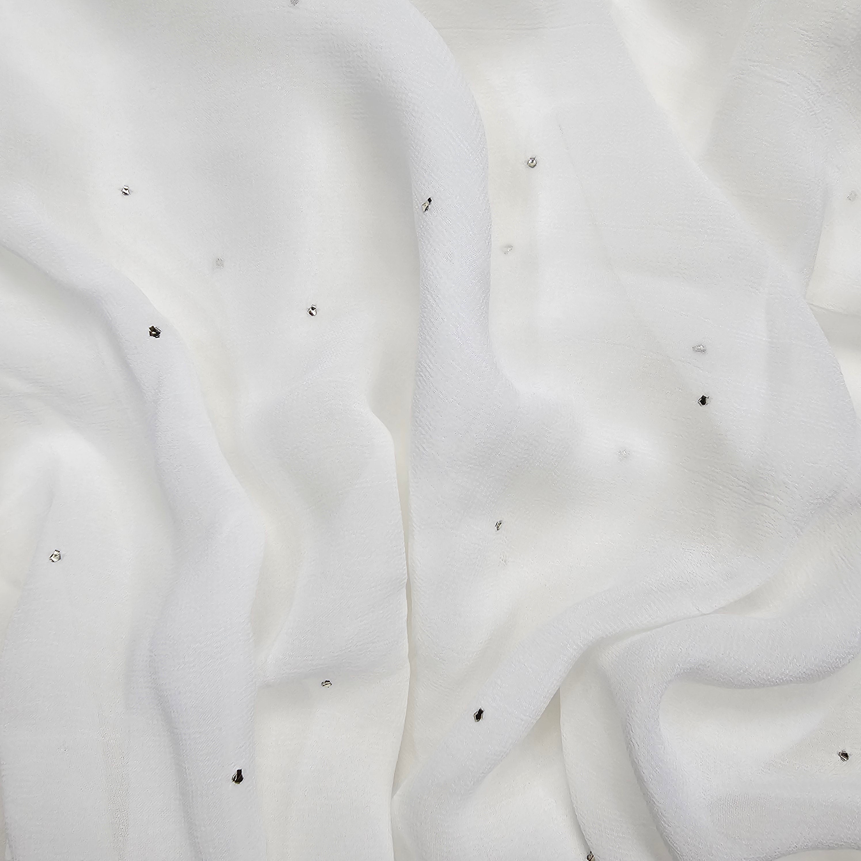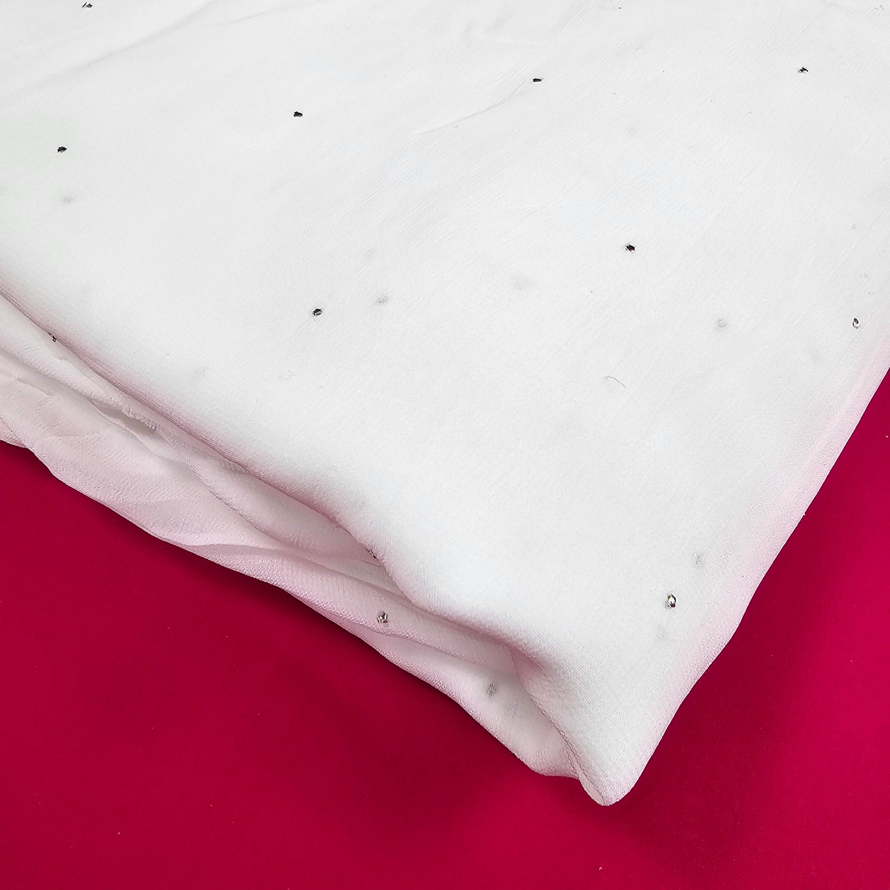 Elegant dyeable georgette base fabric adorned with delicate Mukesh also known as Badla or Aka work. Work remains as it is after dyeing. The tiny hand-inserted metallic dots add a subtle sparkle, creating a classic and timeless appeal. Known for its minimalistic charm, this fabric is perfect for ethnic wear that demands grace without overwhelming embellishment.
