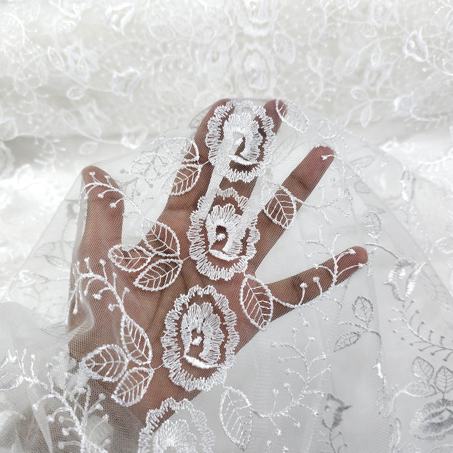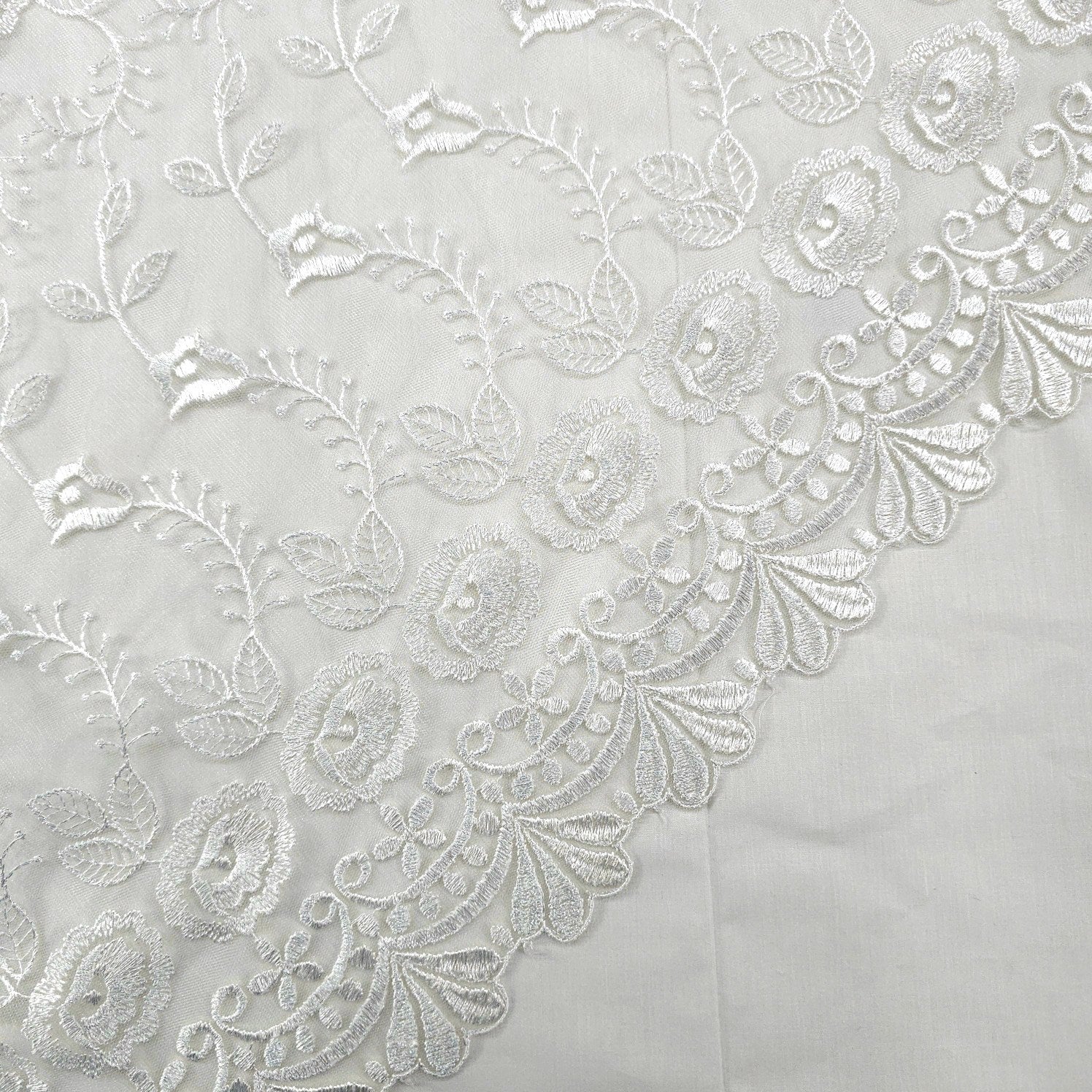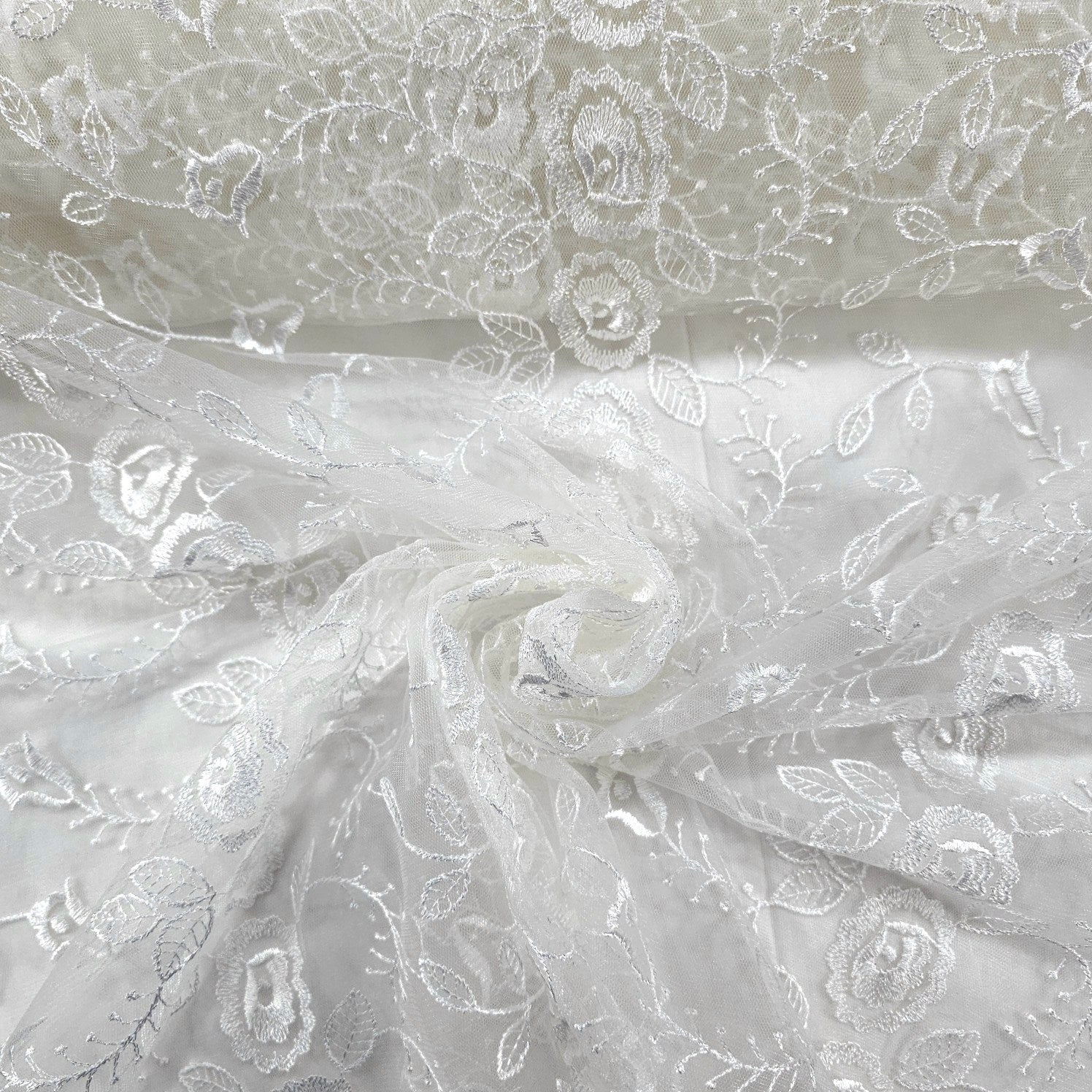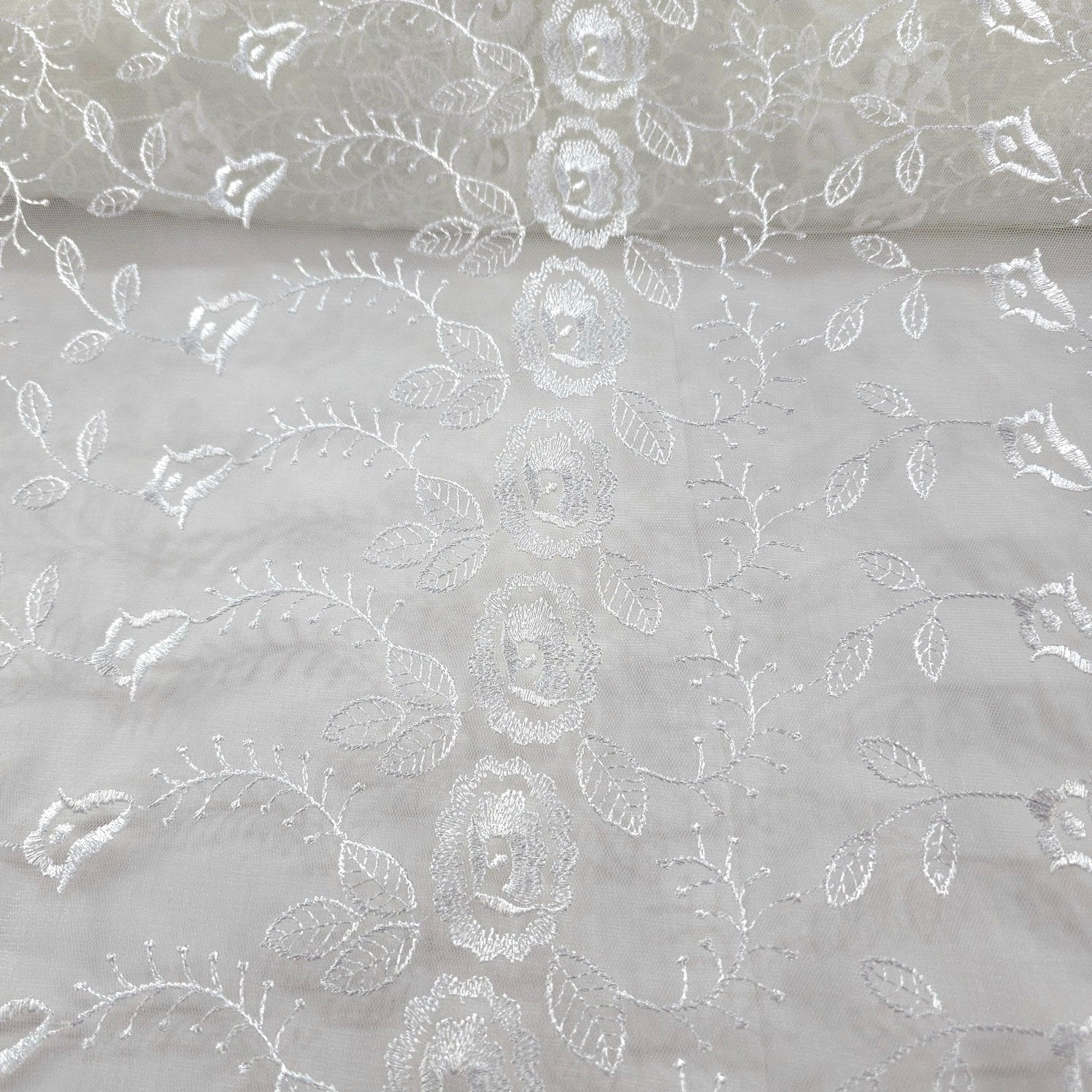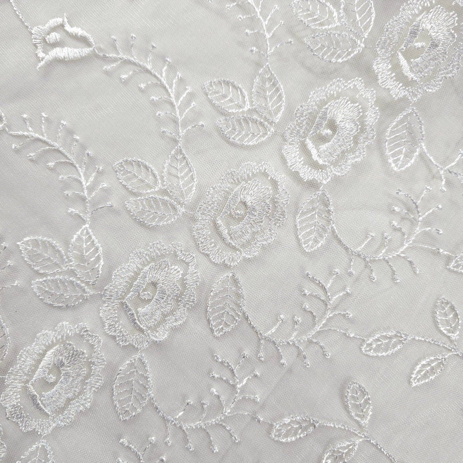 This elegant white net fabric features a cascading pattern of bold rosette motifs and finely detailed leaf vines. The embroidery is rich yet spaced, allowing the intricate rose-inspired florals to stand out against the sheer base. With its graceful flow and delicate design, this fabric adds a touch of vintage romance to any ensemble perfect for bridal gown, veils or statement dupattas and overlays.