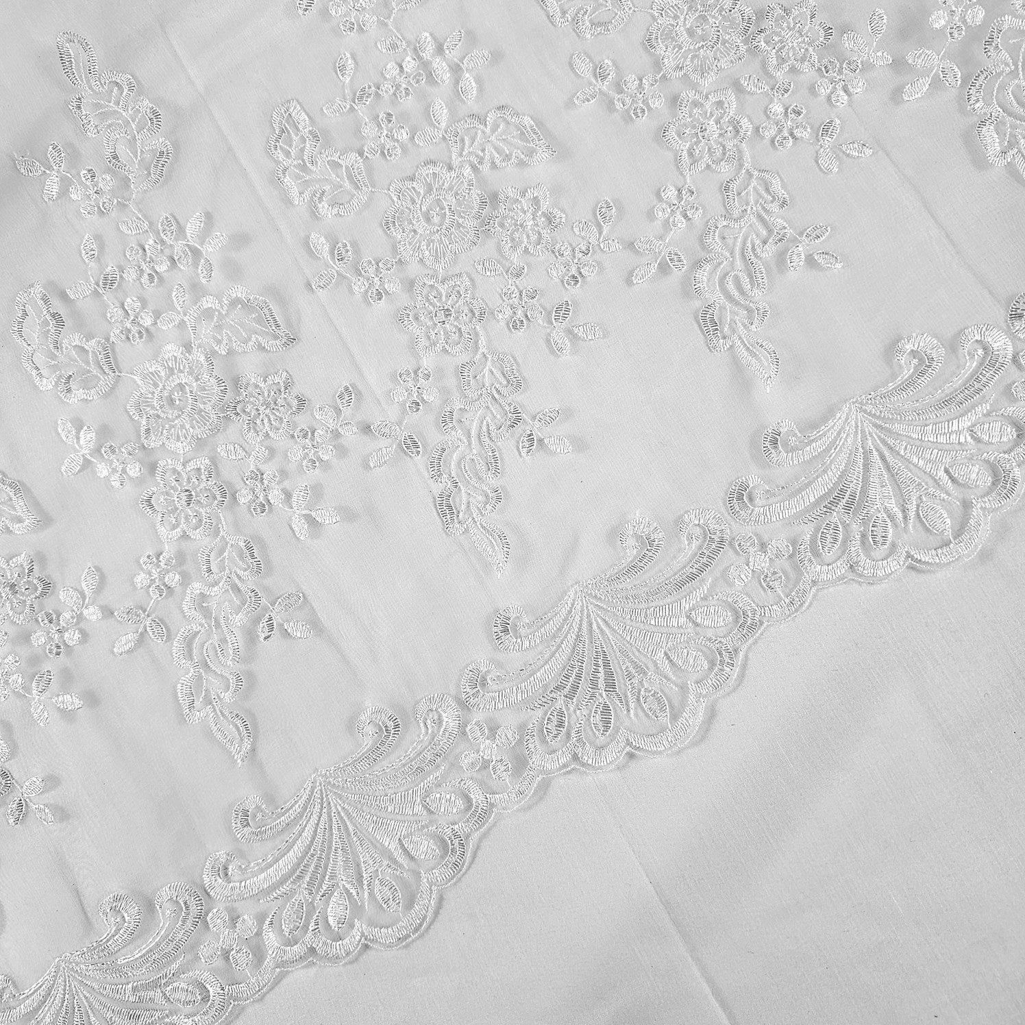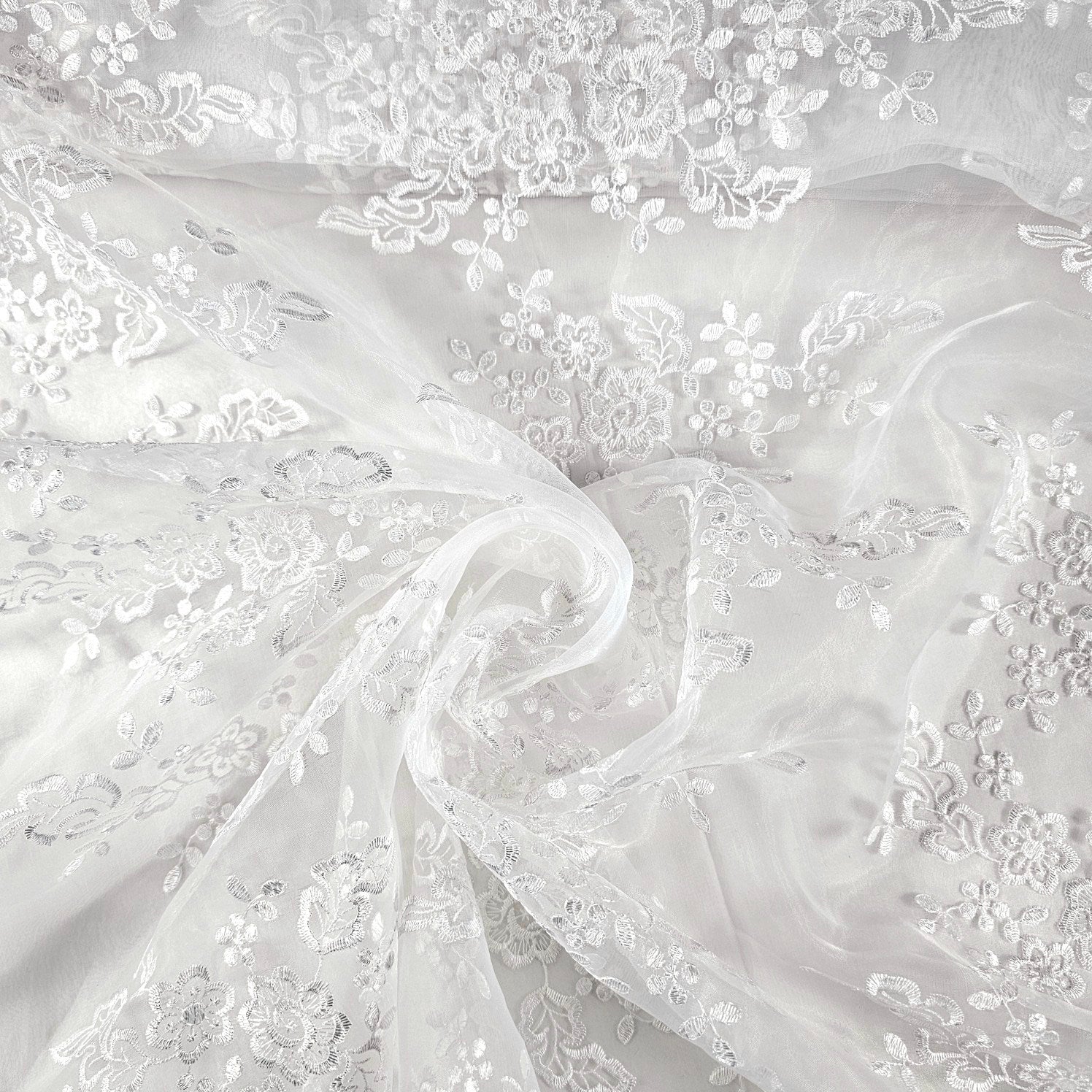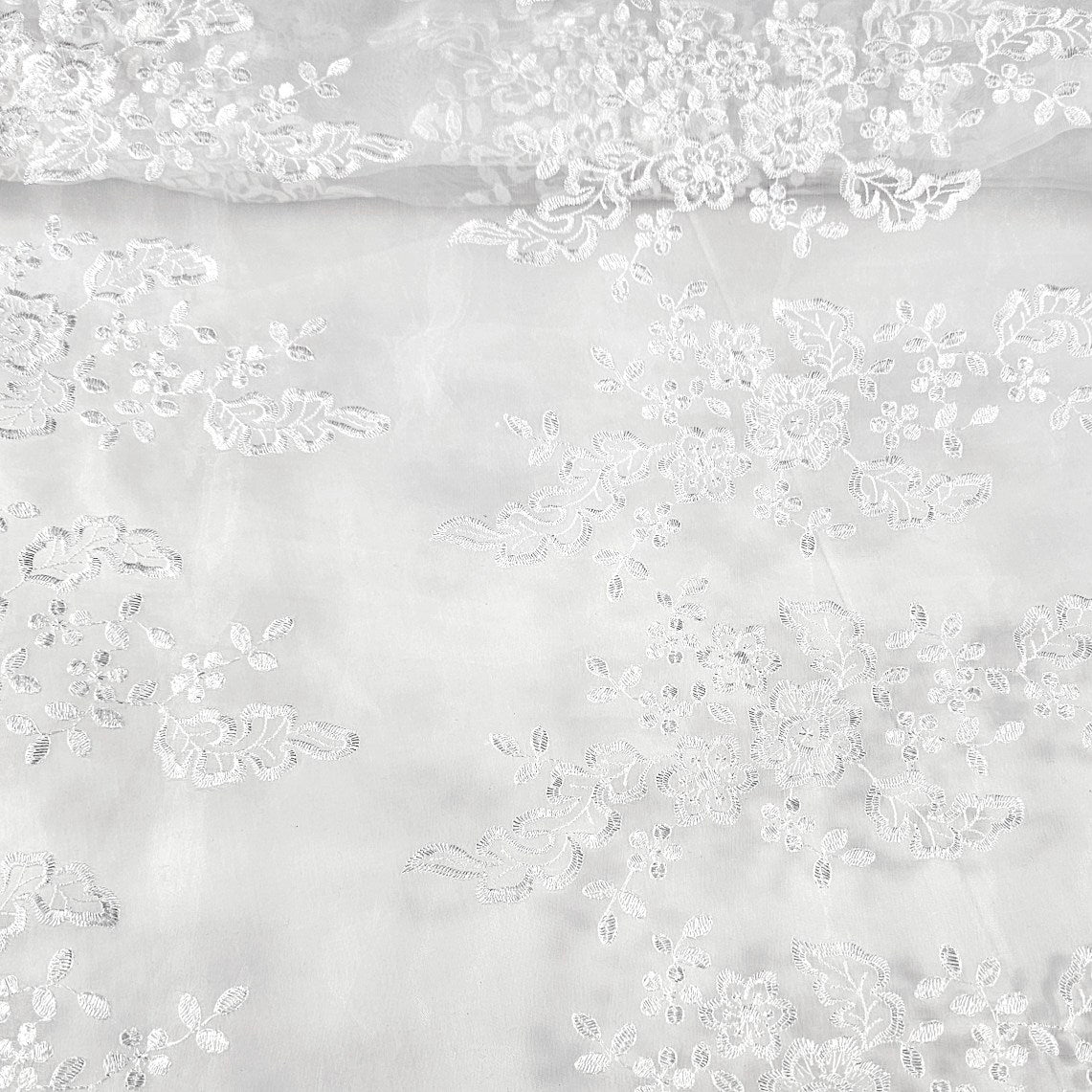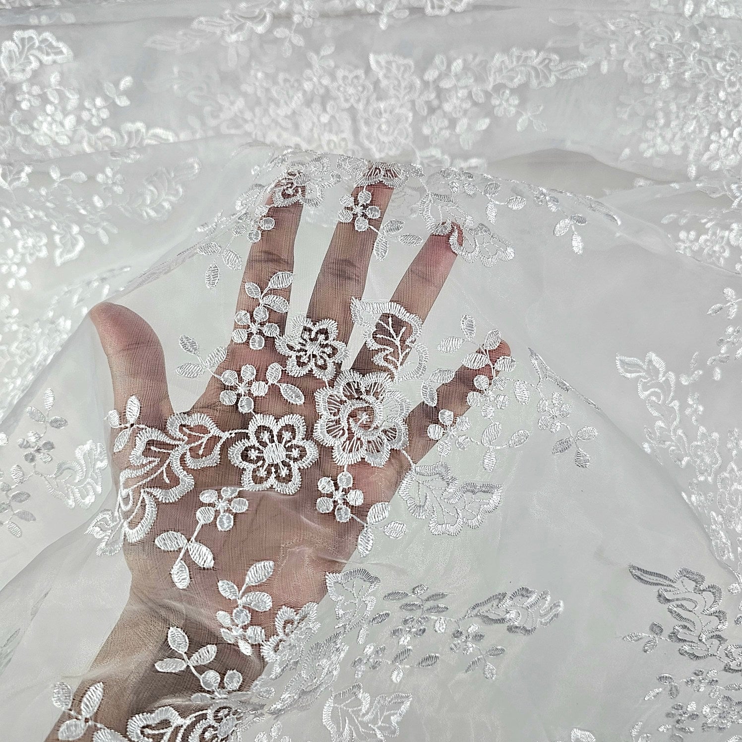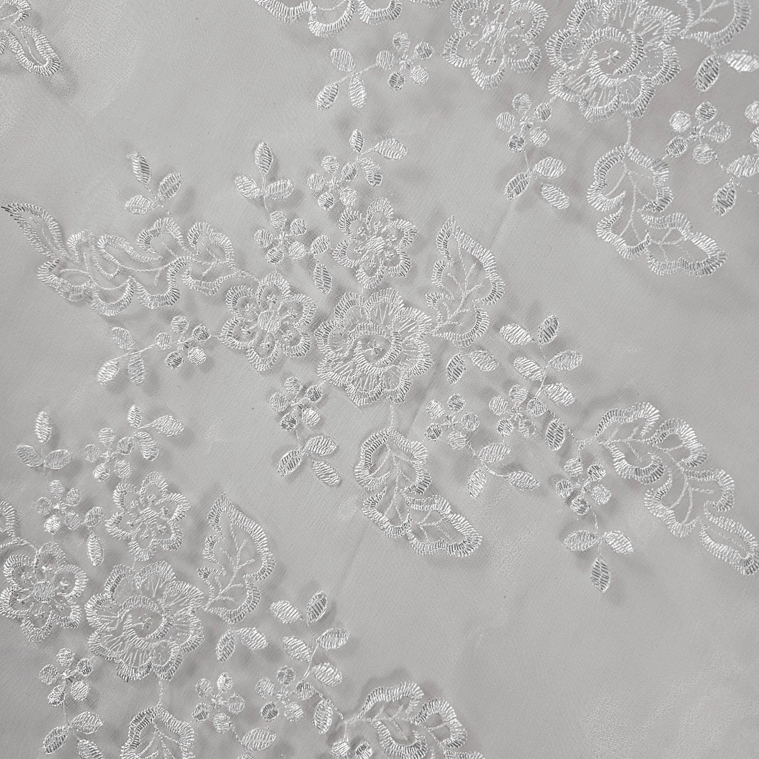 This elegant white organza fabric is adorned with a balanced mix of floral embroidery, delicately arranged across a transparent base. The pattern features small clustered blossoms and leafy scrolls, creating a graceful and breathable layout that flows beautifully when draped. Ideal for bridal veils, dupattas, or lightweight overlays, the fabric combines sophistication with a subtle whimsical charm.