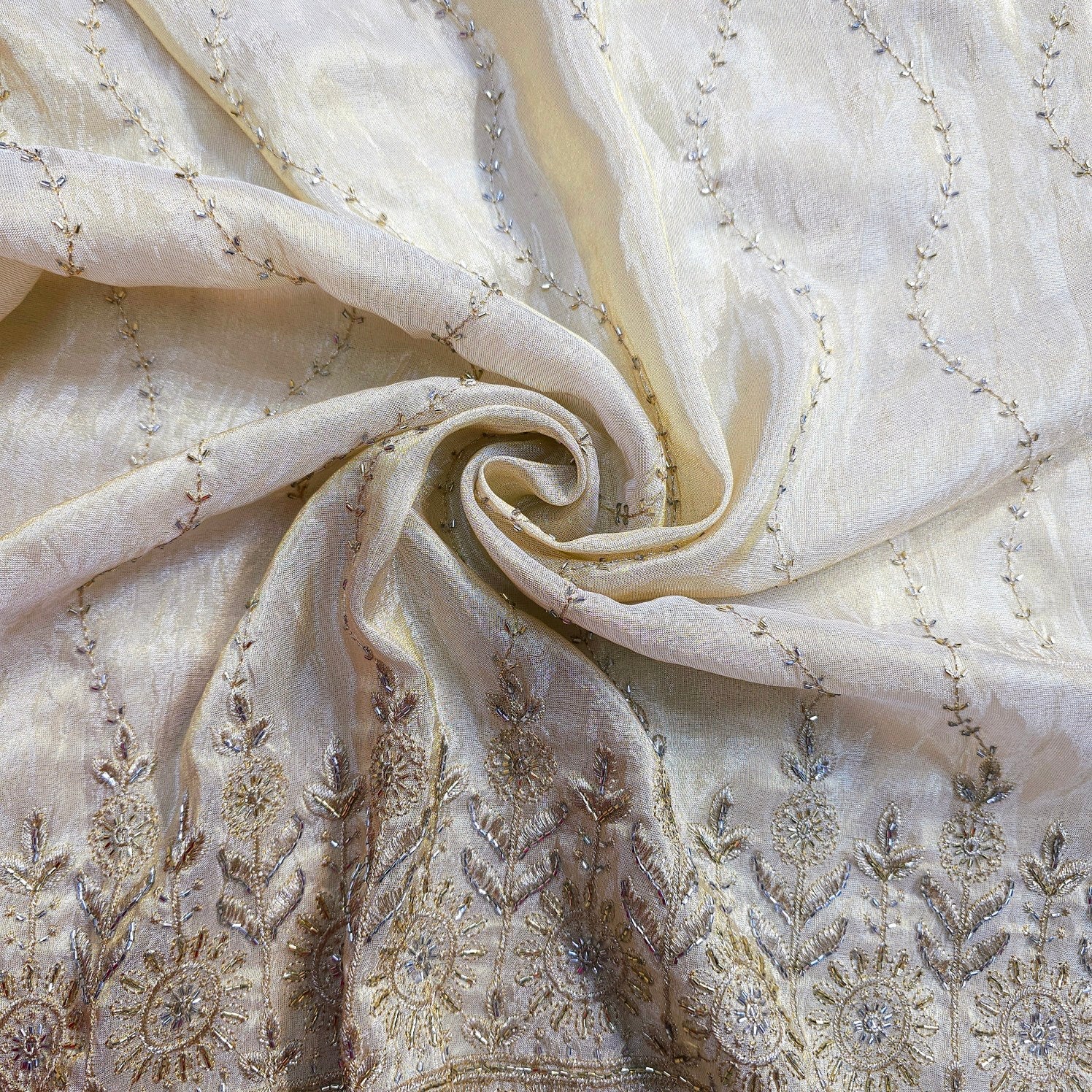 This stunning dyeable shimmer tissue fabric features detailed embroidery with sequins, zari, and threadwork, creating a perfect balance of traditional charm and modern elegance. The lower border is adorned with intricate geometric and floral motifs, while delicate vertical patterns add grace throughout the fabric. Ideal for ethnic and bridal outfits.