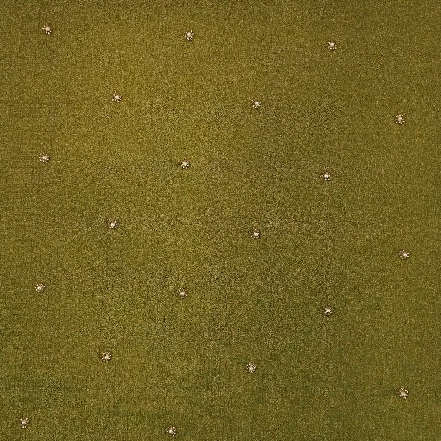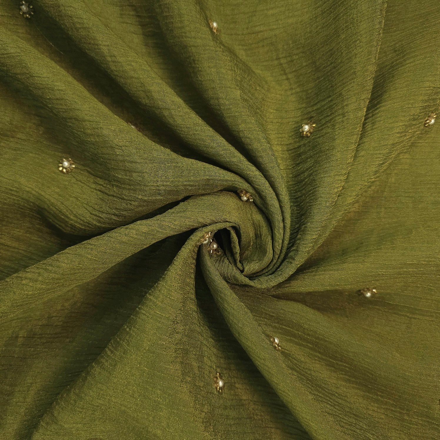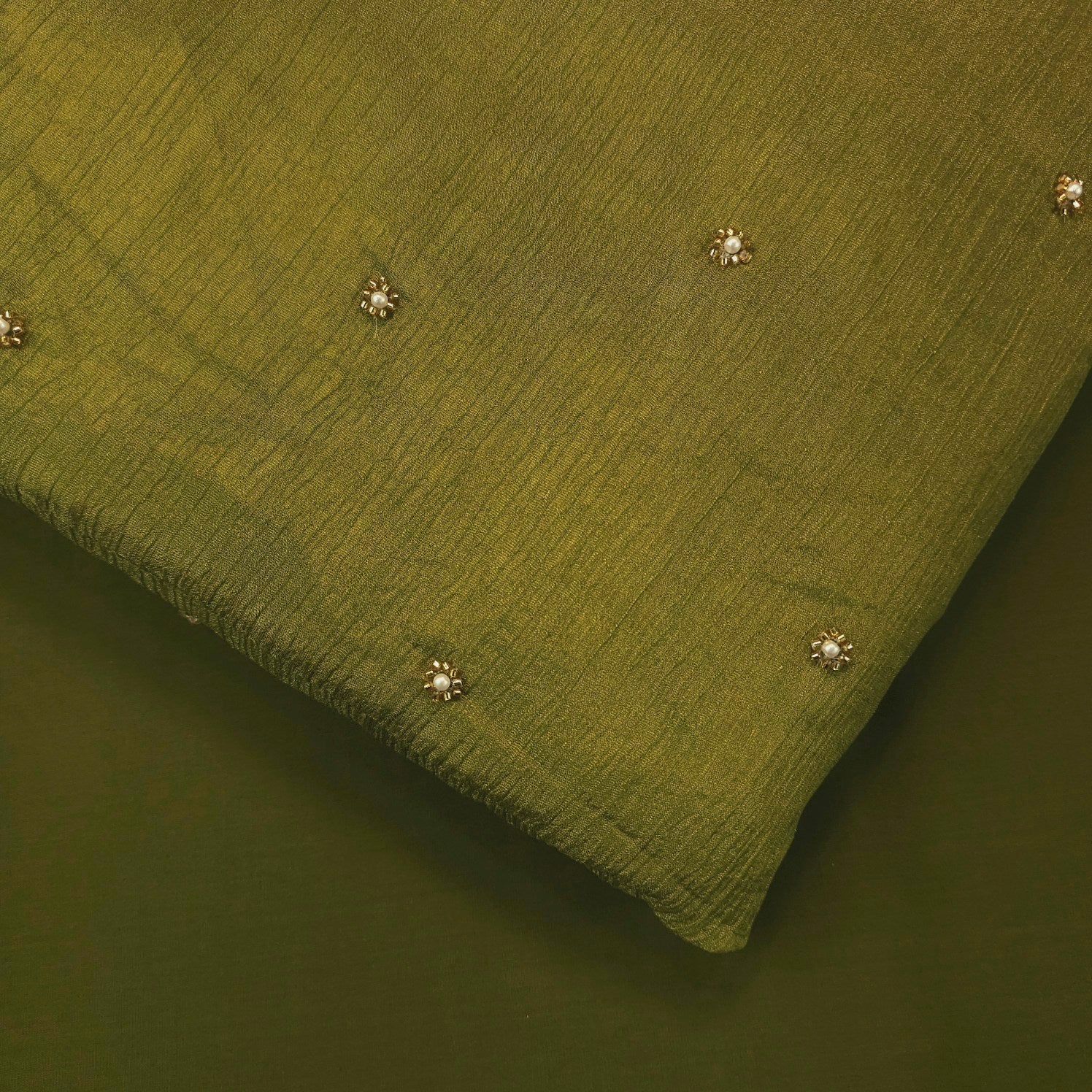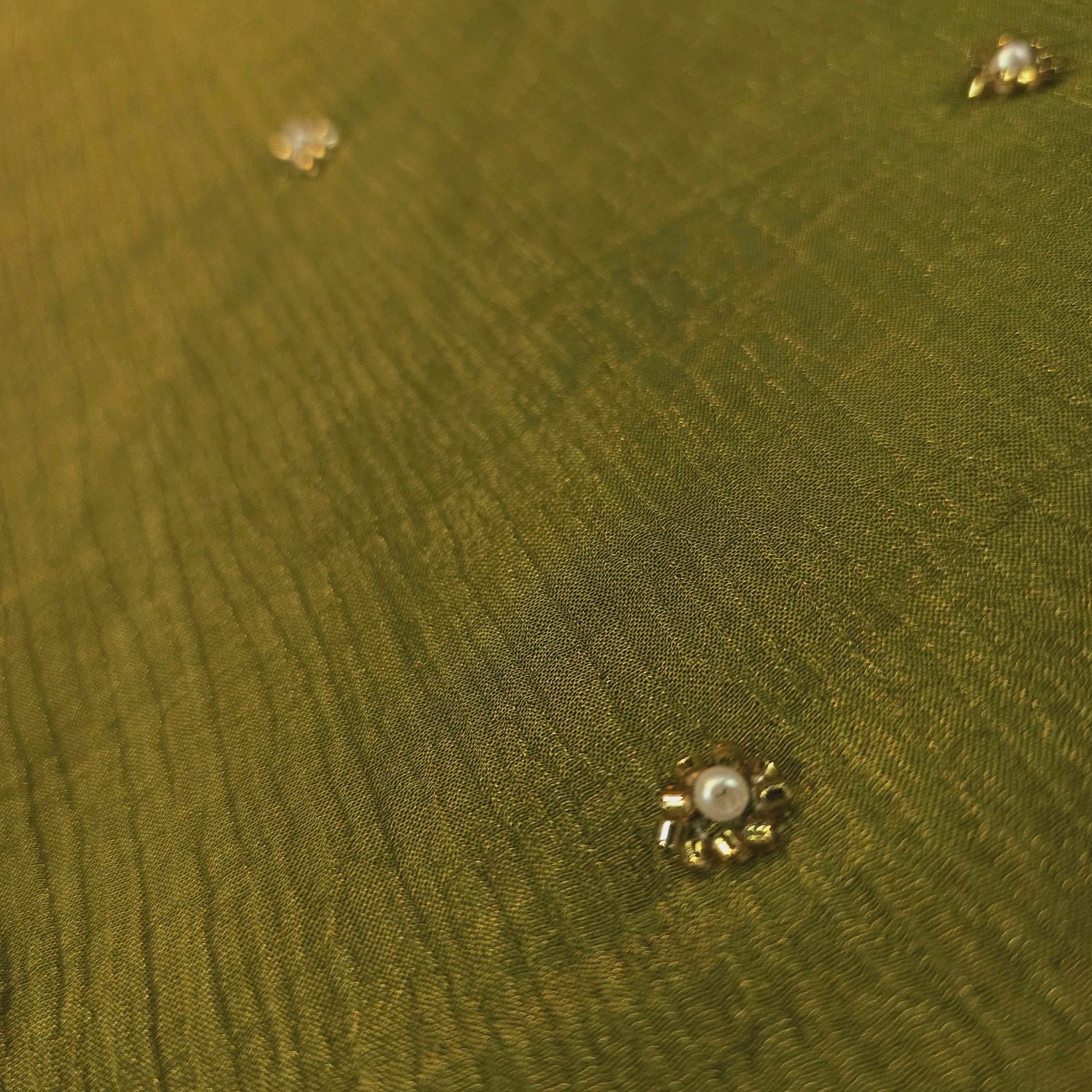This Crushed Tissue fabric features a delicate crinkled texture with a subtle sheen, making it perfect for festive and traditional wear. The fabric is lightweight and airy, with intricately placed pearl and gold embellishments, enhancing its richness and elegance. Inspired by Rajasthani aesthetics, it carries an essence of opulence and grace. Ideal for sarees, dupattas, lehengas, and festive outfits.