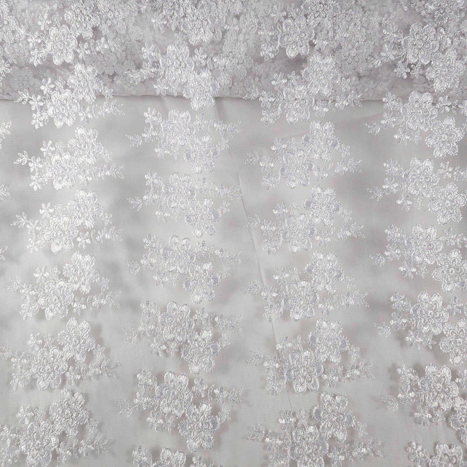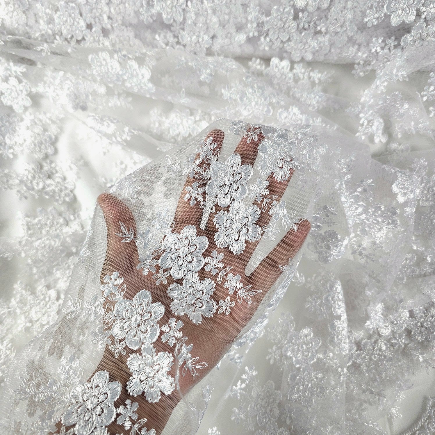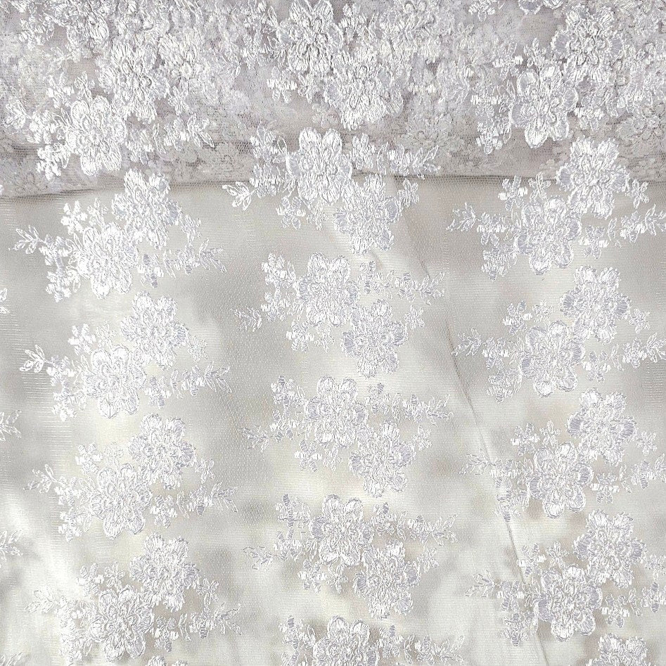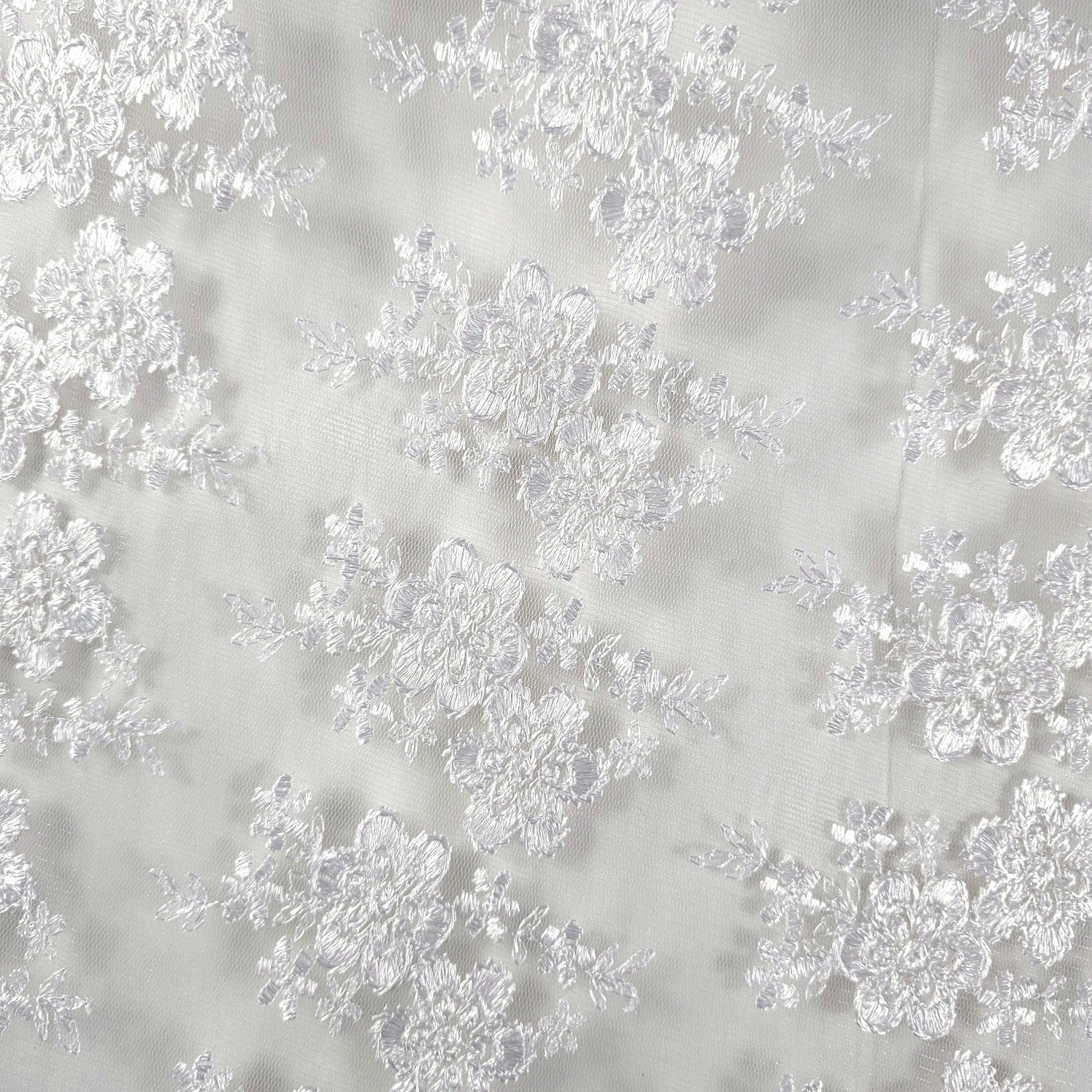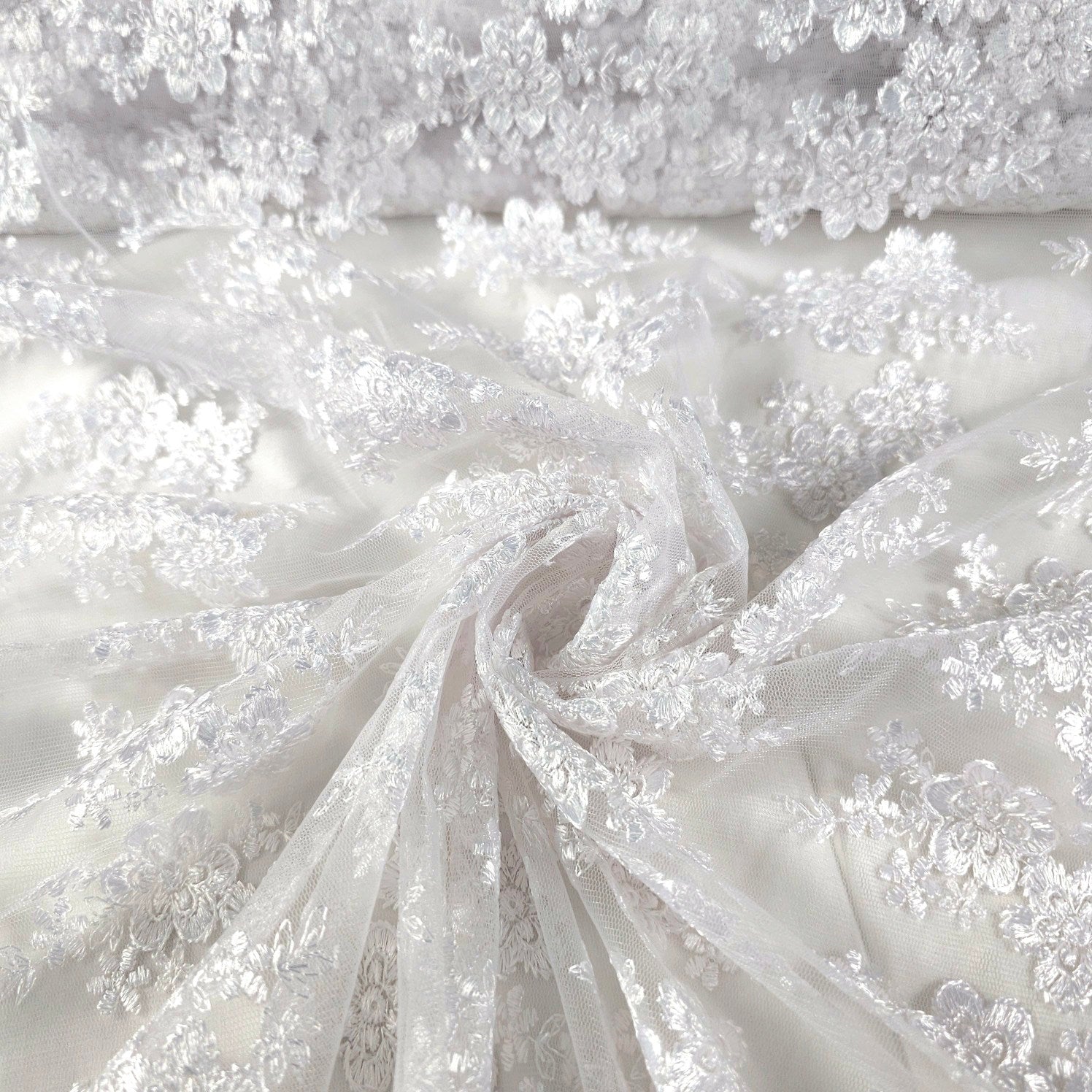 A luminous white net fabric beautifully embellished with dainty floral motifs densely spread across the surface. Each bloom is intricately embroidered with a high-sheen thread, giving a subtle glimmer effect under light. The clustered arrangement of blossoms adds texture while maintaining a lightweight, sheer appeal. Ideal for bridal gowns, dupattas.