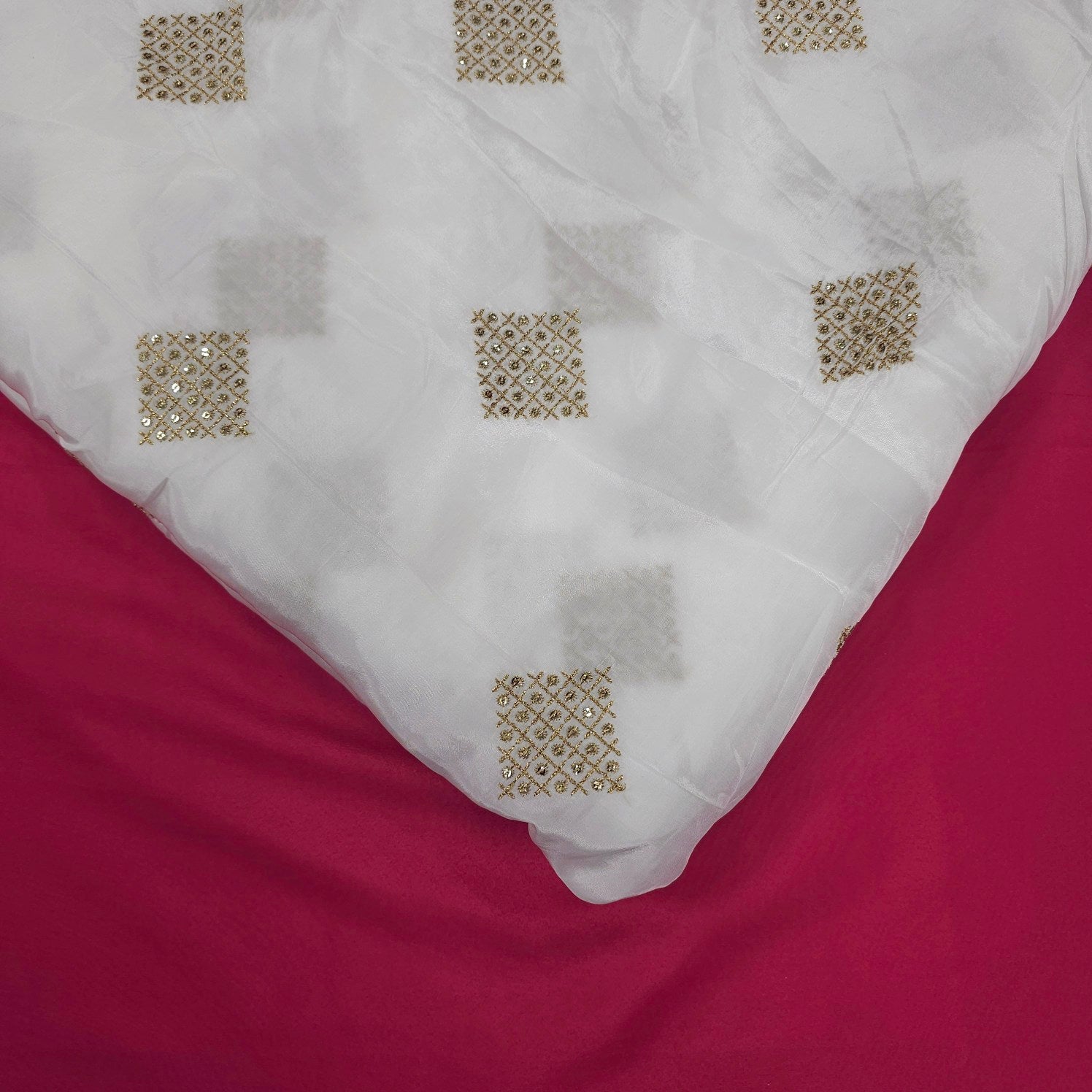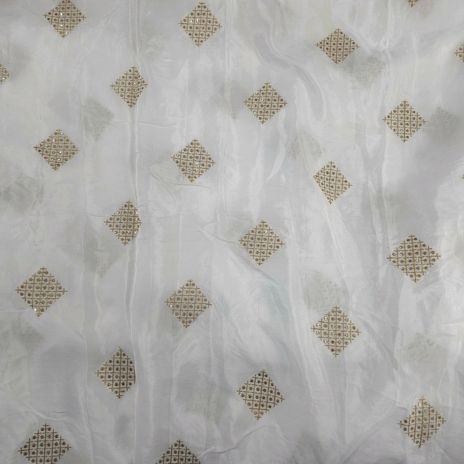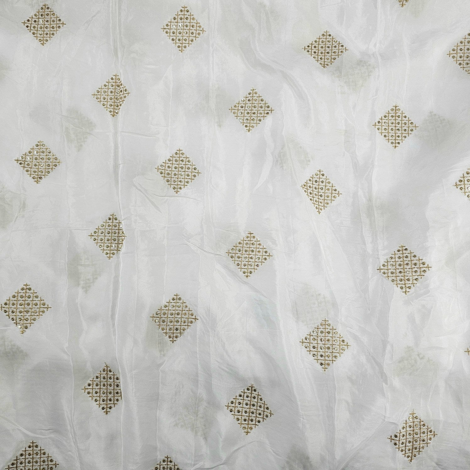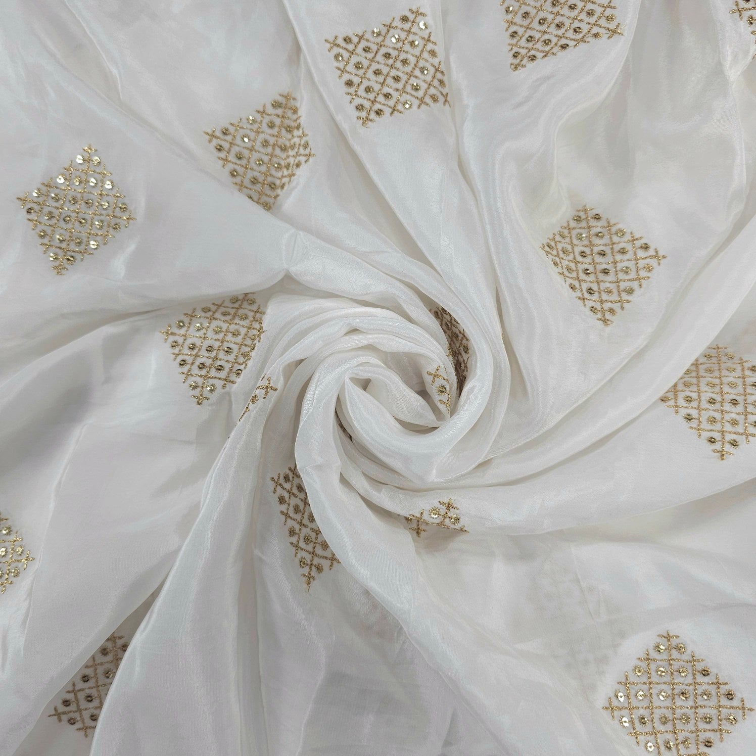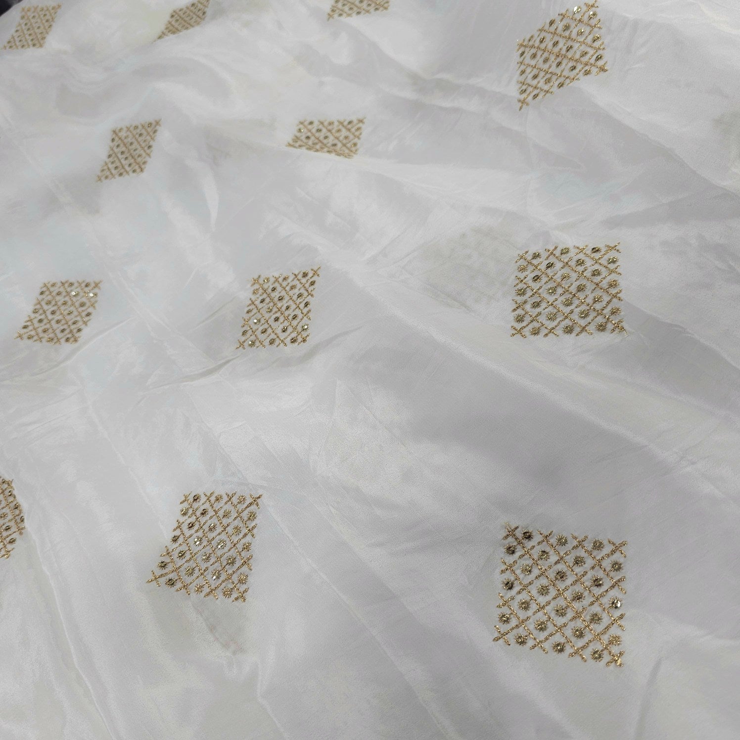 A soft dyeable white Crepe fabric with fine, all over miniature gold butta sequins. The sequin butta are scattered with measured spacing, adding a touch of sparkle and charm without overpowering the flowy base. Ideal for festive and elegant occasion wear.