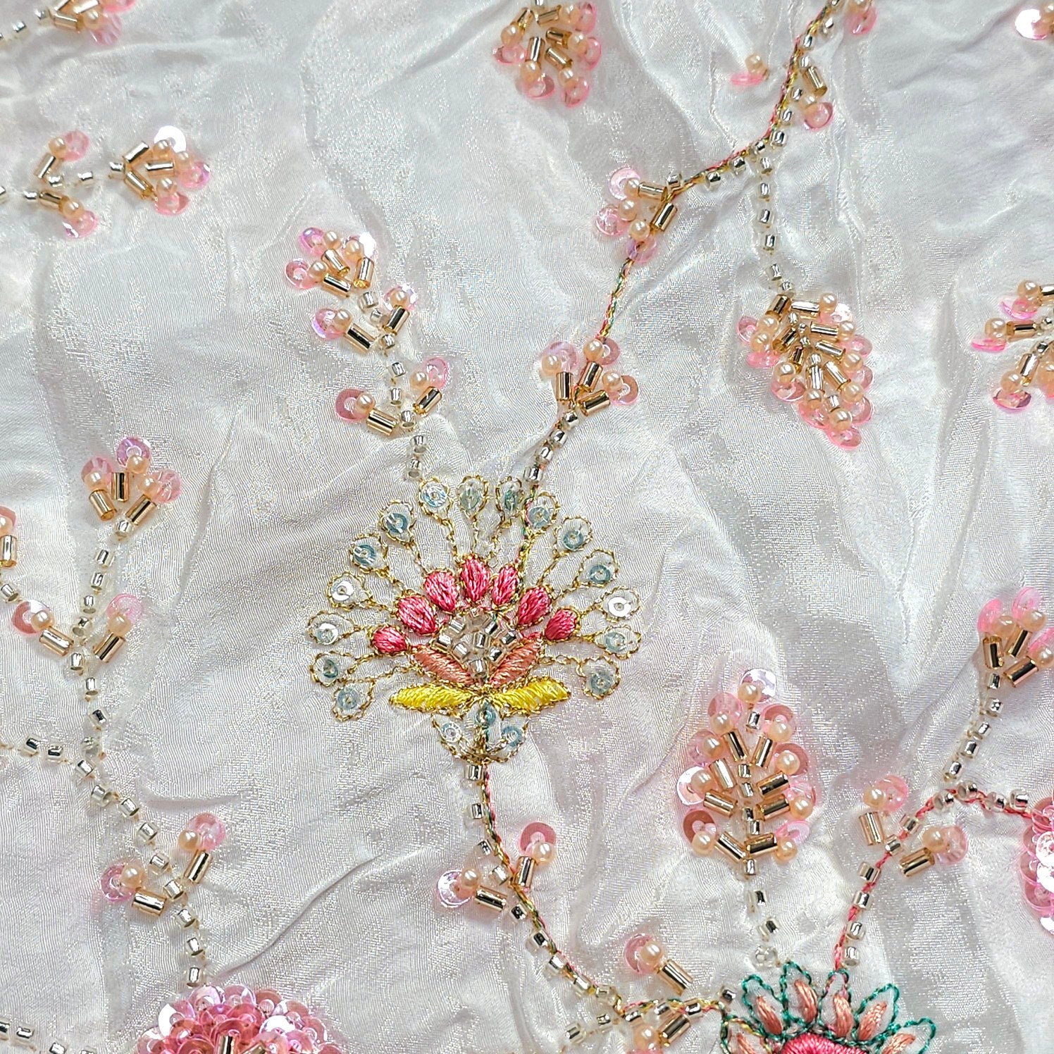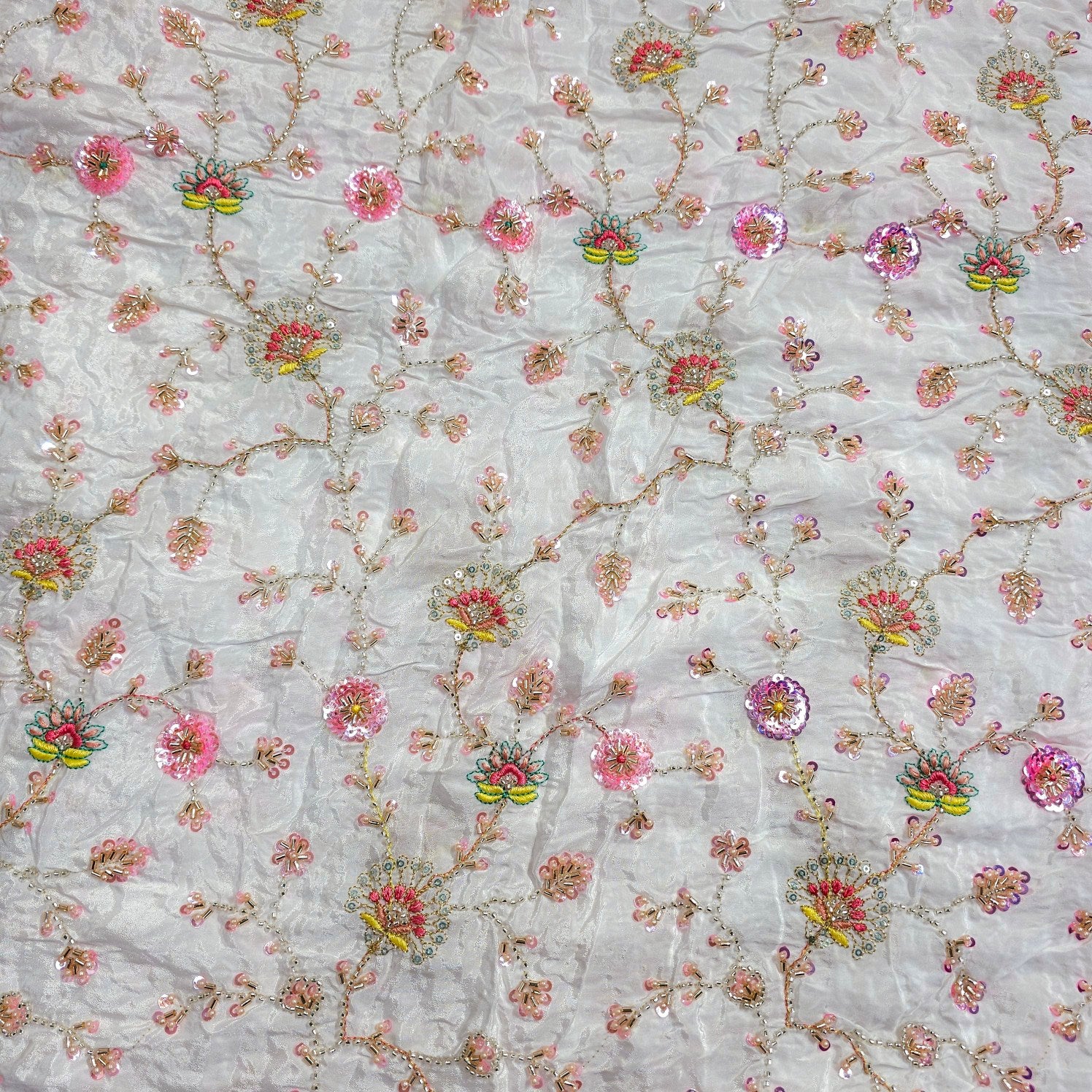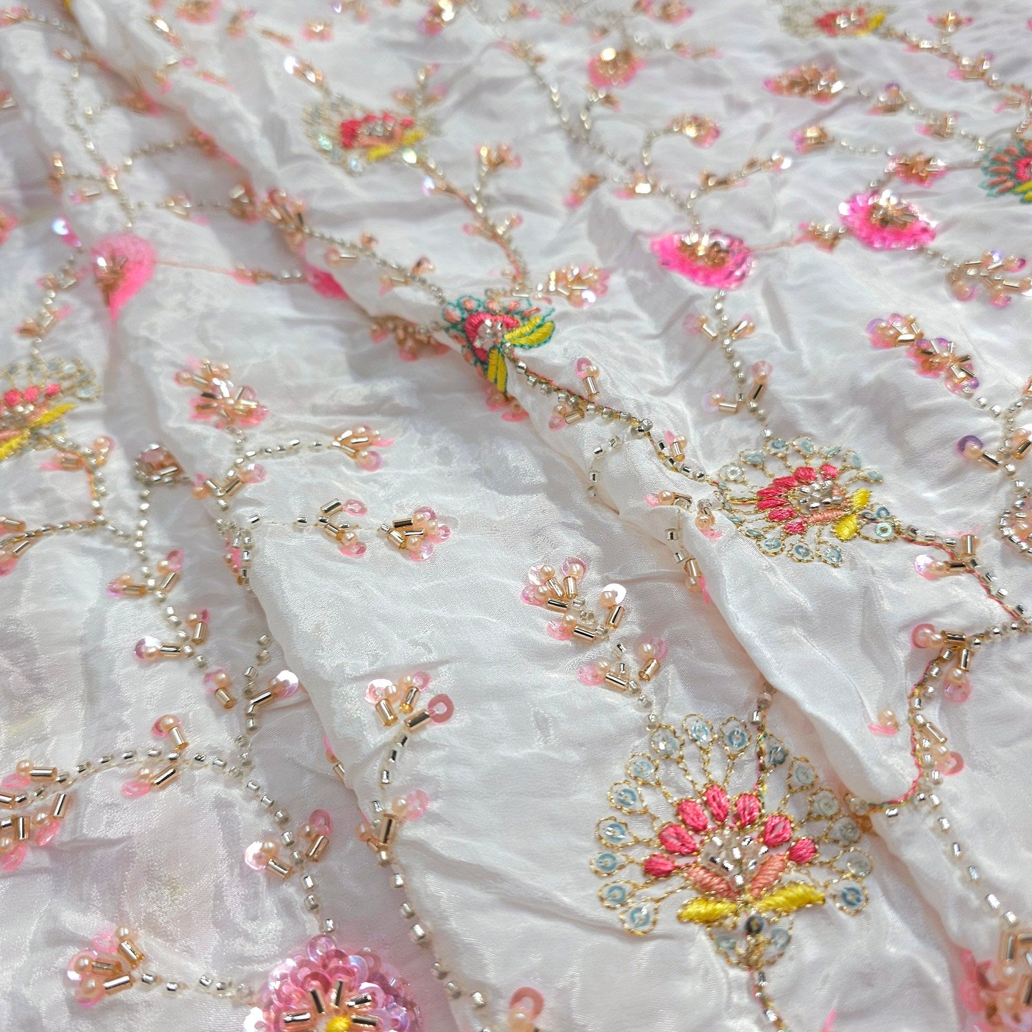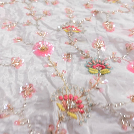 A rich dyeable crepe base with intricate multicolor embroidery, featuring vibrant motifs. The detailed threadwork is beautifully complemented by cutdana, pearlwork outlines and delicate sequin accents, adding depth and festive charm. This luxurious fabric blends traditional artistry with bold colors, making it a statement choice for grand ethnic ensembles.