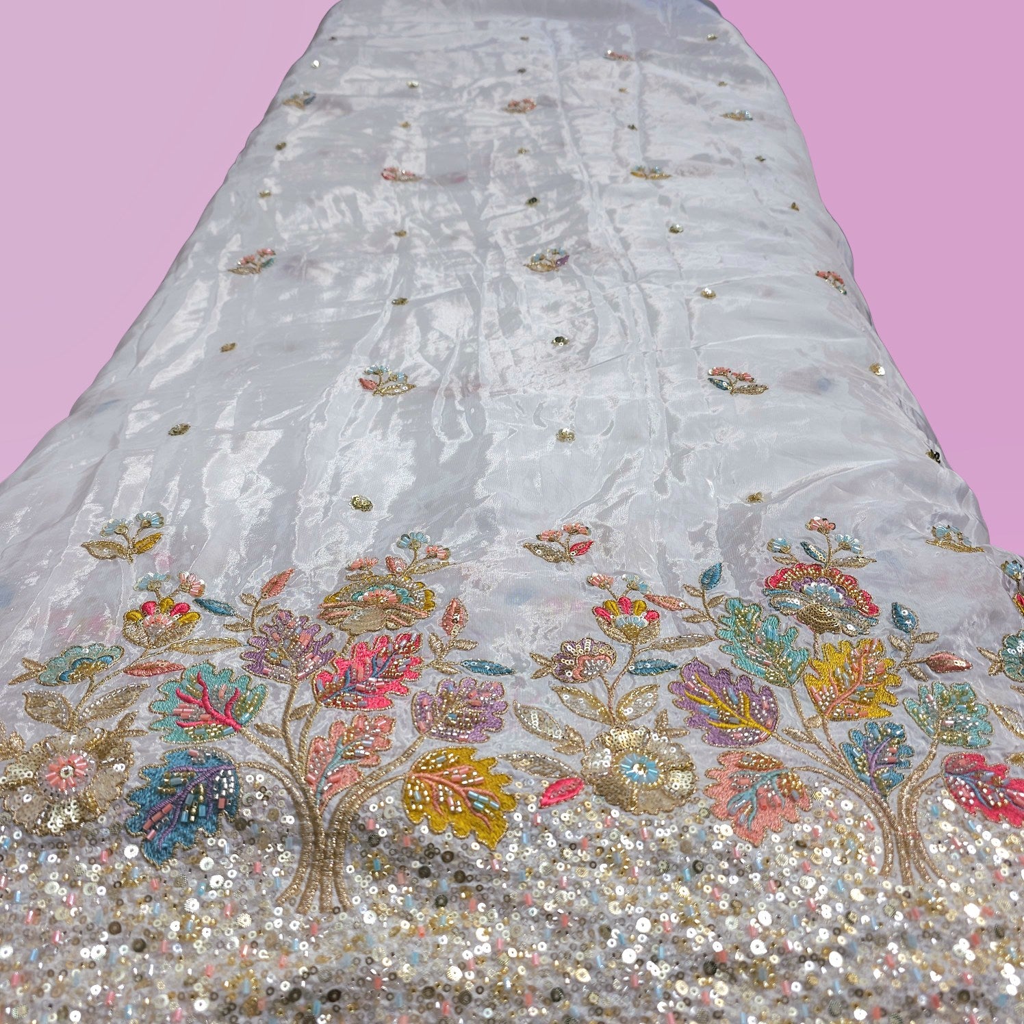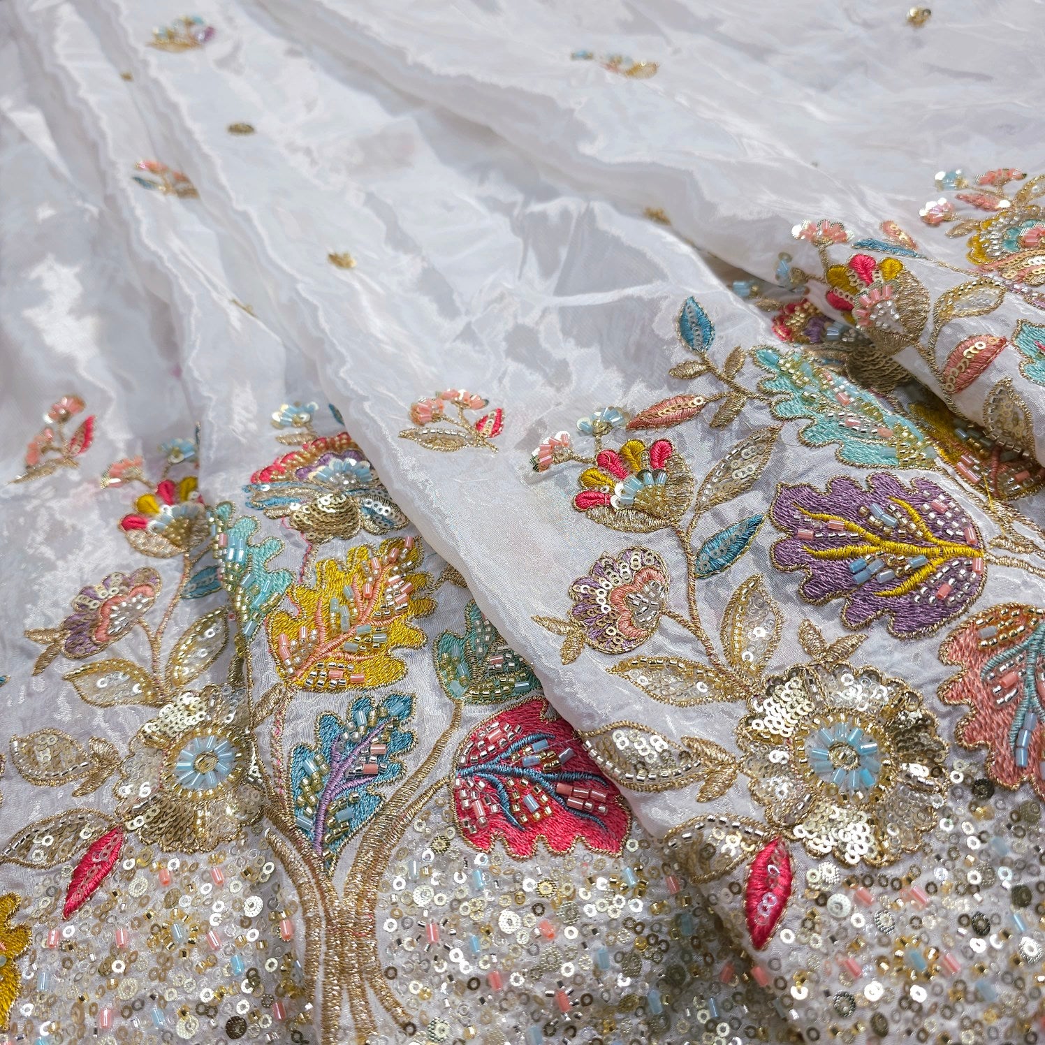 A rich dyeable crepe base with intricate multicolor embroidery, featuring vibrant motifs. The detailed threadwork is beautifully complemented by cutdana, pearlwork outlines and delicate sequin accents, adding depth and festive charm. This luxurious fabric blends traditional artistry with bold colors, making it a statement choice for grand ethnic ensembles.