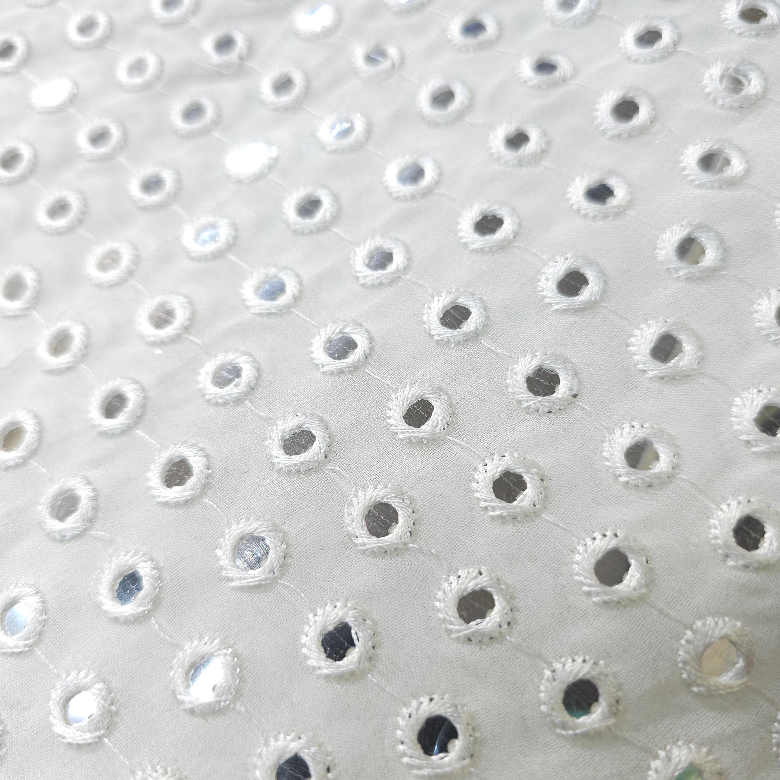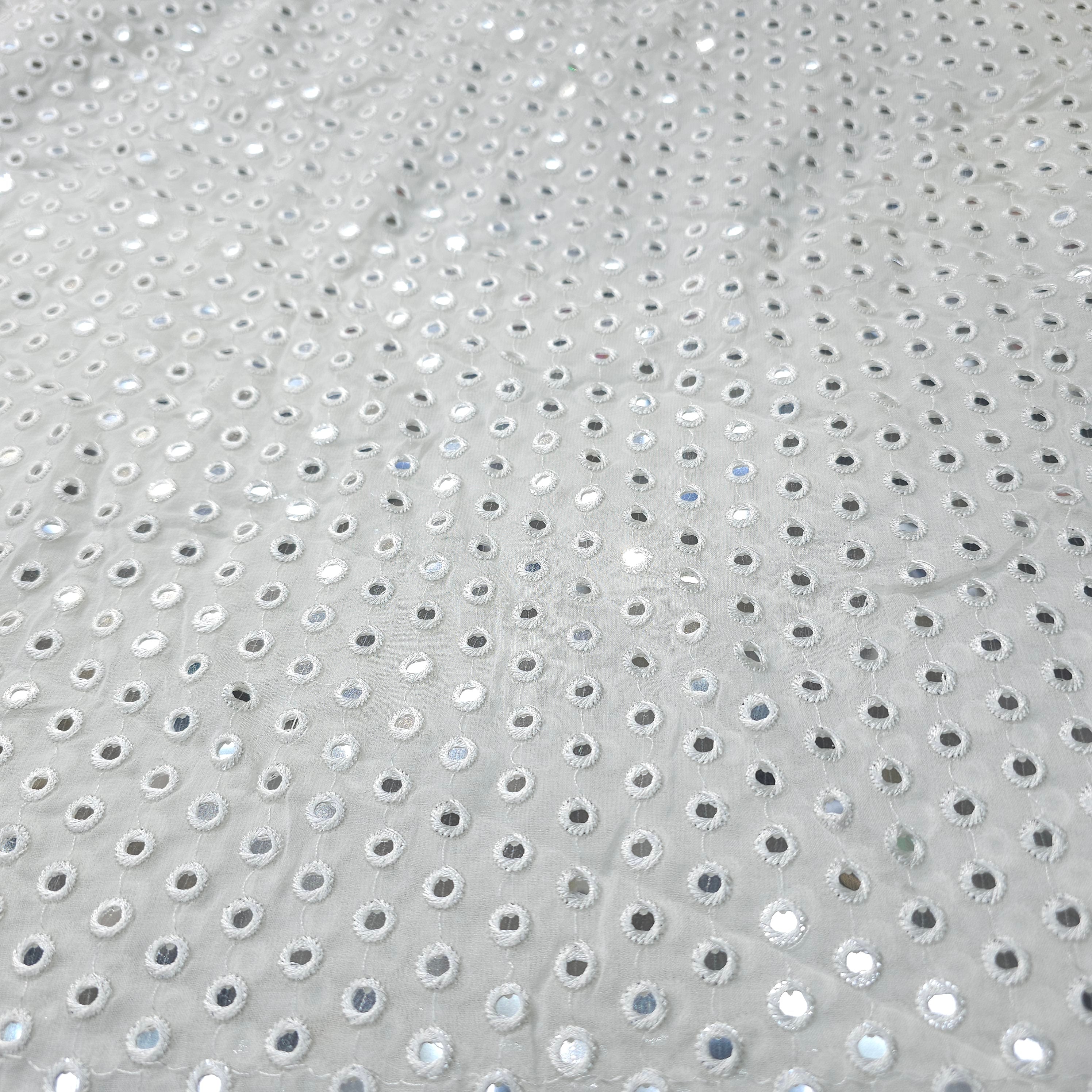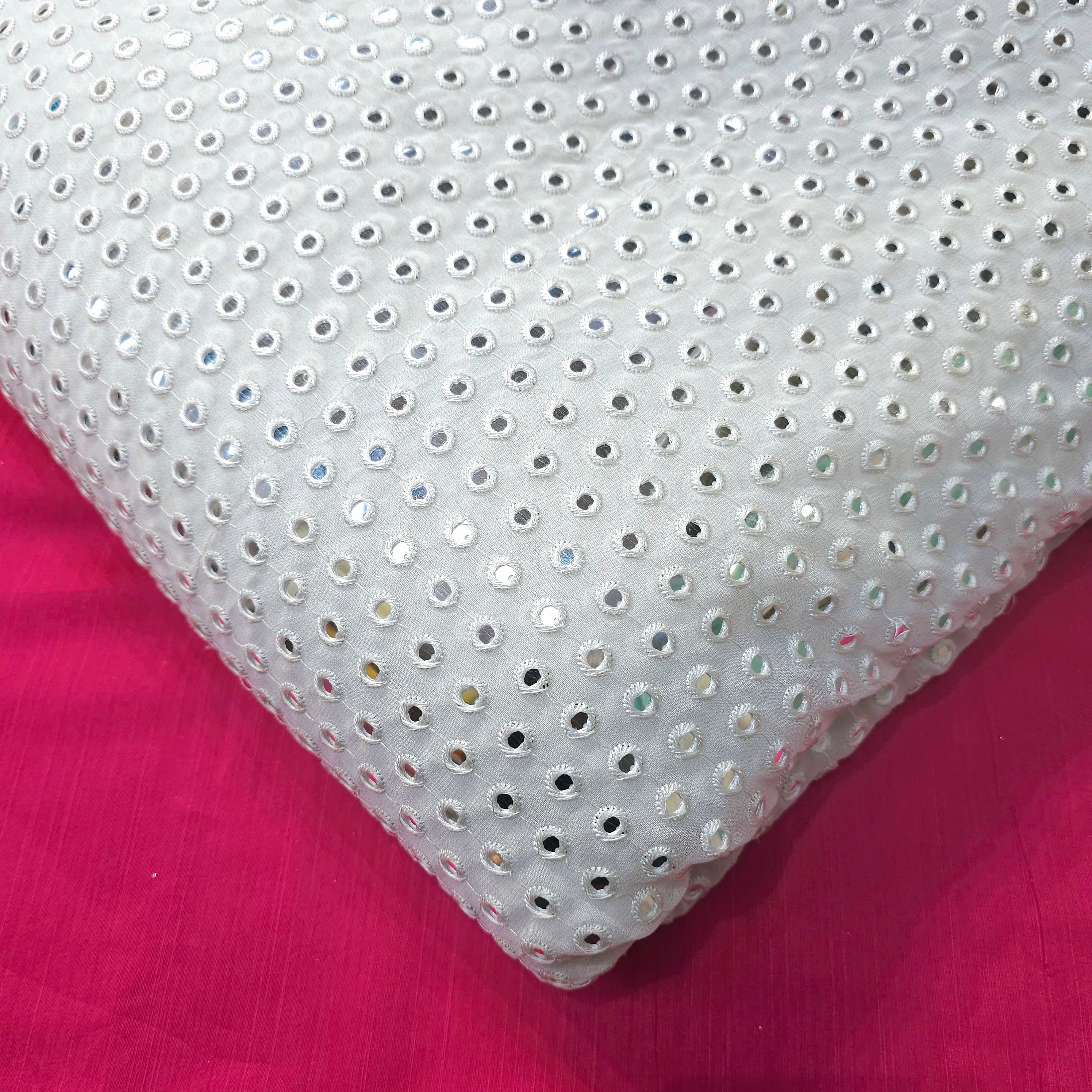 This fabric features mirror work embroidery, where small round mirrors are embedded into the design. The combination of embroidery and mirror embellishments gives the fabric a festive and elegant aesthetic, perfect for traditional or contemporary ethnic wear. Ideal for festive outfits, lehengas, dupattas, and blouses
