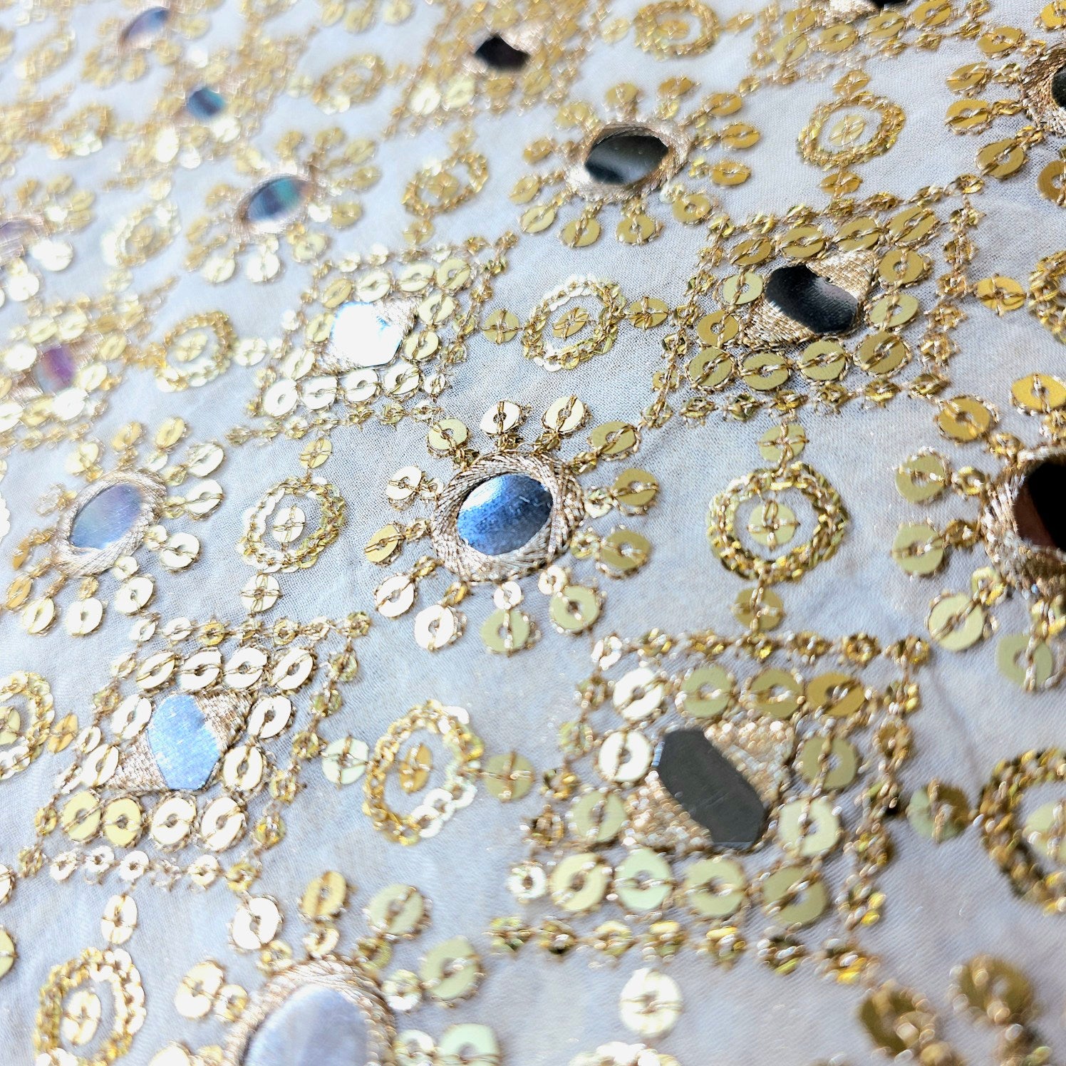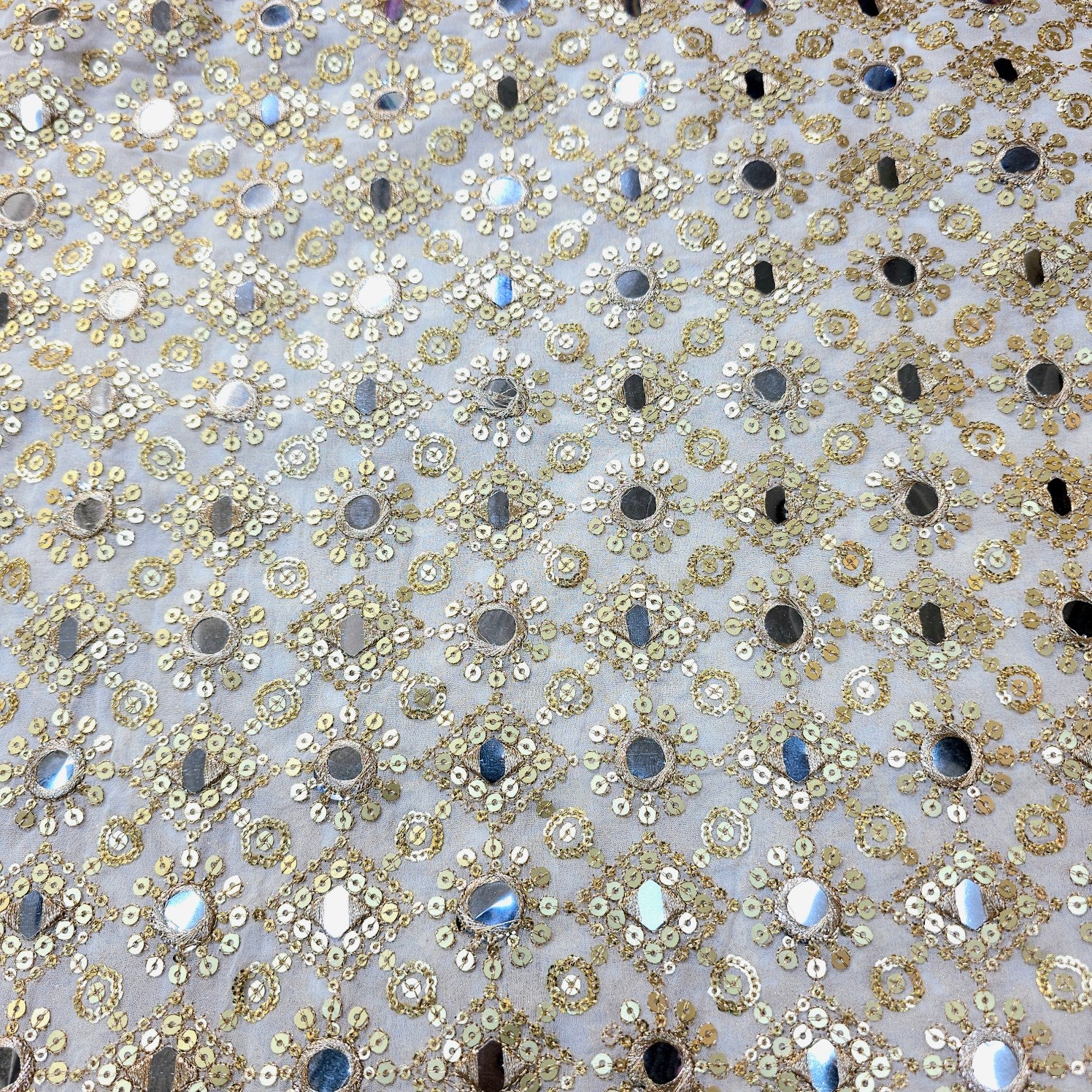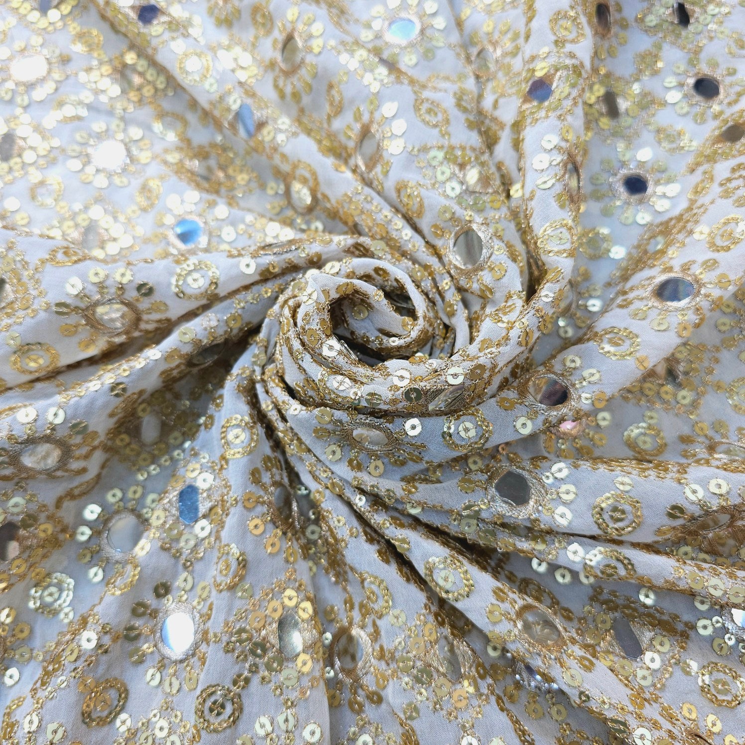 This fabric features mirror work and sequins embroidery, where small round mirrors are embedded into the design. The combination of embroidery and mirror embellishments gives the fabric a festive and elegant aesthetic, perfect for traditional or contemporary ethnic wear. Ideal for festive outfits, lehengas, dupattas, and blouses