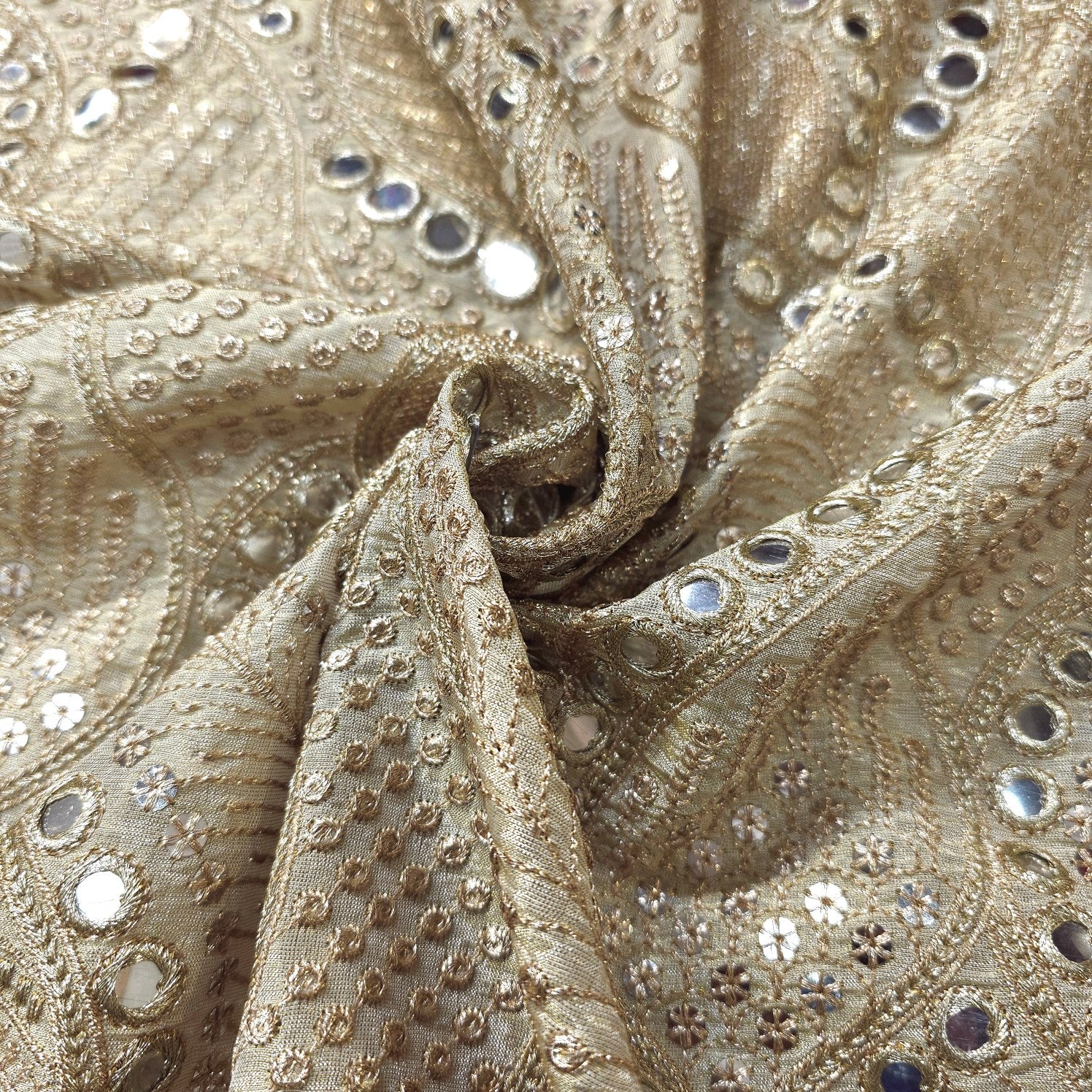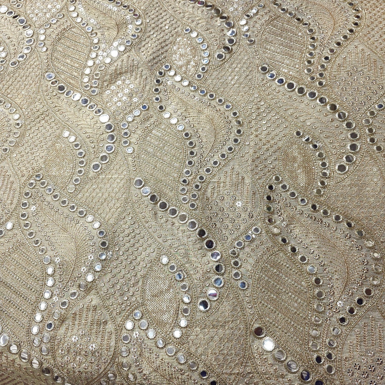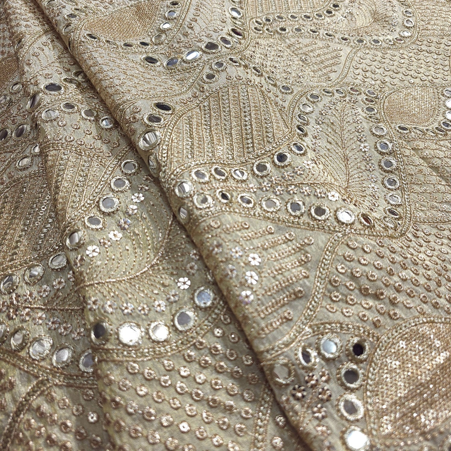 This fabric features mirror work and sequins embroidery, where small round mirrors are embedded into the design. The combination of embroidery and mirror embellishments gives the fabric a festive and elegant aesthetic, perfect for traditional or contemporary ethnic wear. Ideal for festive outfits, lehengas, dupattas, and blouses