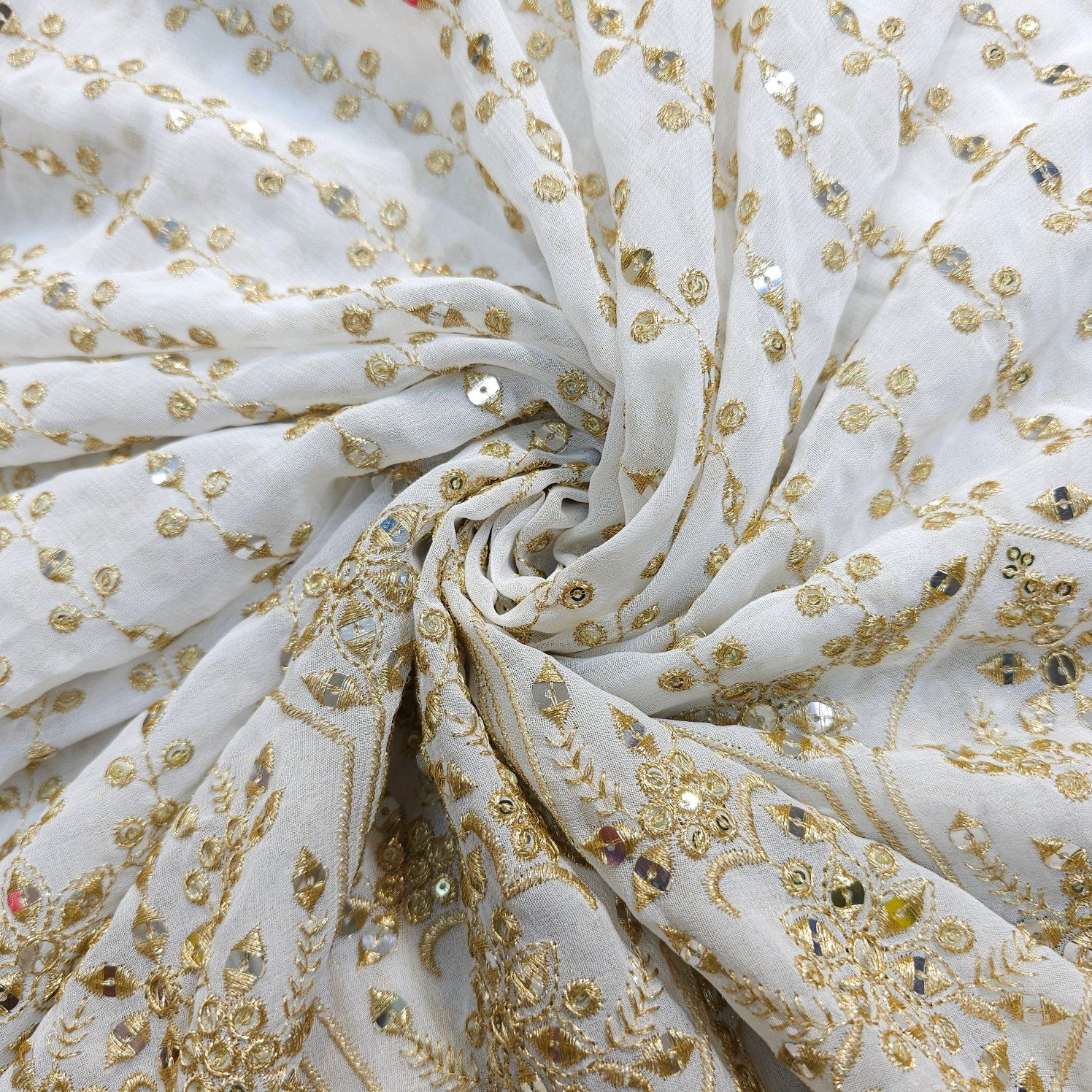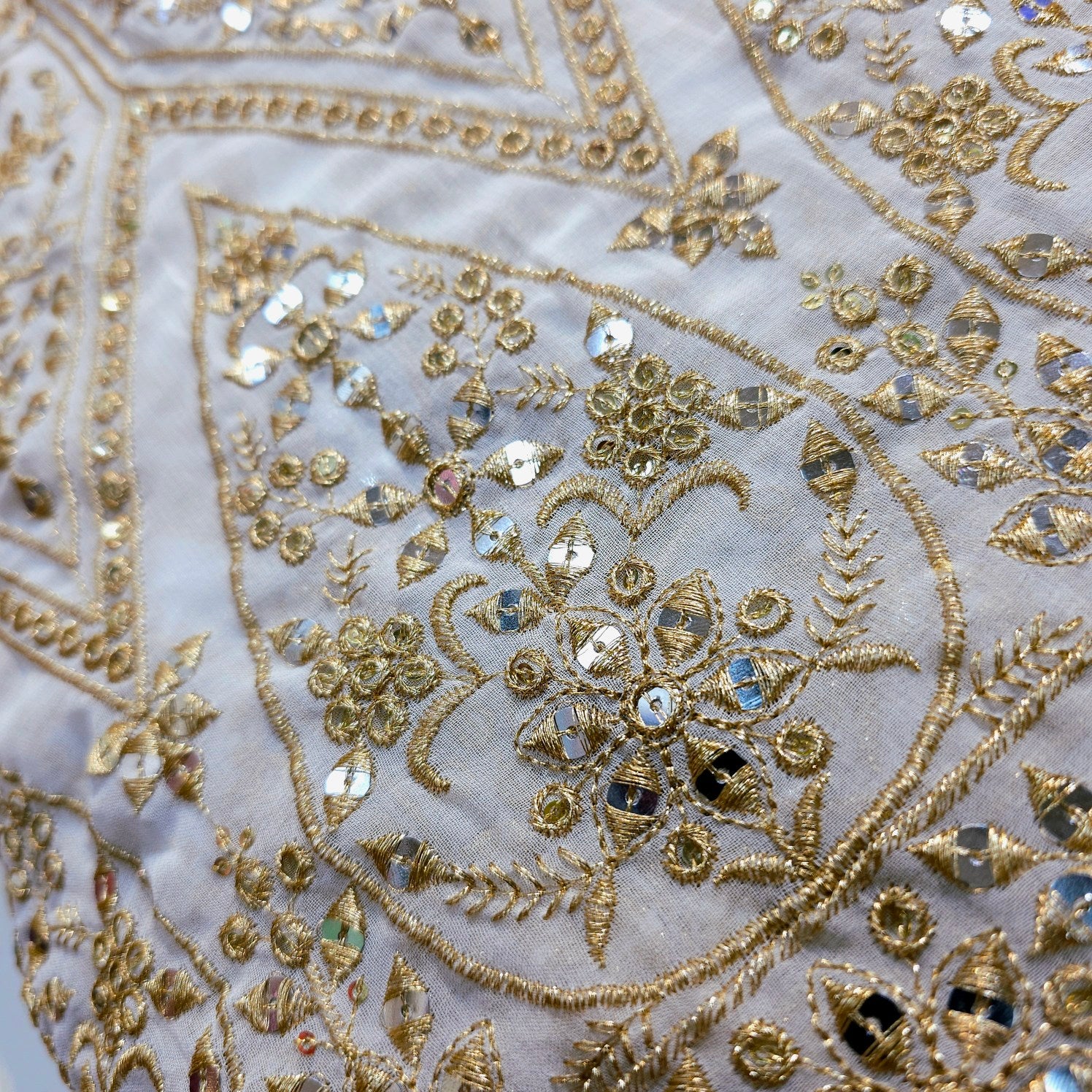 This fabric features mirror work embroidery, where small round mirrors are embedded into the design. The combination of embroidery and mirror embellishments gives the fabric a festive and elegant aesthetic, perfect for traditional or contemporary ethnic wear. Ideal for festive outfits, lehengas, dupattas, and blouses