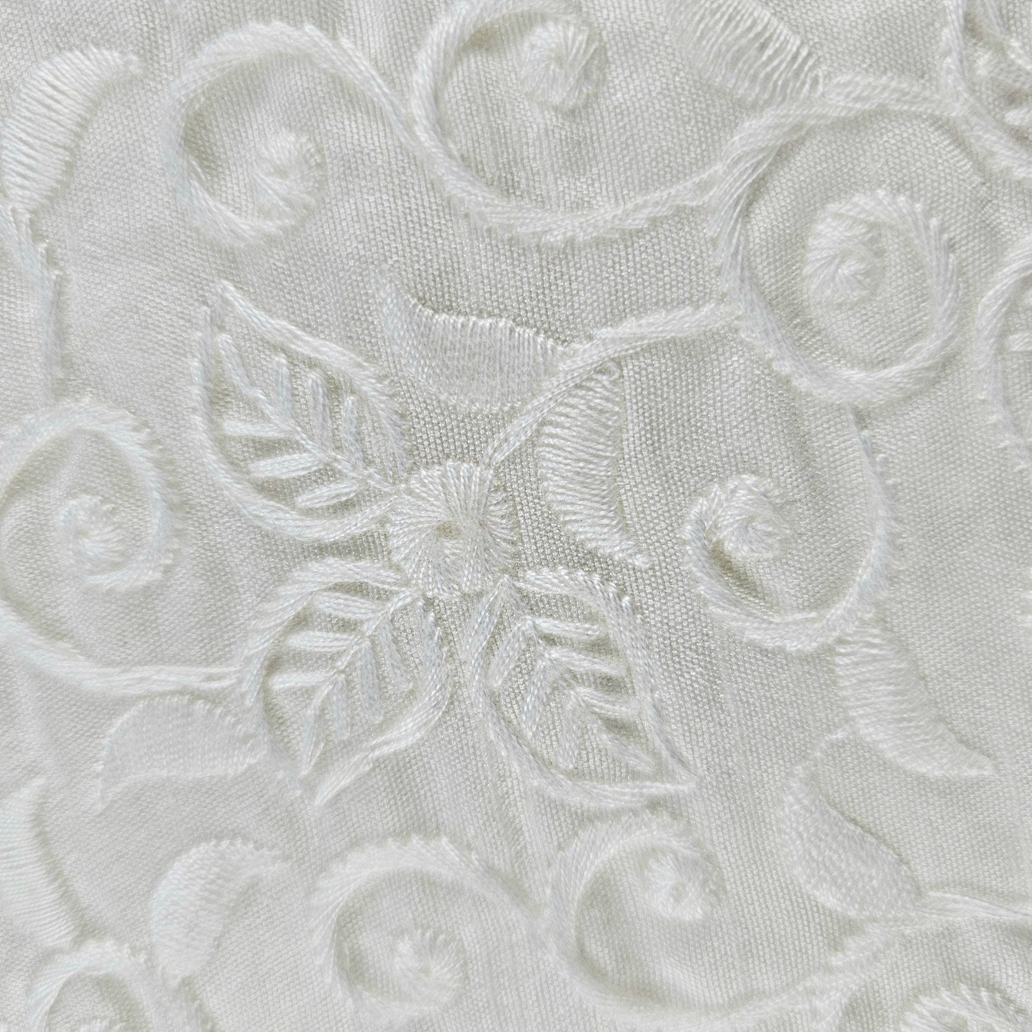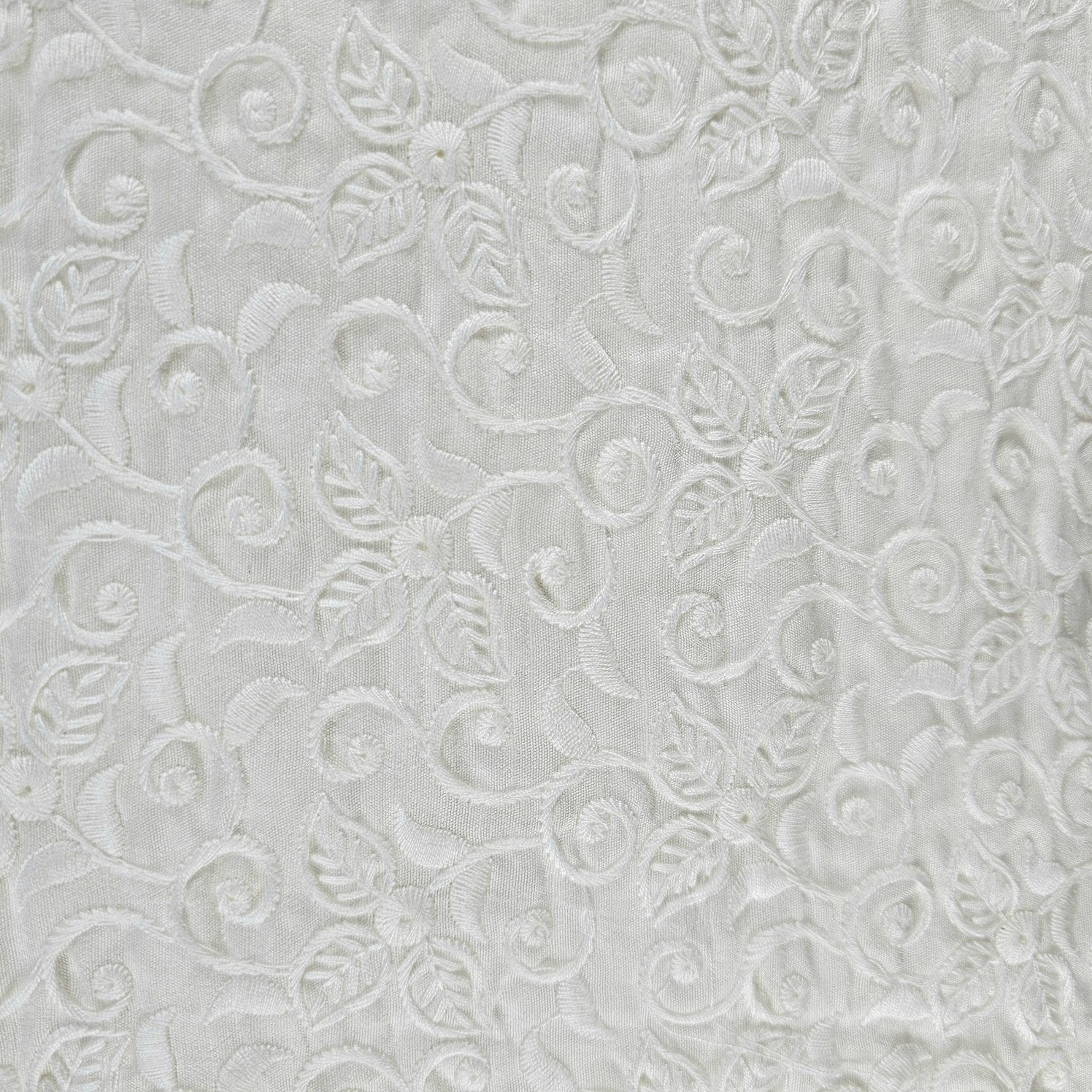 This fabric features a delicate white-on-white embroidery with a combination of floral vines, paisley motifs, and leaves scattered across a soft base. The embroidery has a subtle sheen, enhancing the elegant look of the fabric. The slightly sheer background contrasts beautifully with the dense embroidery work, making it ideal for layering or elegant garments. Suitable for ethnic wear, dresses, dupattas, and blouses