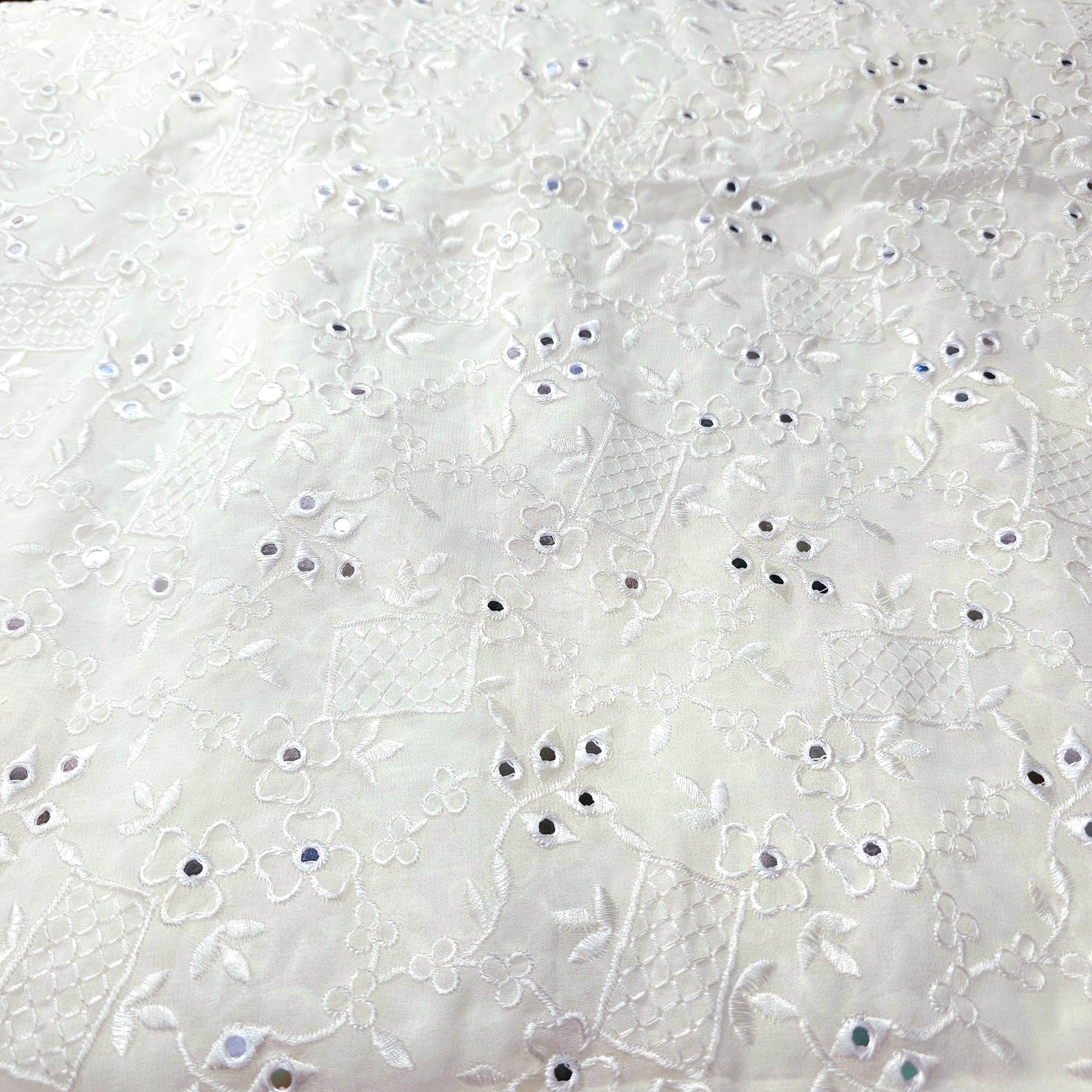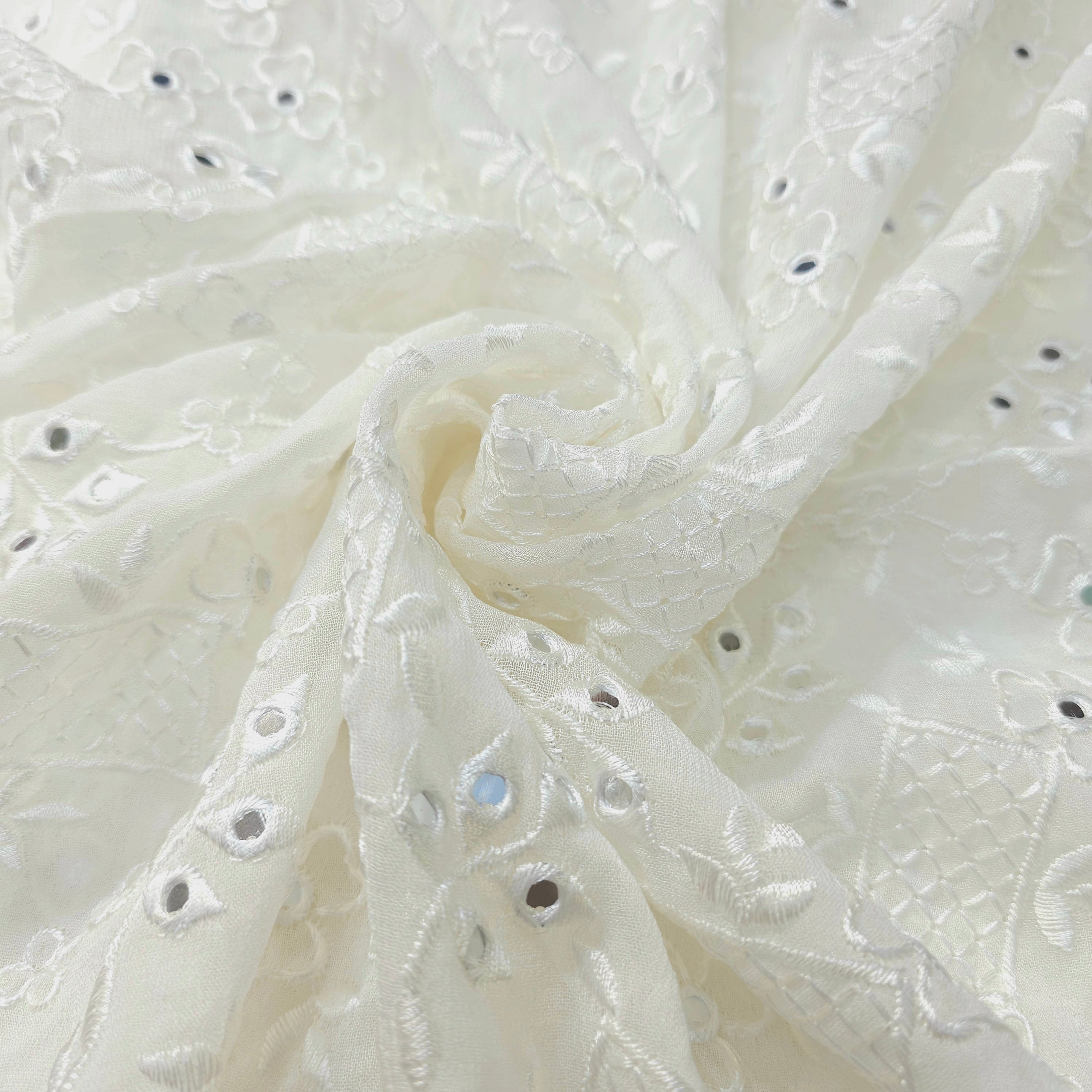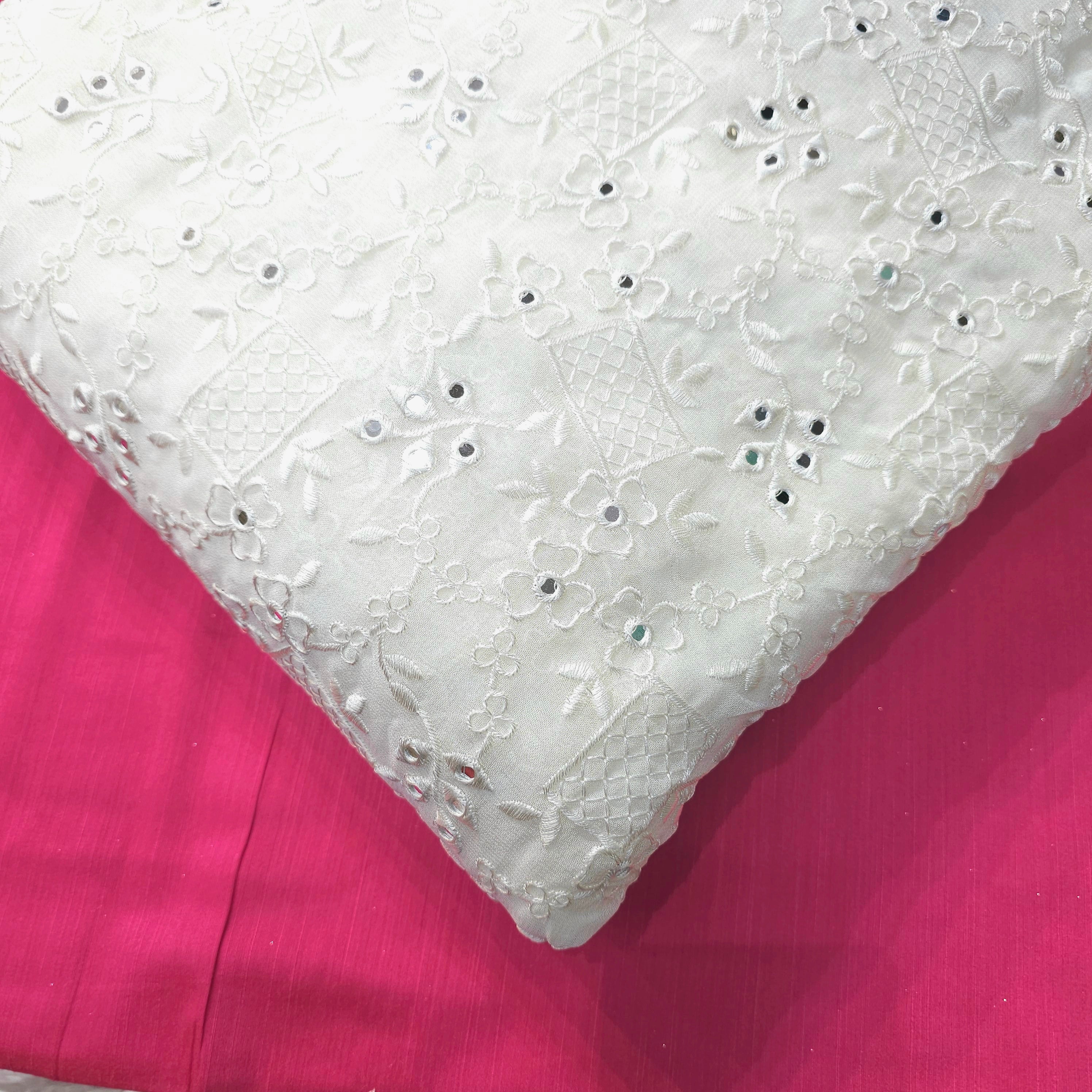 This fabric features mirror work embroidery, where small mirrors are embedded into the design. The combination of embroidery and mirror embellishments gives the fabric a festive and elegant aesthetic, perfect for traditional or contemporary ethnic wear. Ideal for festive outfits, lehengas, dupattas, and blouses
