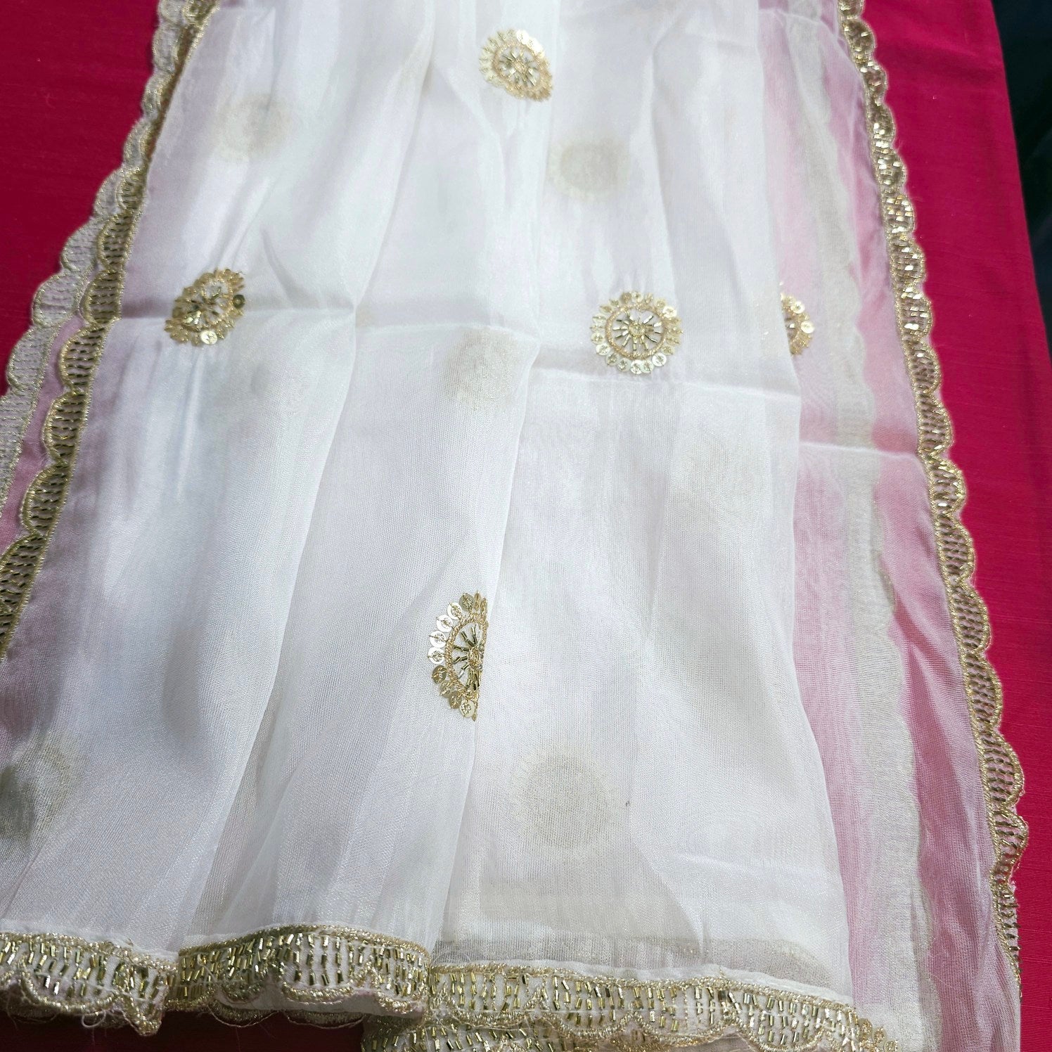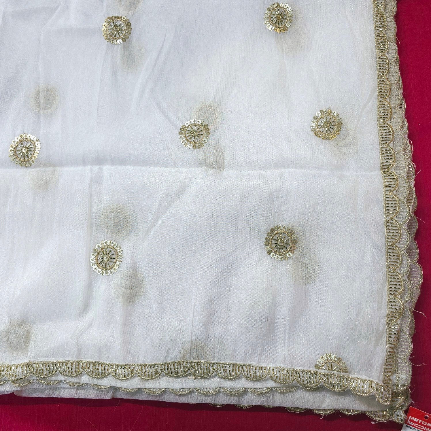 Premium Dyeable organza dupatta adorned with delicate floral sequin embroidery. Lightweight and sheer with an elegant border, perfect for festive and bridal ensembles.