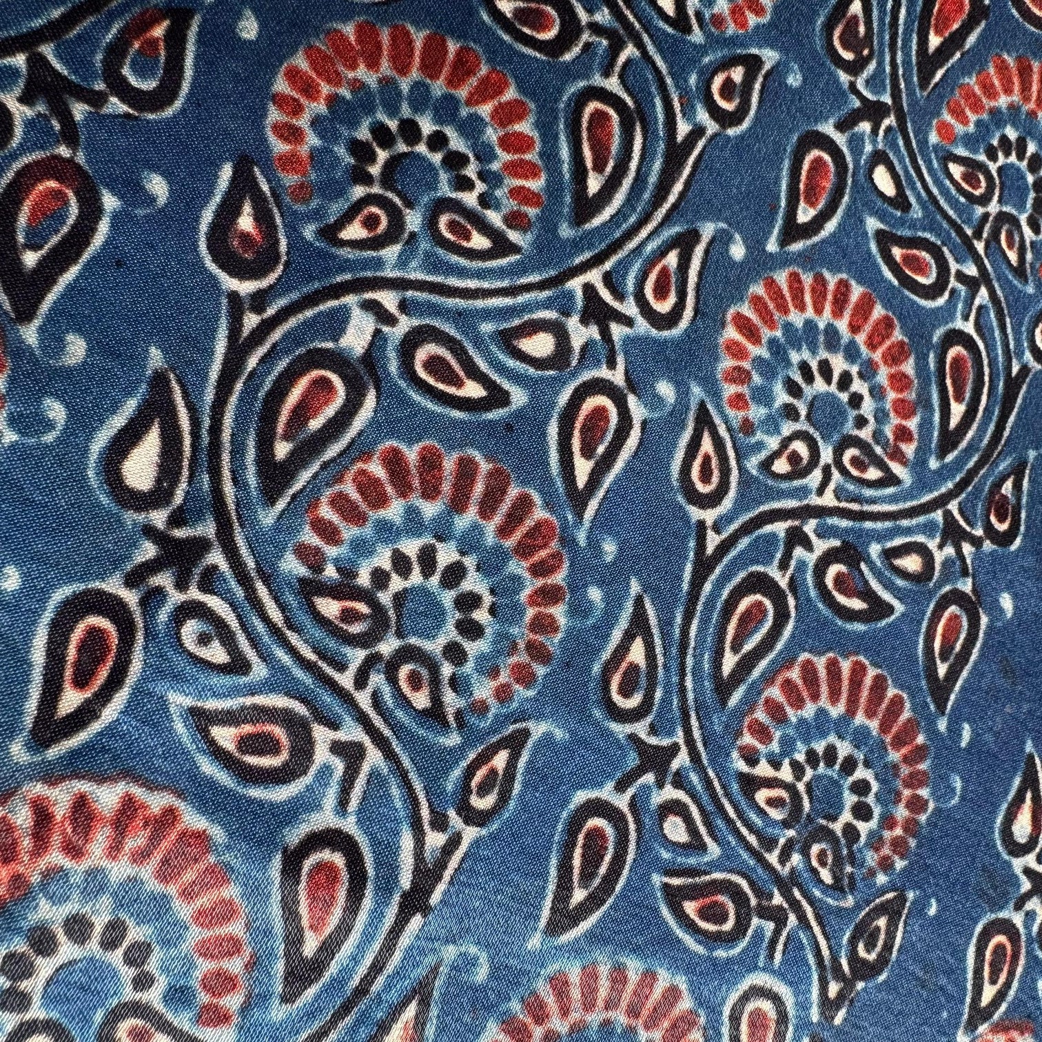 Traditional Ajrakh handblock print on Pure Modal fabric featuring an intricate paisley and floral pattern in rich shades of black and maroon on a deep indigo blue base. The soft and breathable texture makes it a versatile choice for everyday ethnic wear, combining timeless craftsmanship with comfort. Ideal for kurtis, blouses, shirts, and casual ethnic ensembles.