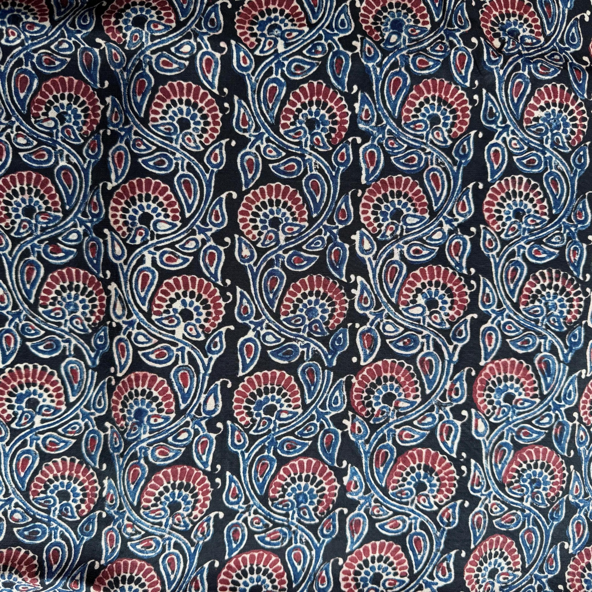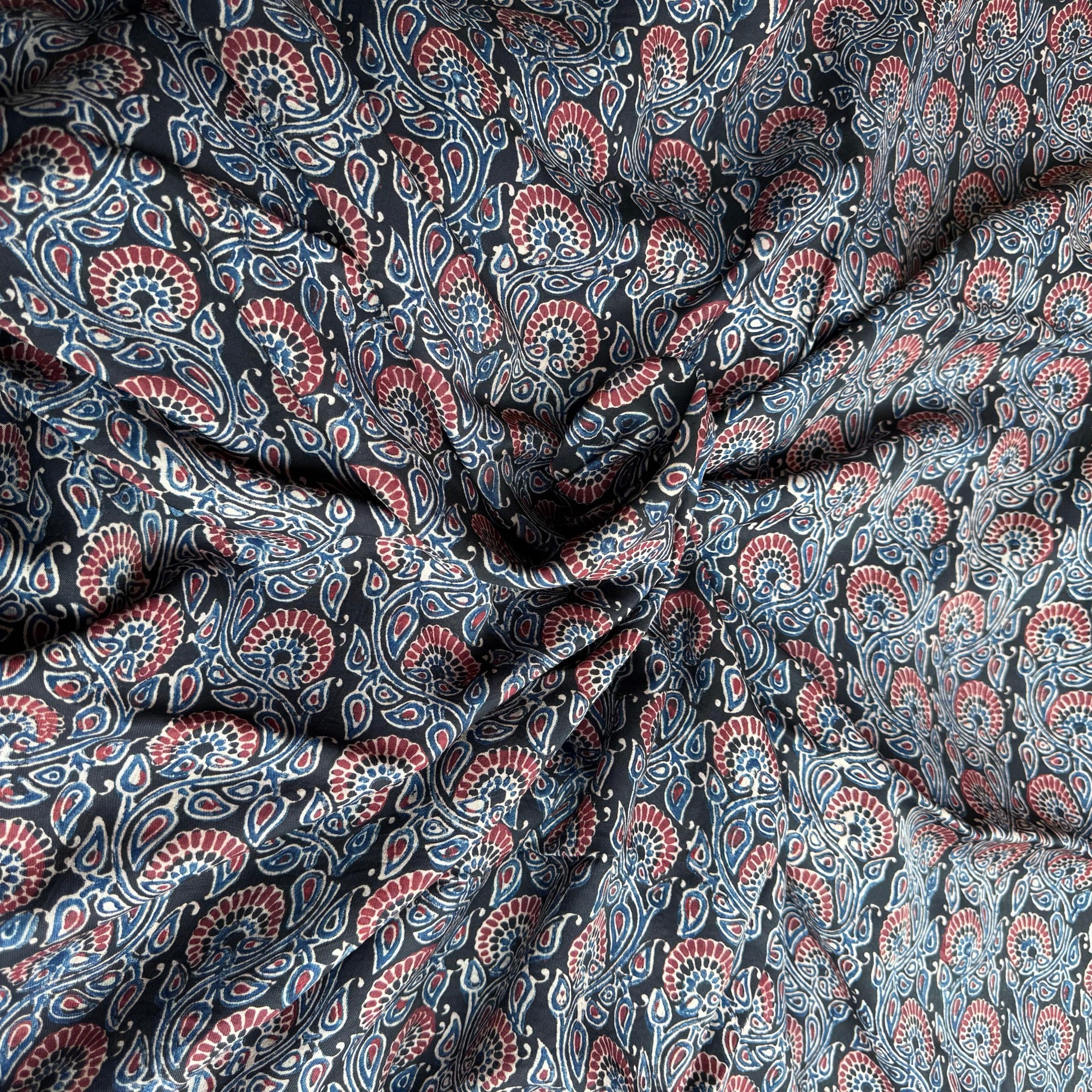 Traditional Ajrakh handblock print on Pure Modal fabric featuring an intricate paisley and floral pattern in rich shades of indigo blue and maroon on a deep black base. The soft and breathable texture makes it a versatile choice for everyday ethnic wear, combining timeless craftsmanship with comfort. Ideal for kurtis, blouses, shirts, and casual ethnic wear.