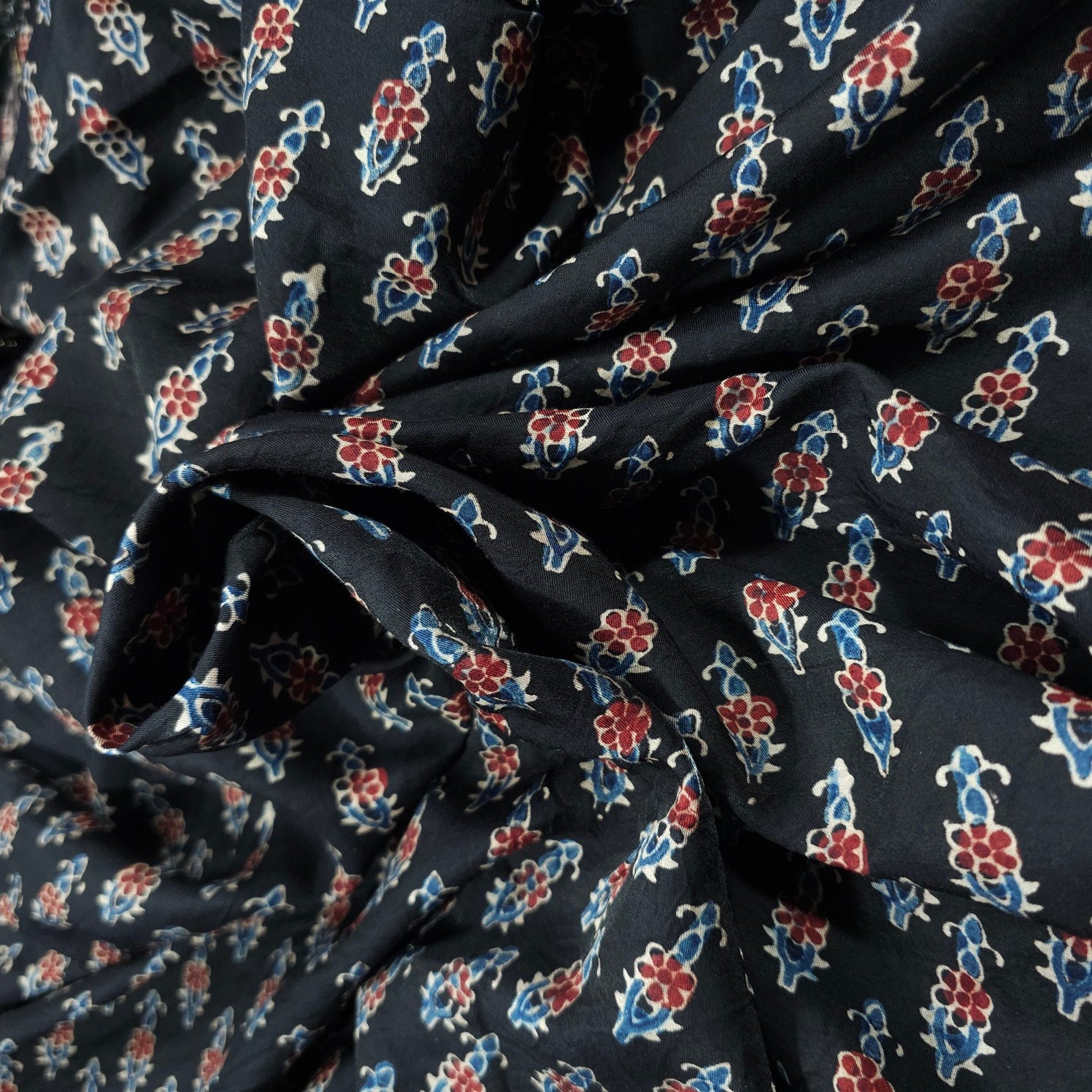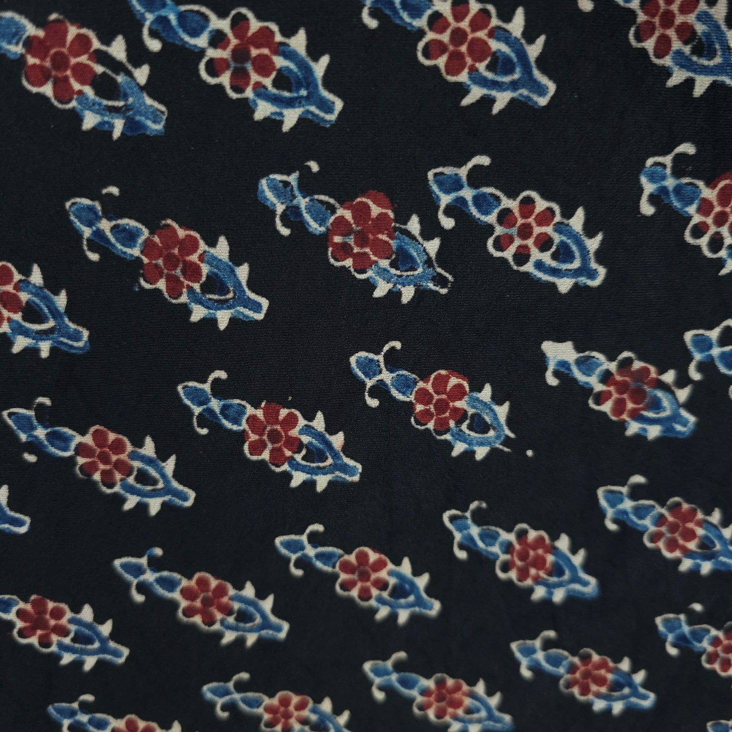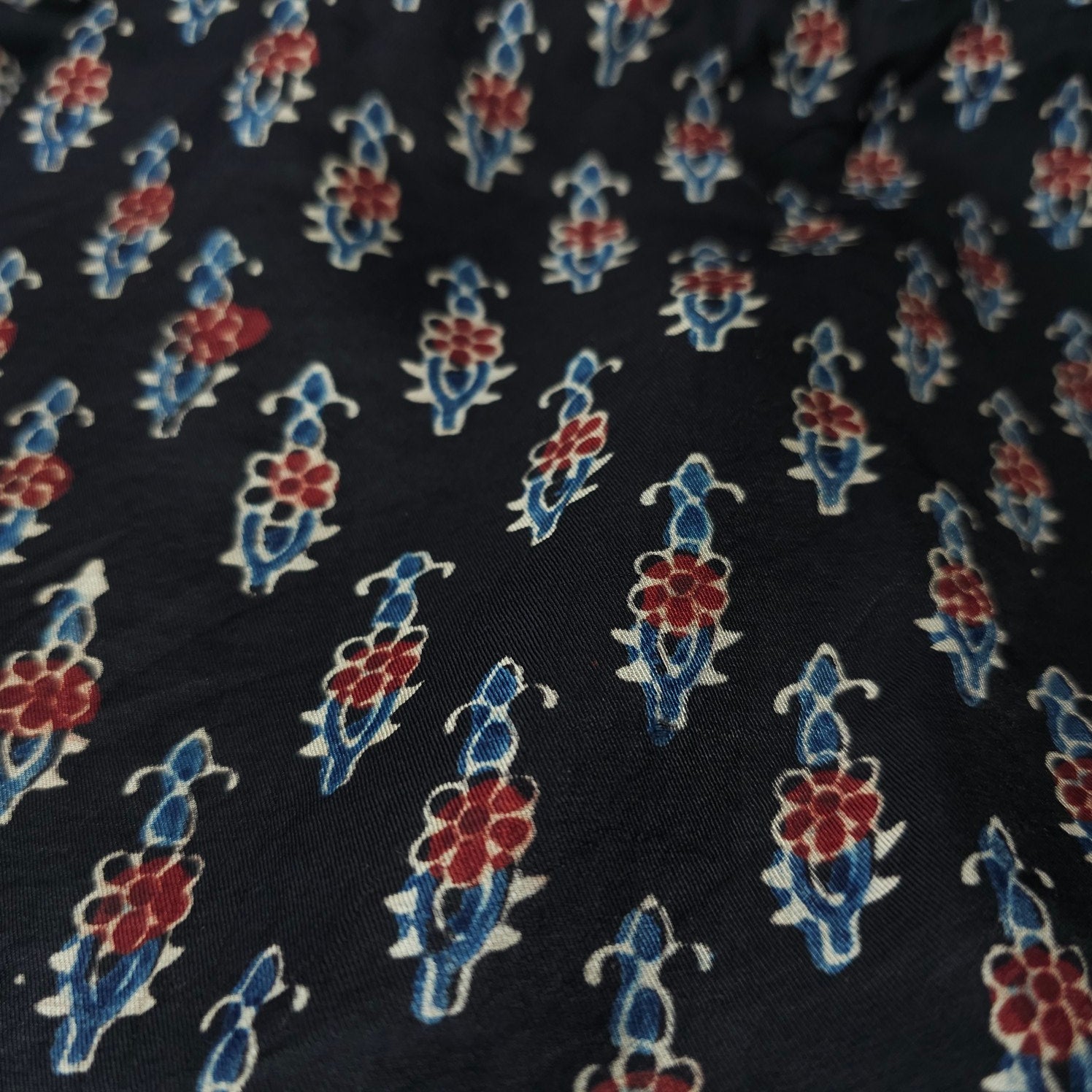 Traditional Ajrakh handblock print on Pure Modal fabric featuring an intricate paisley and floral pattern in rich shades of indigo blue and maroon on a deep black base. The soft and breathable texture makes it a versatile choice for everyday ethnic wear, combining timeless craftsmanship with comfort. Ideal for kurtis, blouses, shirts, and casual ethnic ensembles.