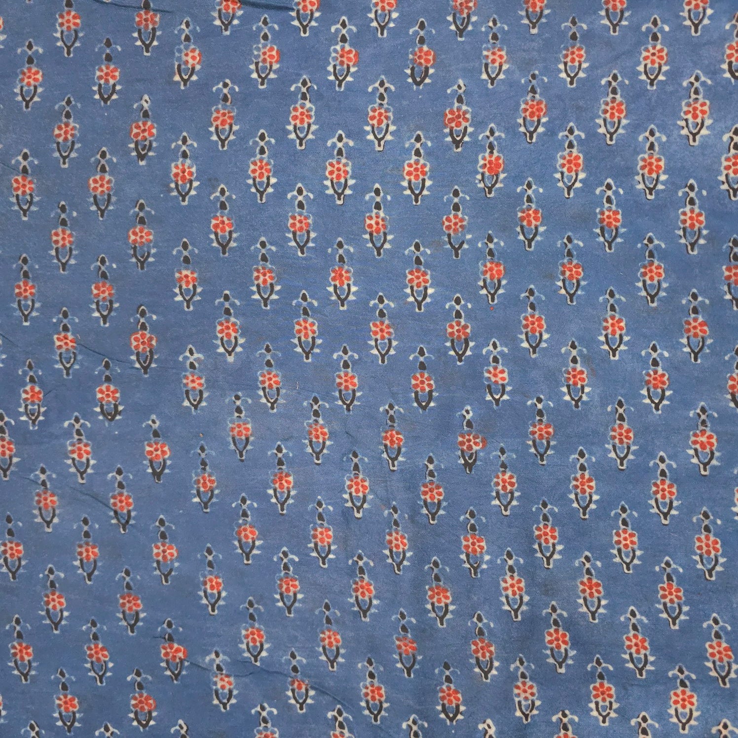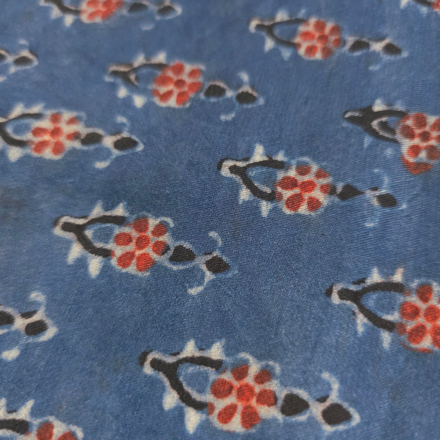 Traditional Ajrakh handblock print on Pure Modal fabric featuring an intricate paisley and floral pattern in rich shades of black and maroon on a deep Indigo Blue base. The soft and breathable texture makes it a versatile choice for everyday ethnic wear, combining timeless craftsmanship with comfort. Ideal for kurtis, blouses, shirts, and casual ethnic ensembles.