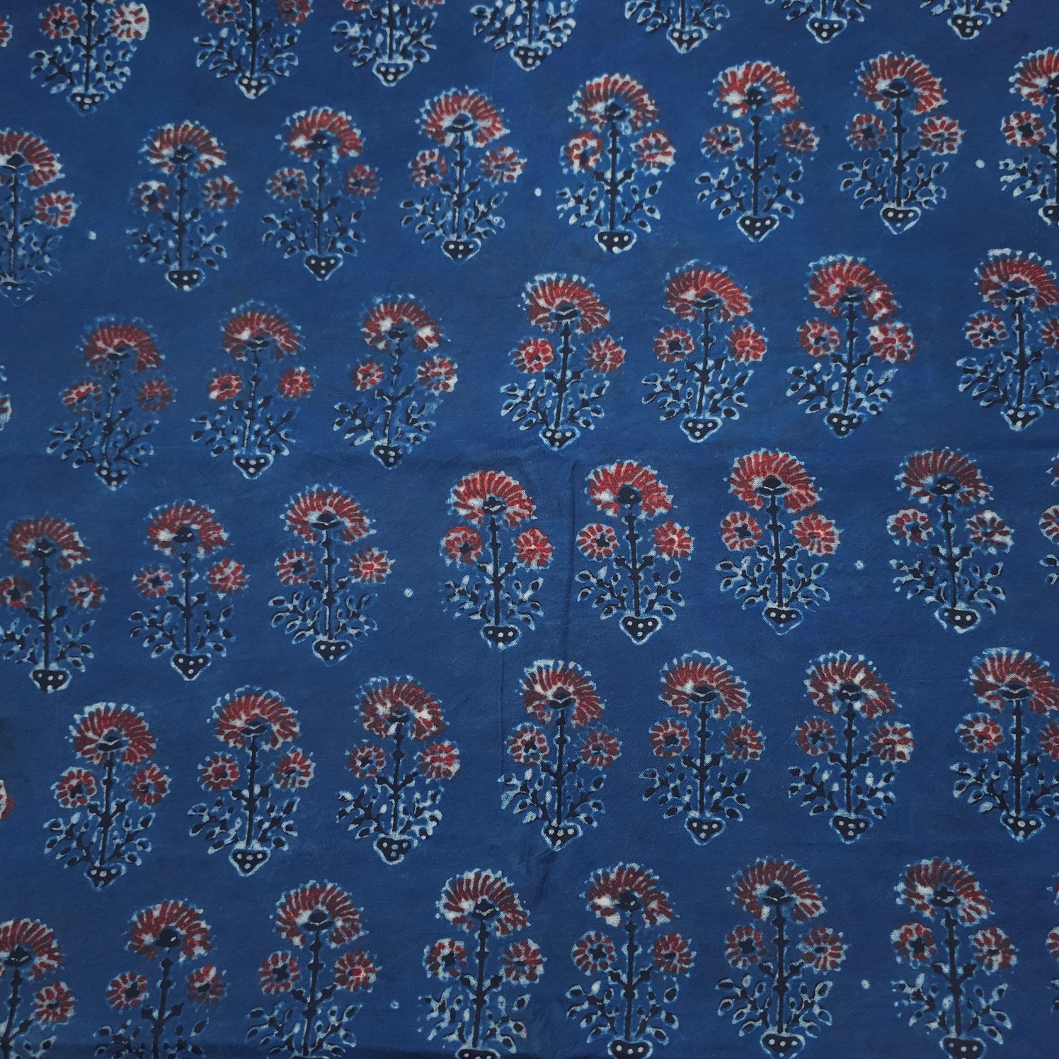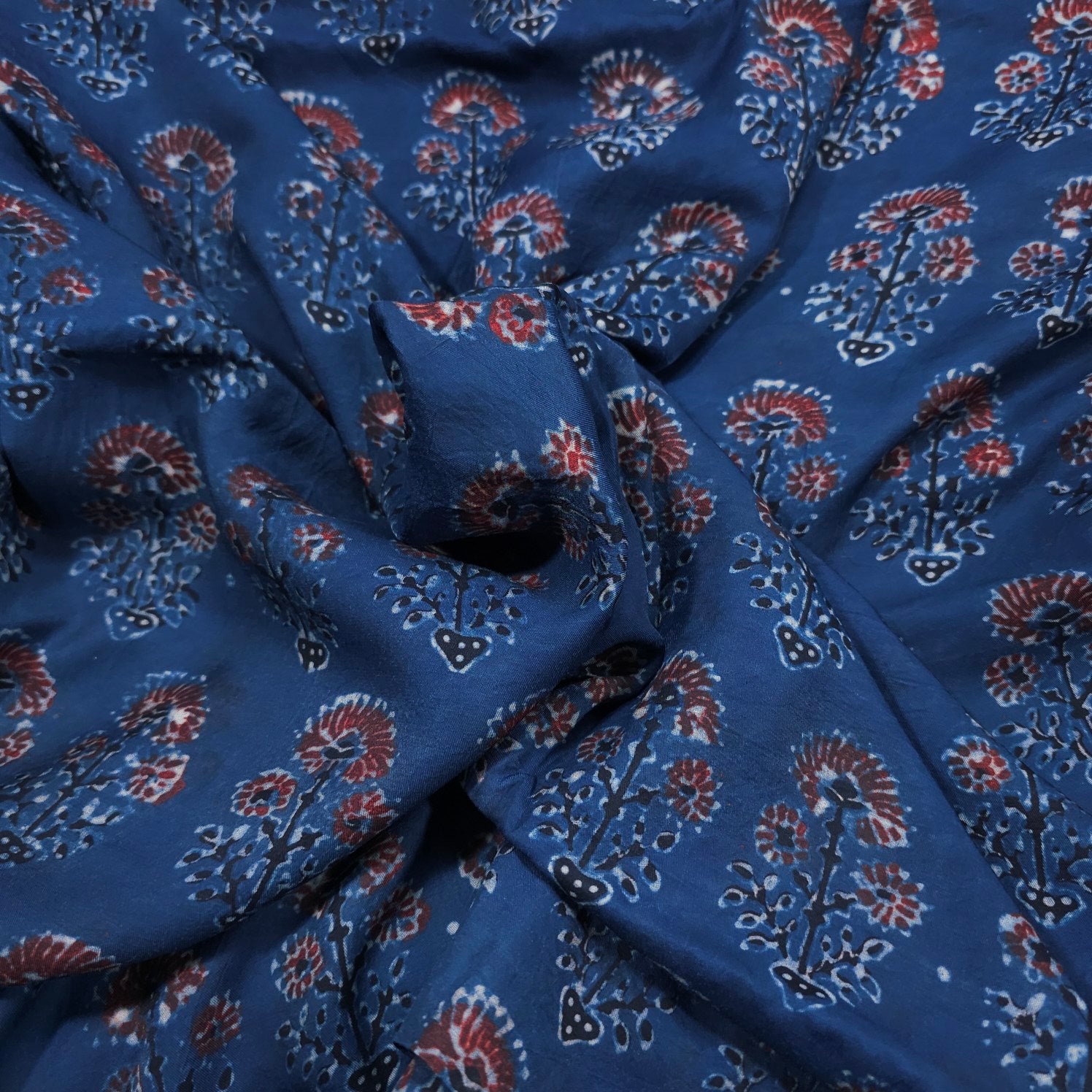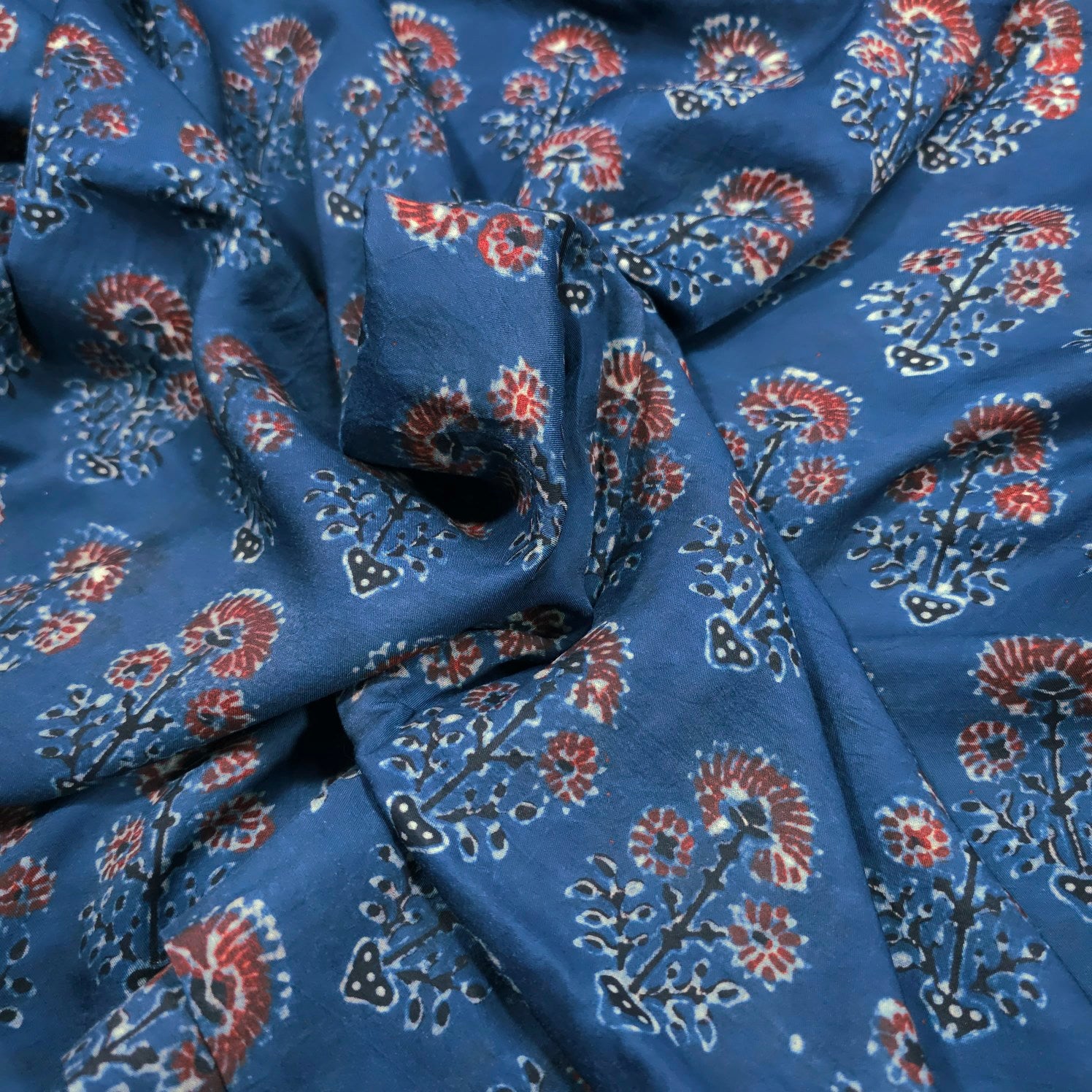 Traditional Ajrakh handblock print on Pure Modal fabric featuring an intricate floral pattern in rich shades of maroon and black on a deep indigo blue base. The soft and breathable texture makes it a versatile choice for everyday ethnic wear, combining timeless craftsmanship with comfort. Ideal for kurtis, blouses, shirts, and casual ethnic ensembles.