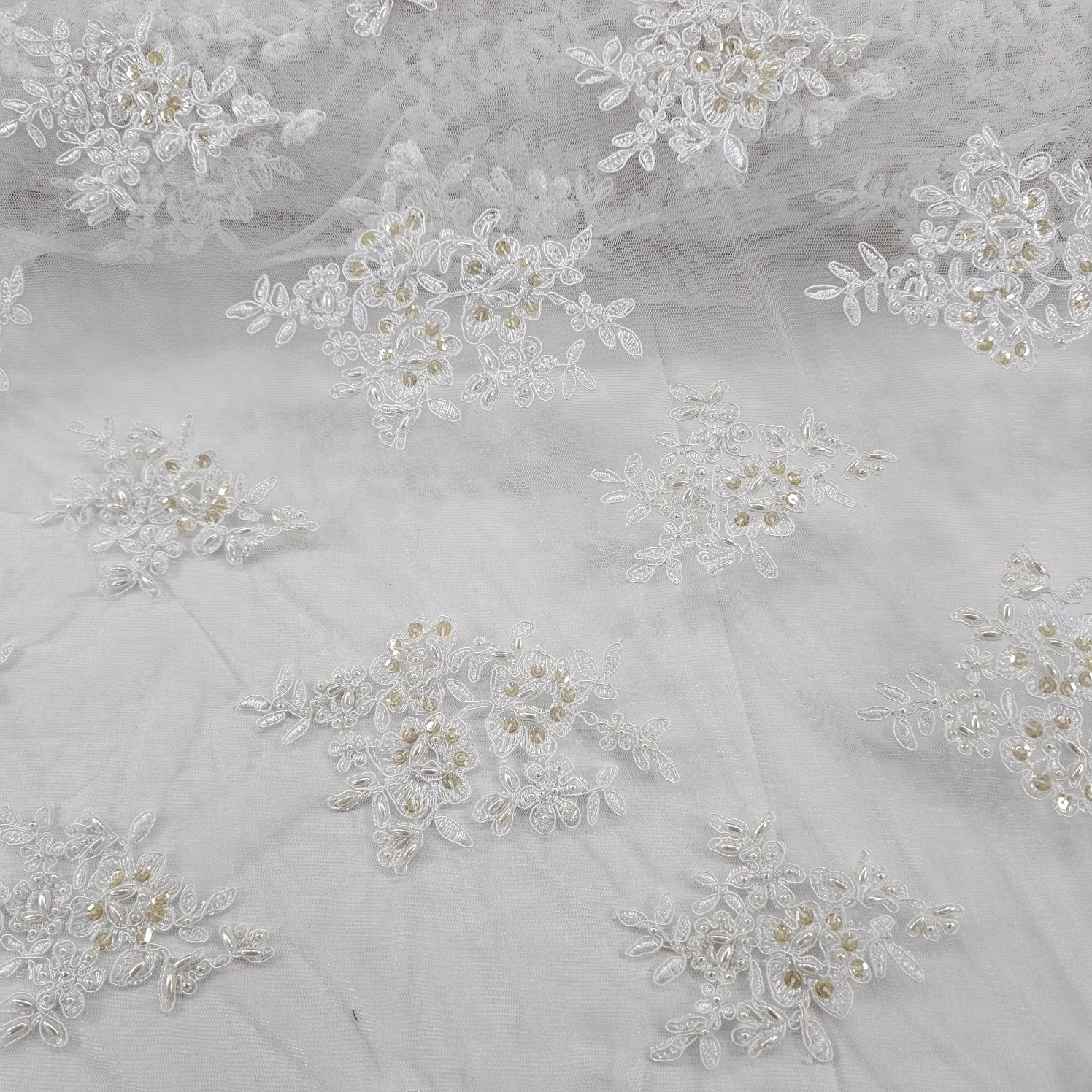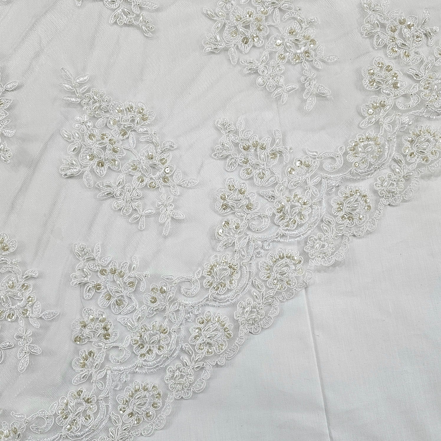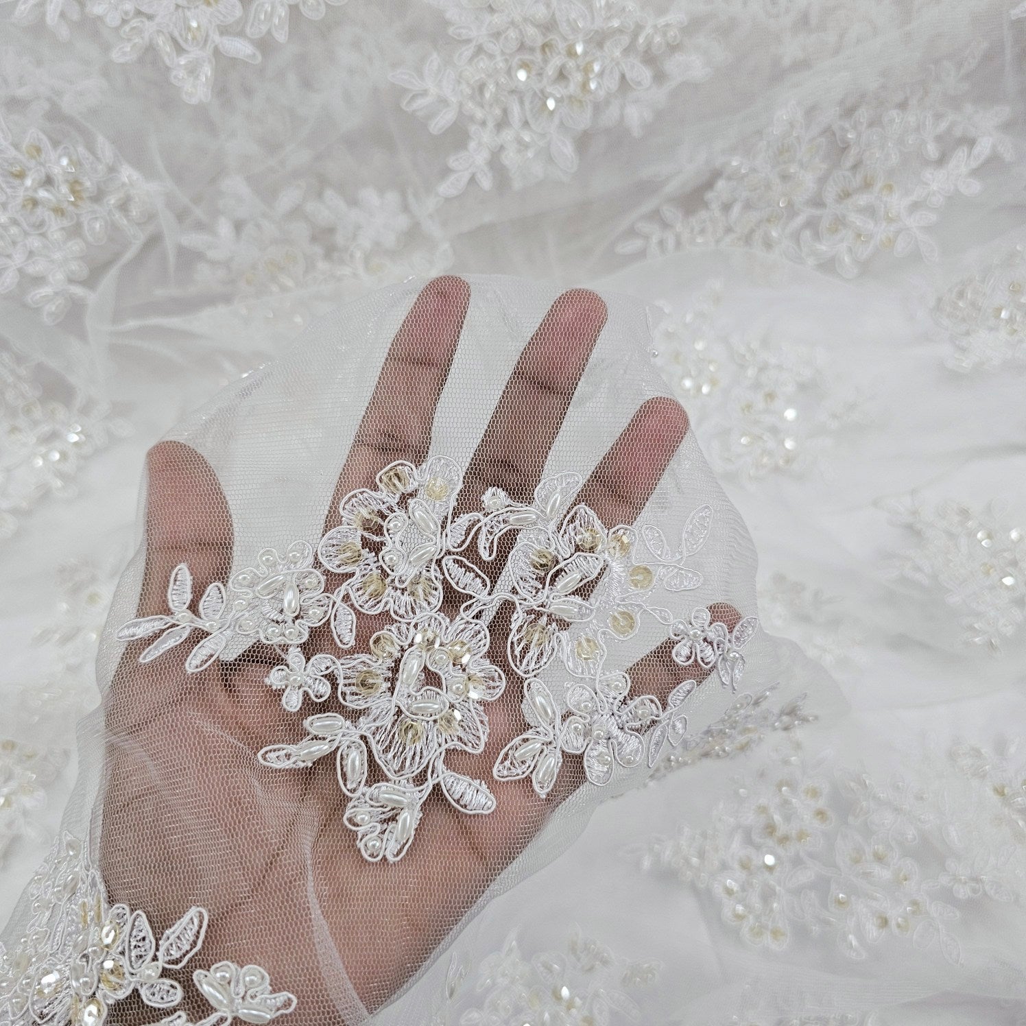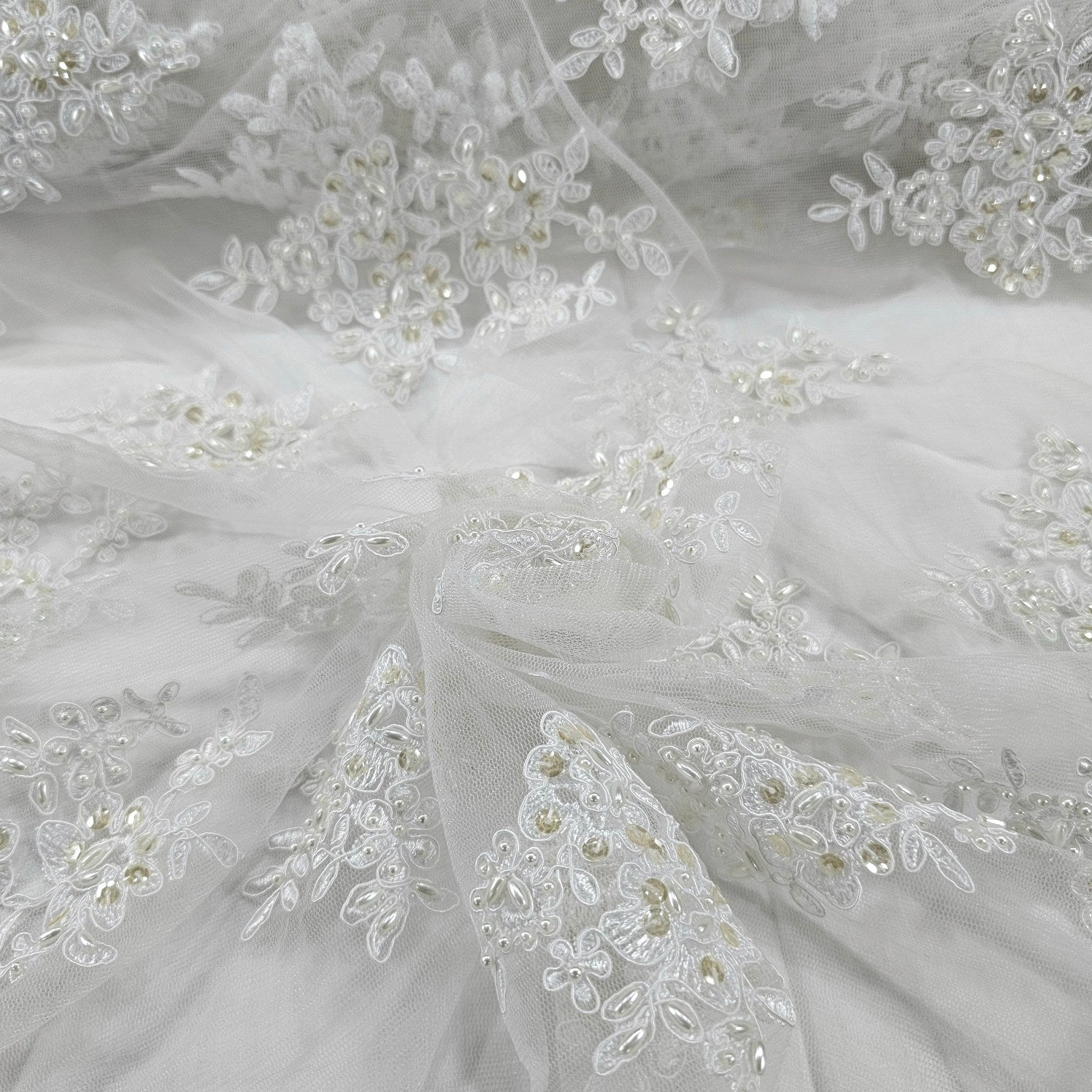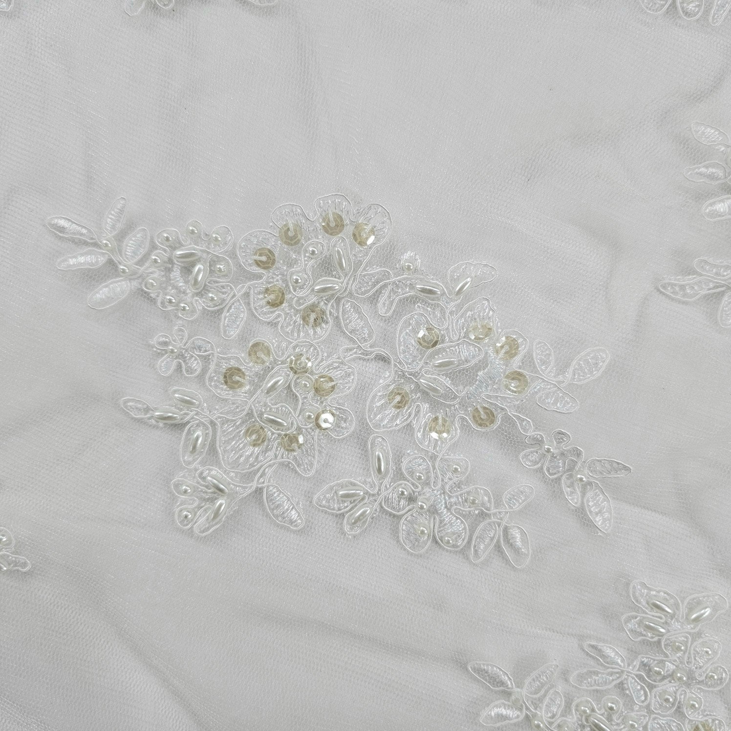 This white net fabric showcases floral layout crafted with fine white thread embroidery, accented with ivory pearls and soft sequin touches. The design blooms across a translucent lacey net base, adding depth and texture while retaining a light and airy feel. Ideal for elegant bridal gowns, veils, lehenga, skirts it brings a luxurious shimmer and handcrafted charm to any outfit.