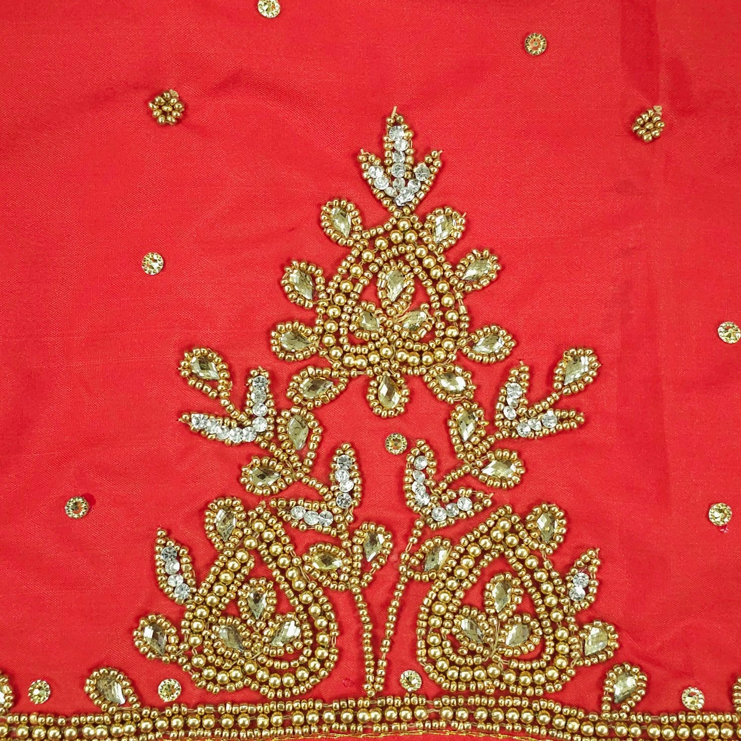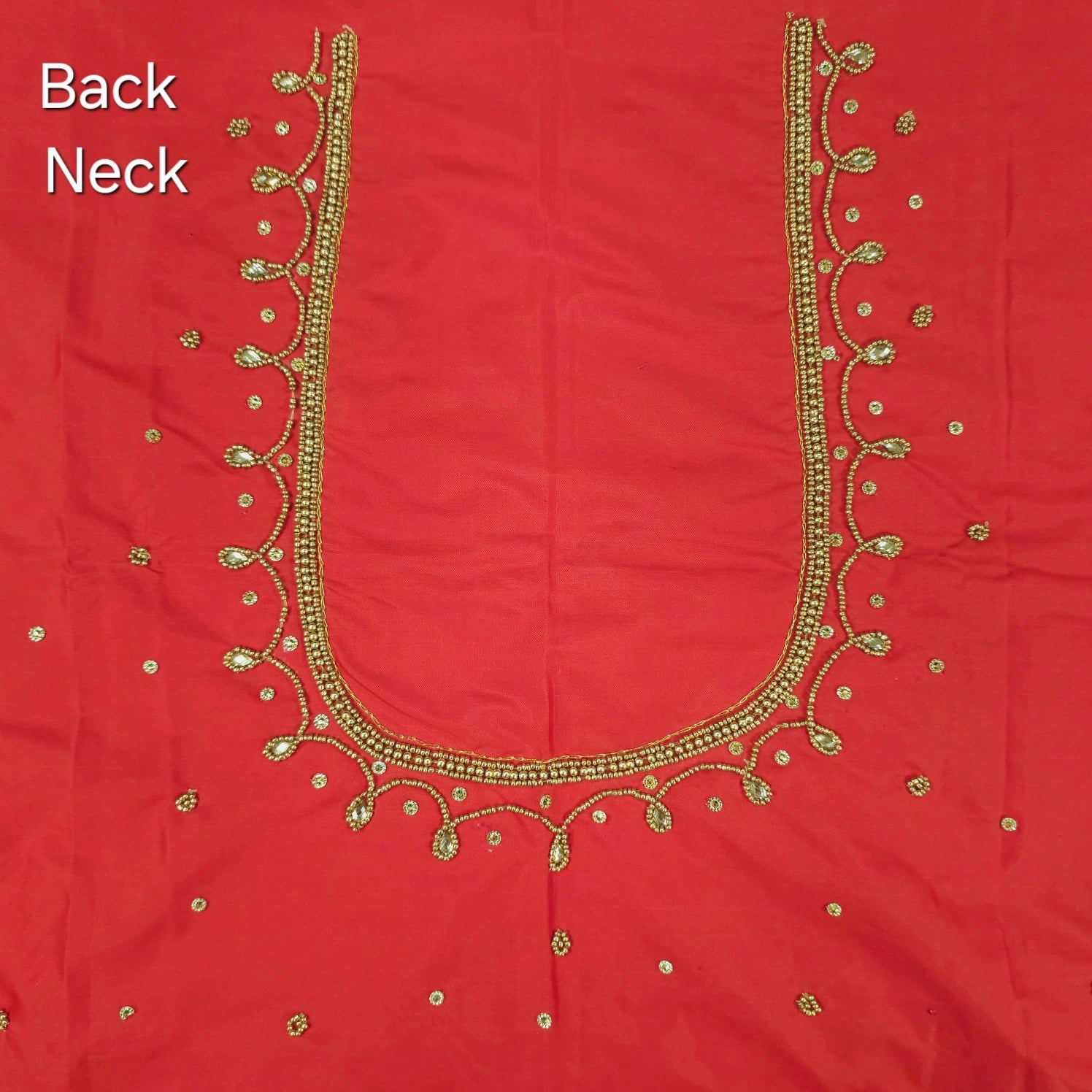 A rich festive blouse fabric in a deep coral-red base, accentuated with intricate golden bead and sequin embroidery. The neckline features delicate floral motifs, while the back boasts a grand central design inspired by traditional paisley and leaf patterns. Perfect for bridal and festive ensembles.