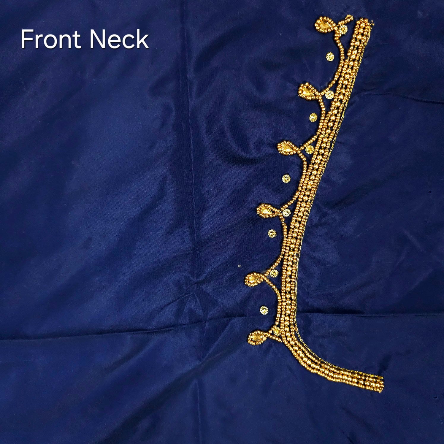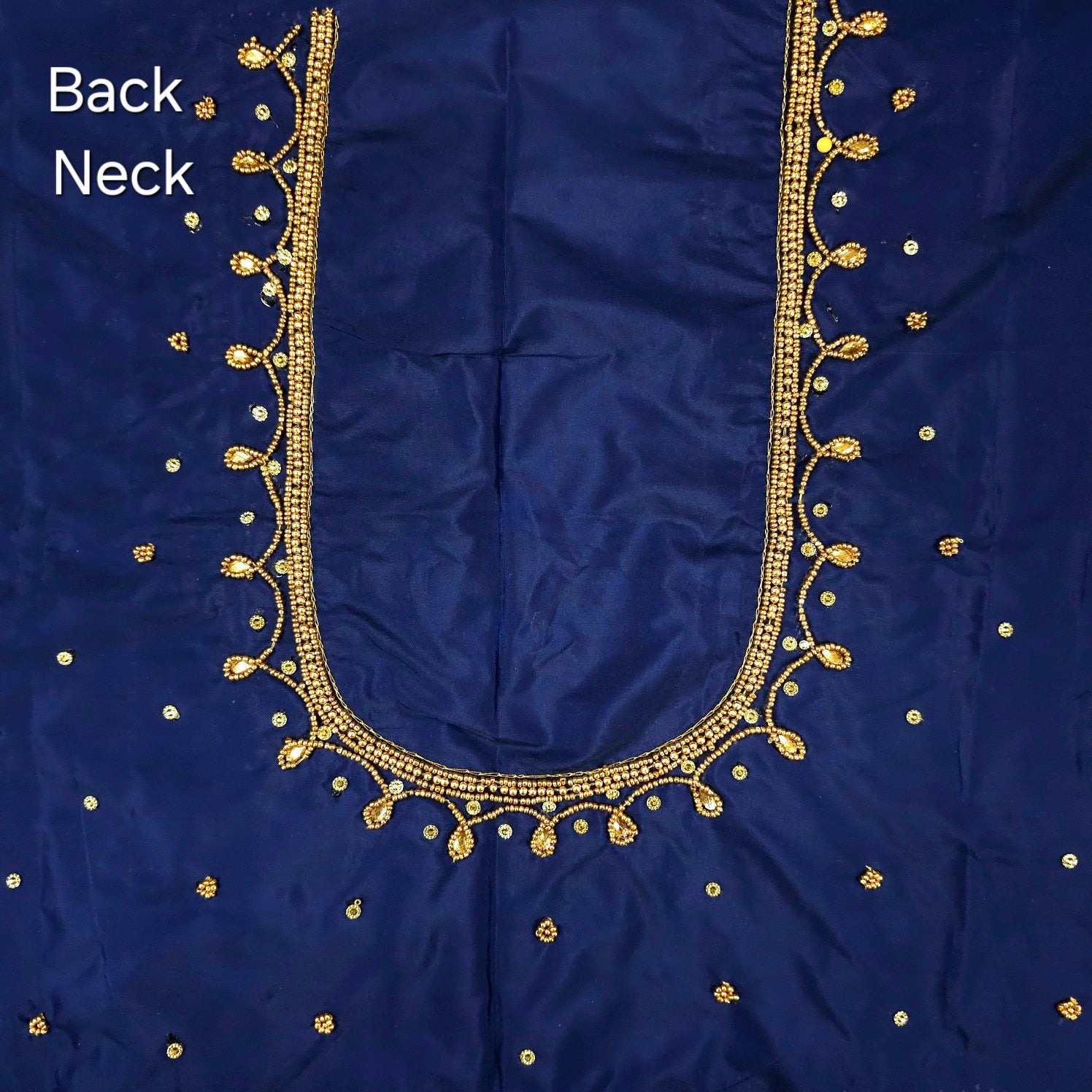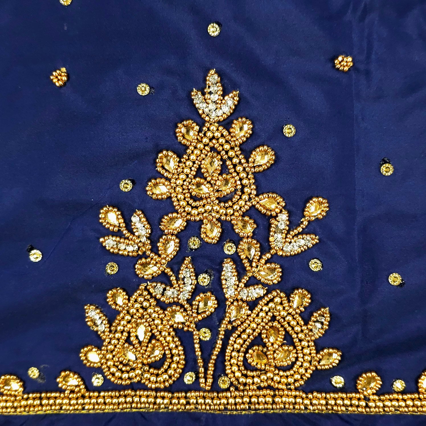 A rich festive blouse fabric in a Midnight Blue, accentuated with intricate golden bead and sequin embroidery. The neckline features delicate floral motifs, while the back boasts a grand central design inspired by traditional paisley and leaf patterns. Perfect for bridal and festive ensembles.