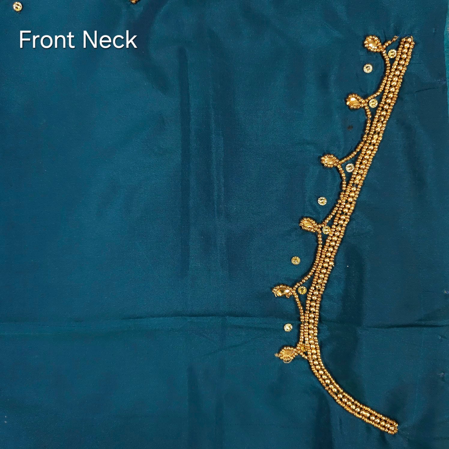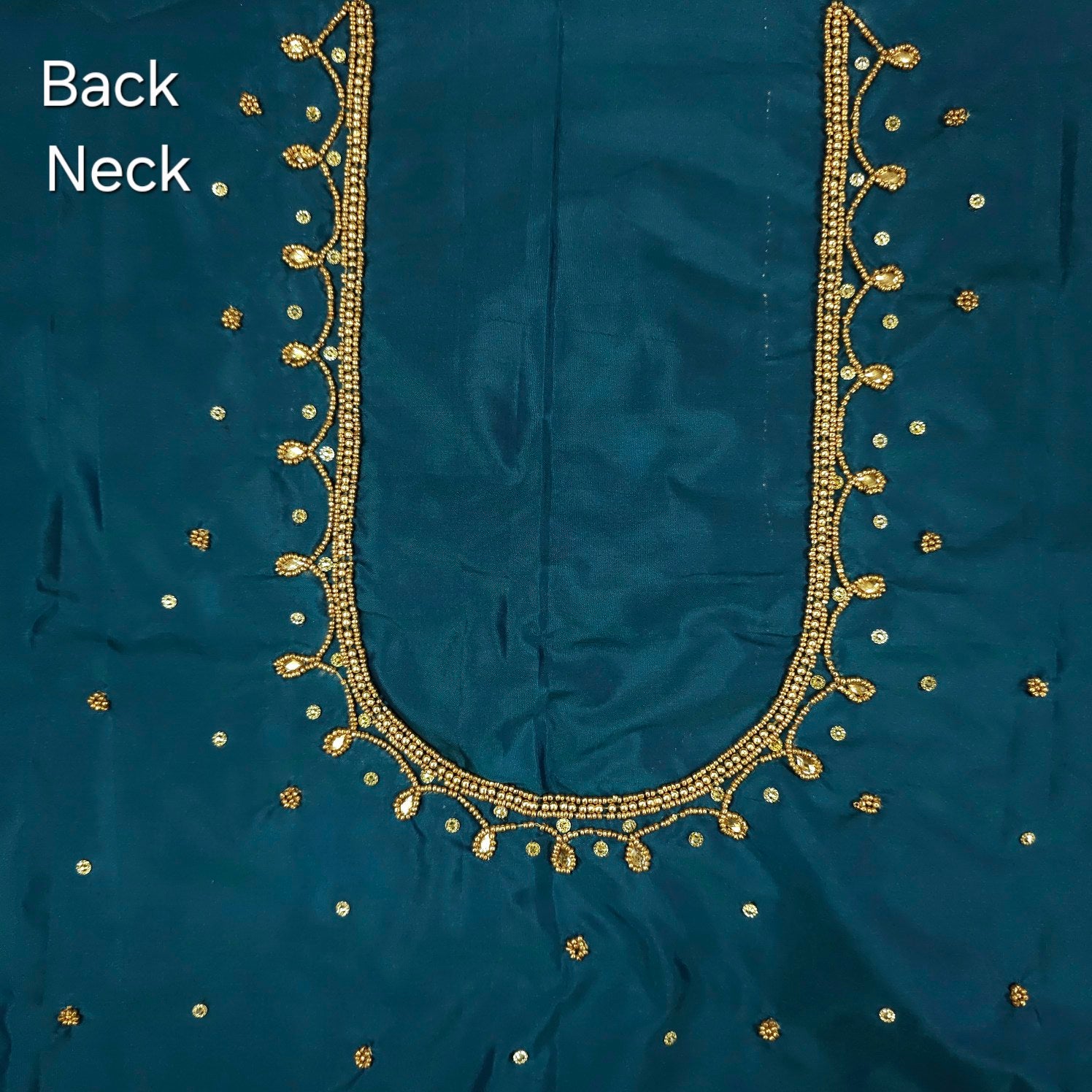 A rich festive blouse fabric in a teal blue, accentuated with intricate golden bead and sequin embroidery. The neckline features delicate floral motifs, while the back boasts a grand central design inspired by traditional paisley and leaf patterns. Perfect for bridal and festive ensembles.