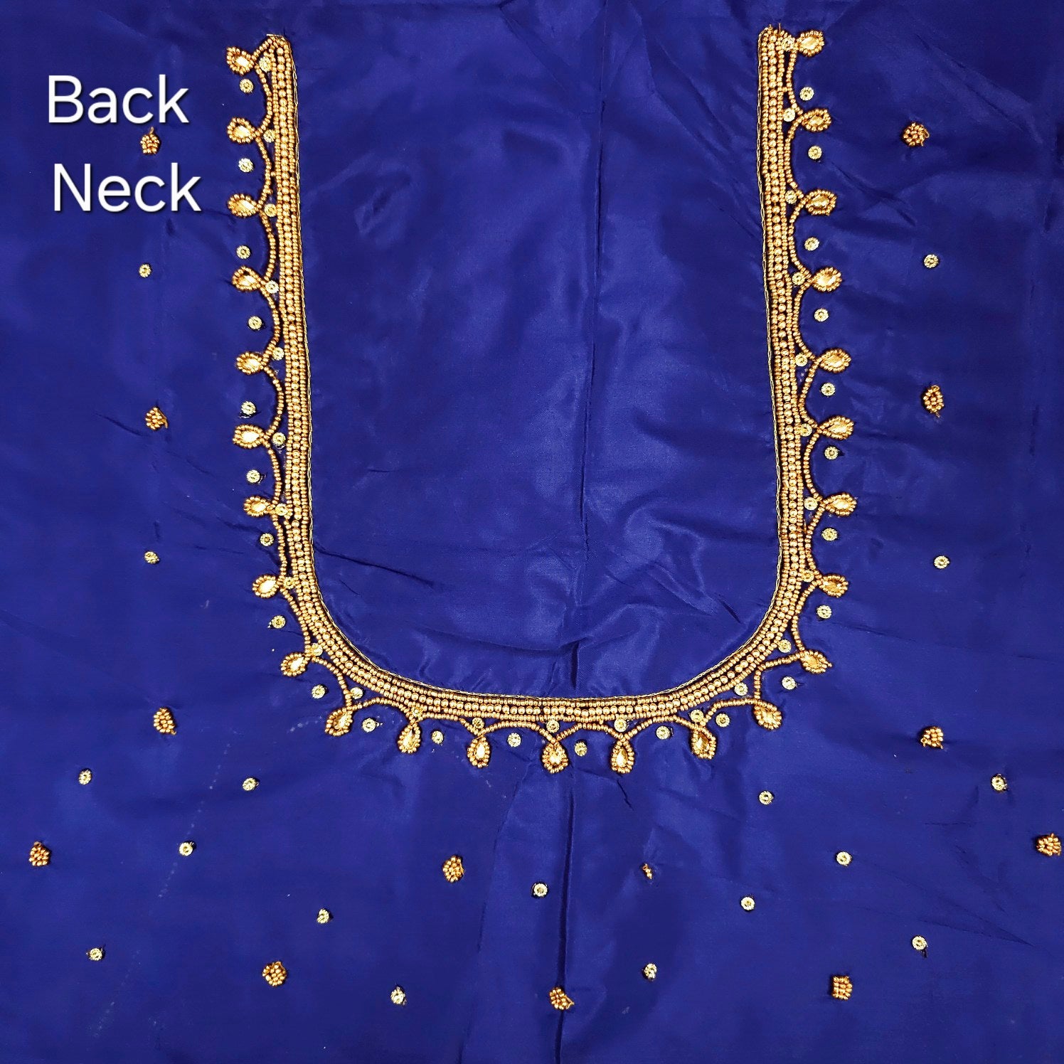 A rich festive blouse fabric in a dark blue, accentuated with intricate golden bead and sequin embroidery. The neckline features delicate floral motifs, while the back boasts a grand central design inspired by traditional paisley and leaf patterns. Perfect for bridal and festive ensembles.