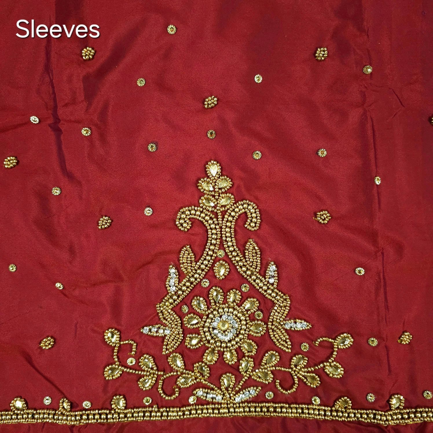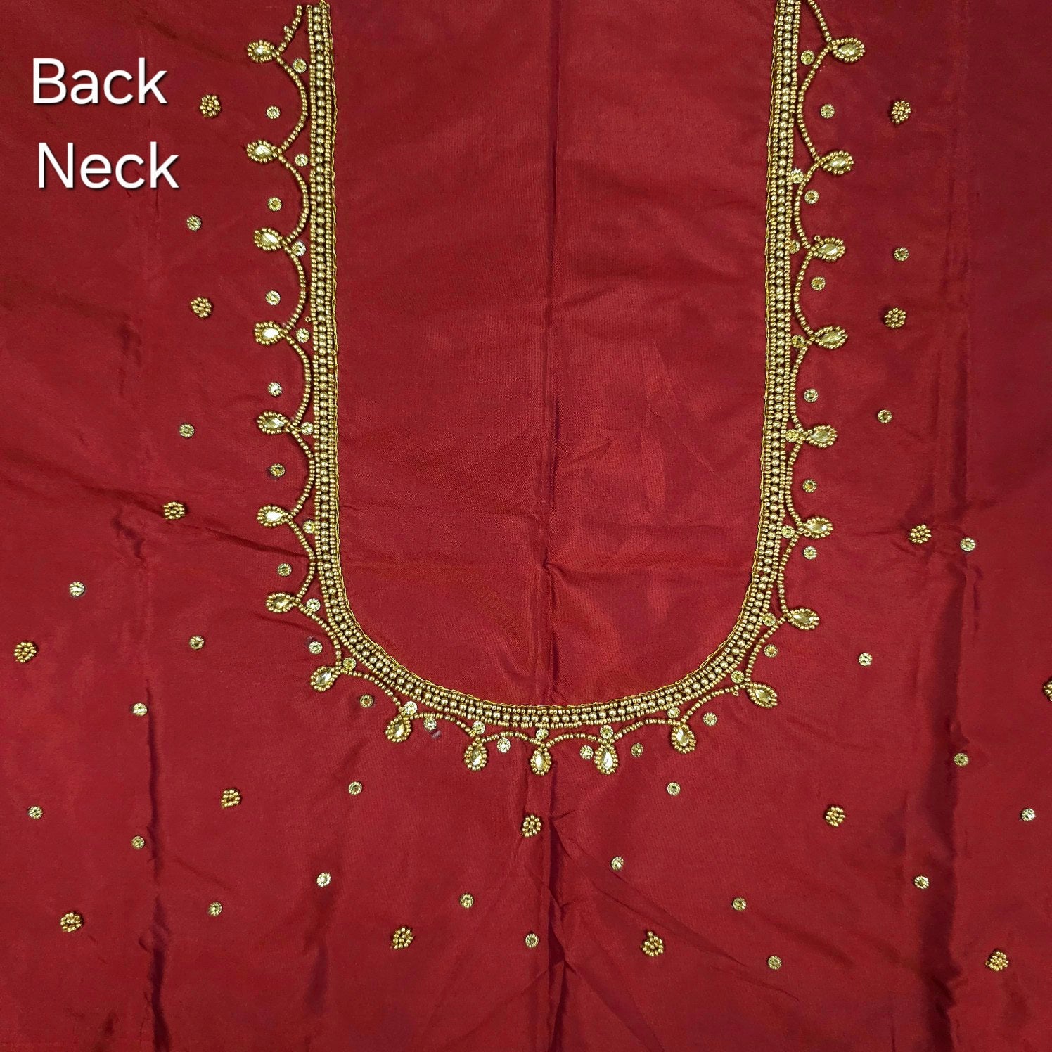A rich festive blouse fabric in a hot pink base, accentuated with intricate golden bead and sequin embroidery. The neckline features delicate floral motifs, while the back boasts a grand central design inspired by traditional paisley and leaf patterns. Perfect for bridal and festive ensembles.