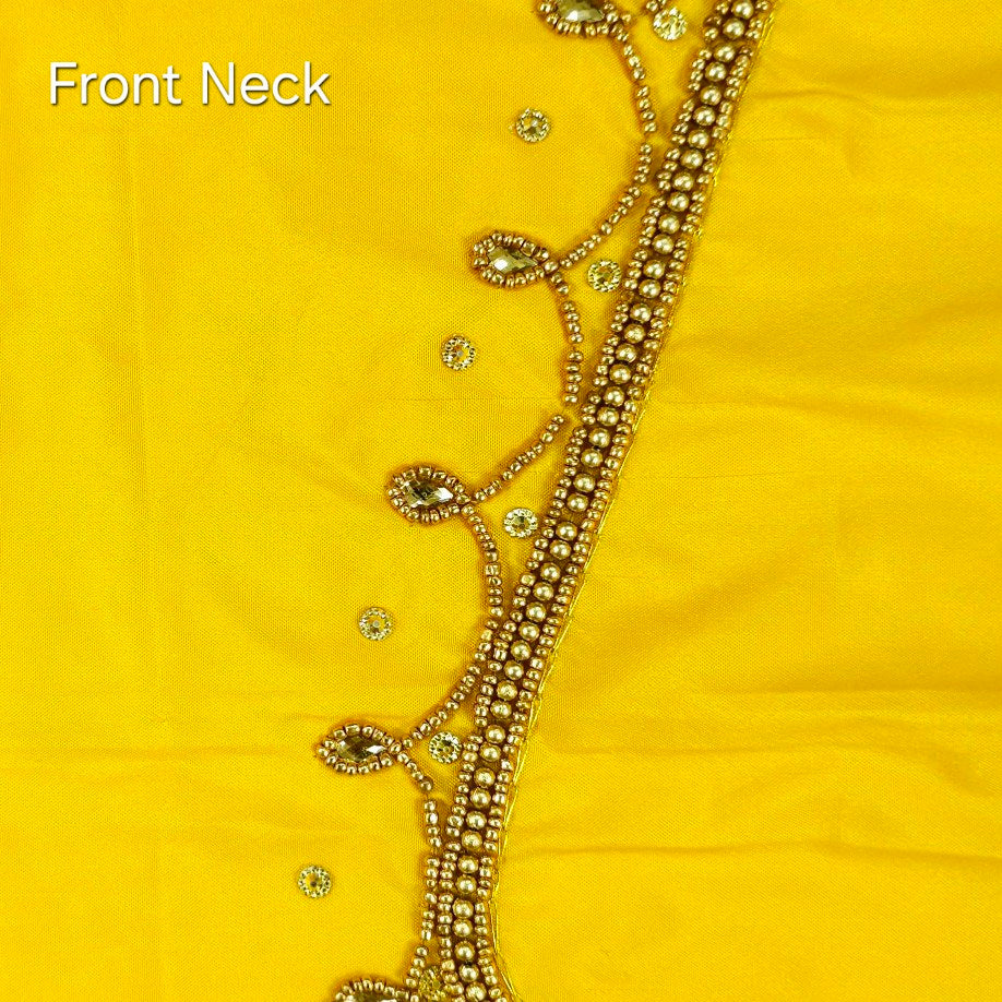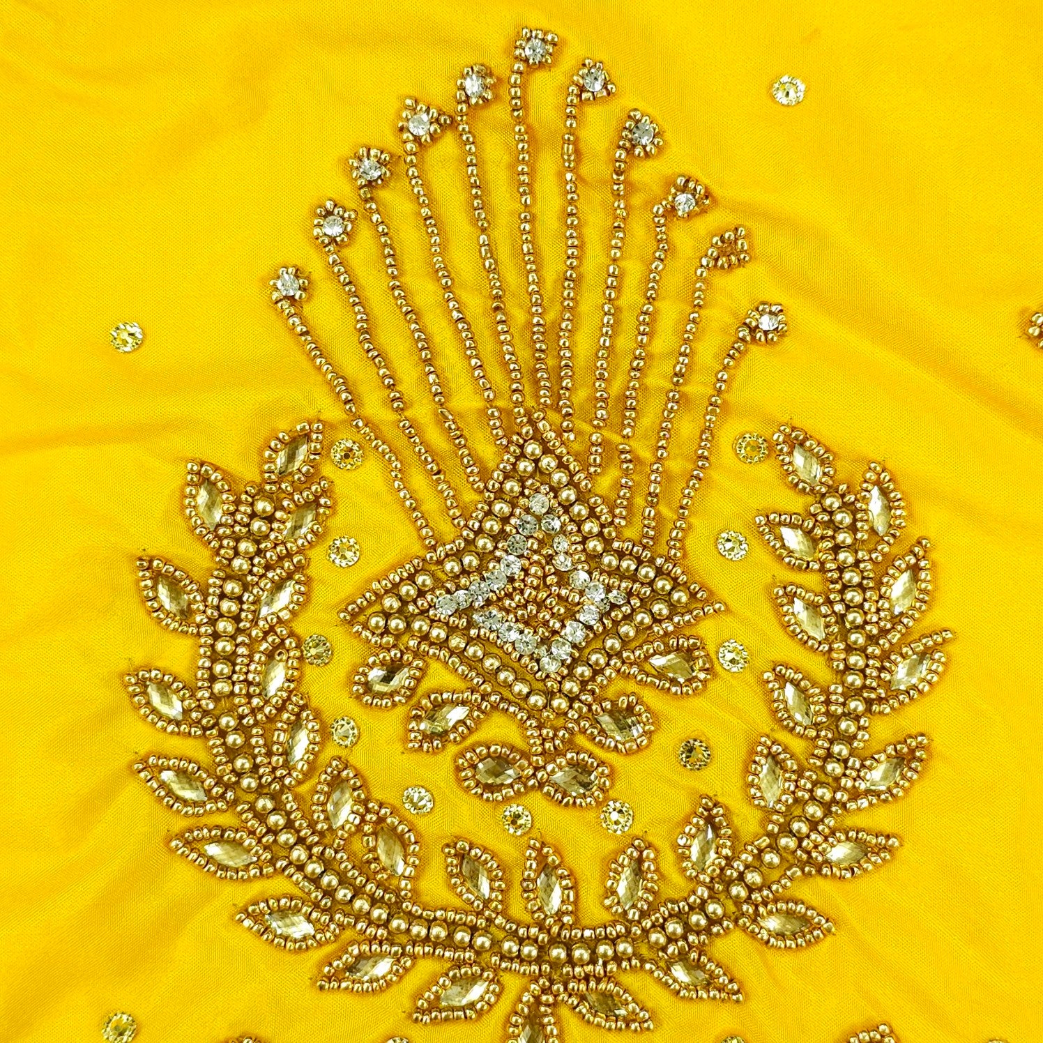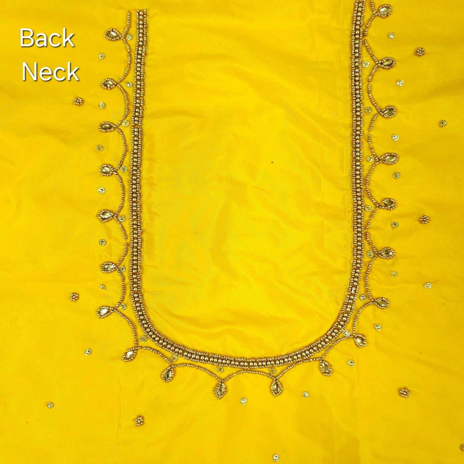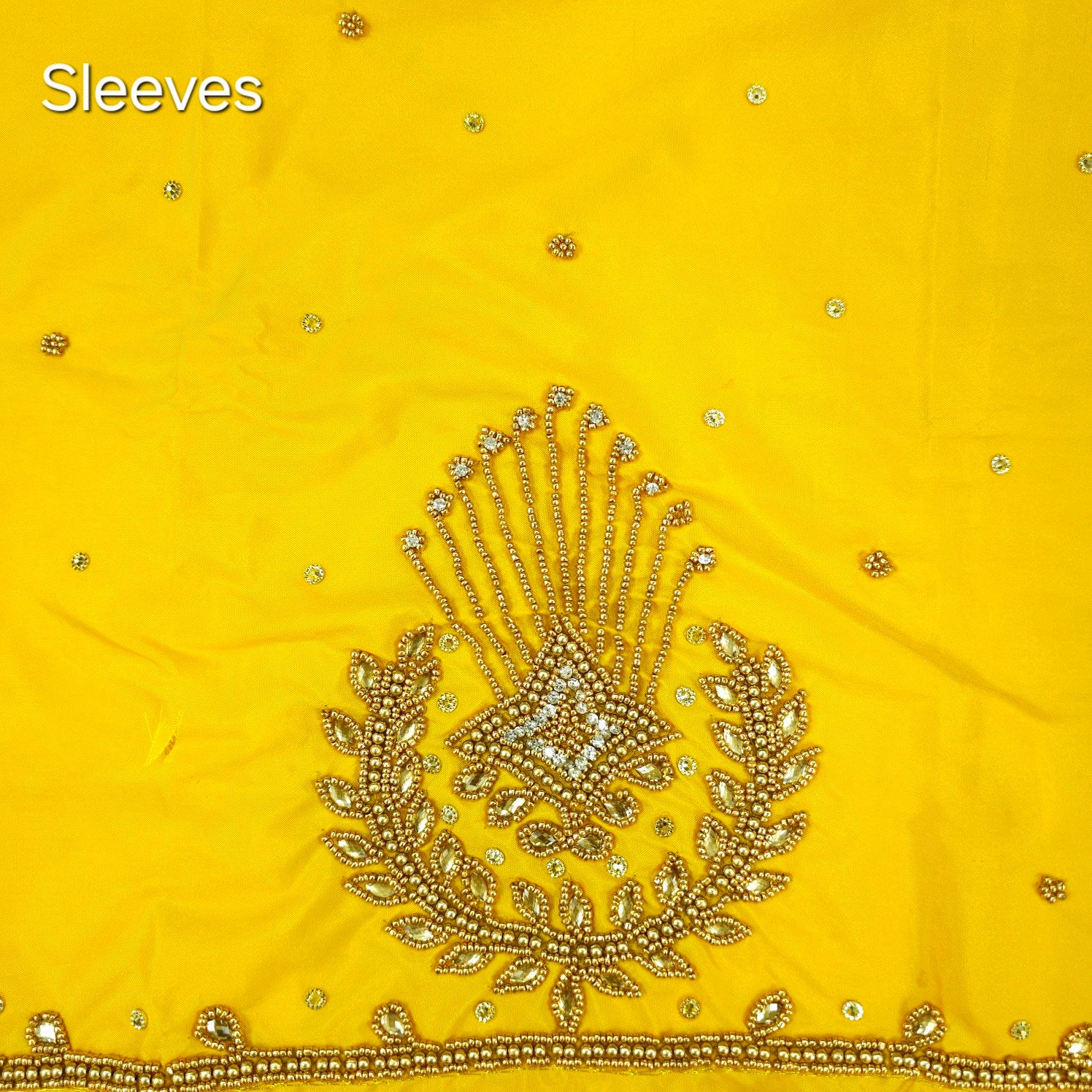 A rich festive blouse fabric in a bright yellow, accentuated with intricate golden bead and sequin embroidery. The neckline features delicate floral motifs, while the back boasts a grand central design inspired by traditional paisley and leaf patterns. Perfect for bridal and festive ensembles.