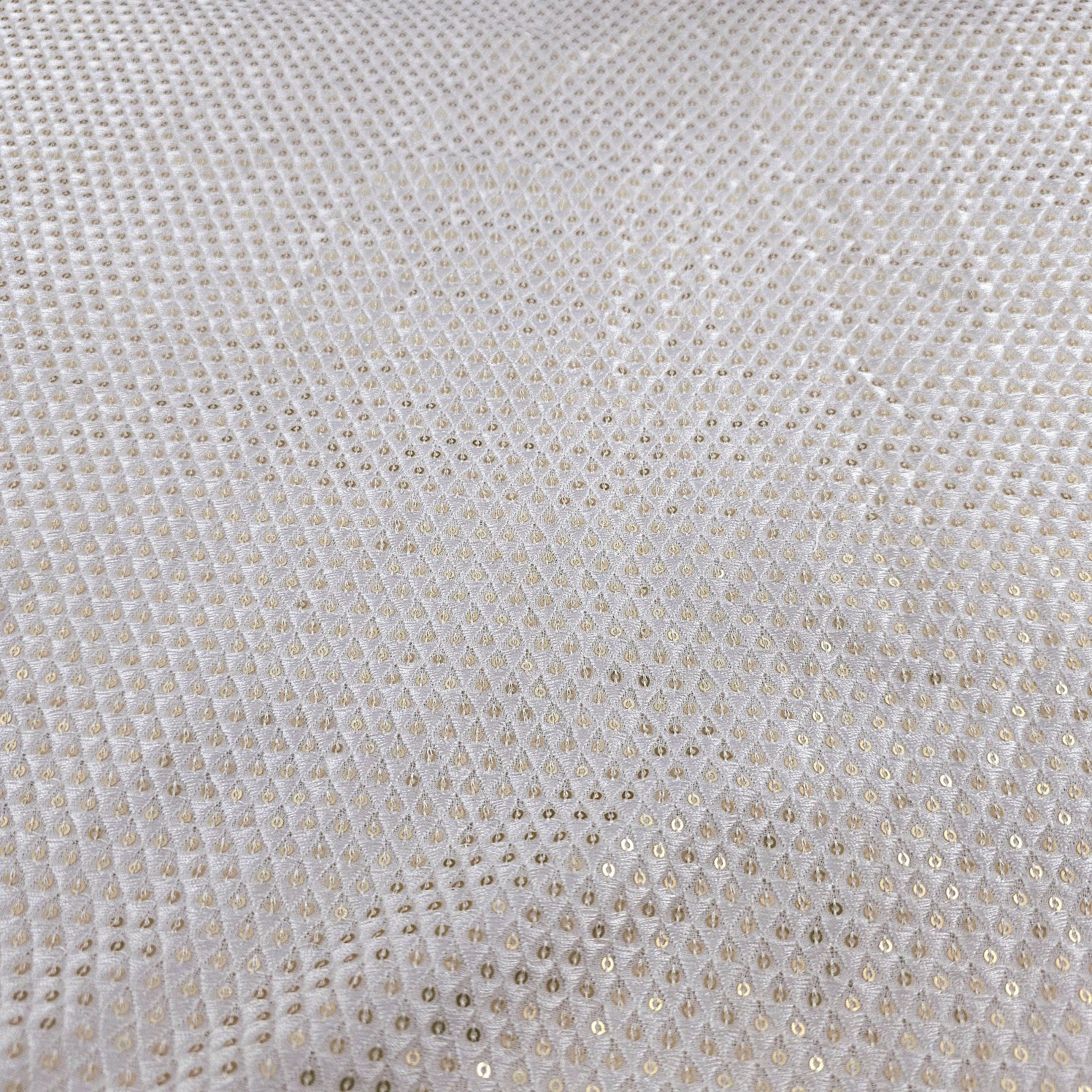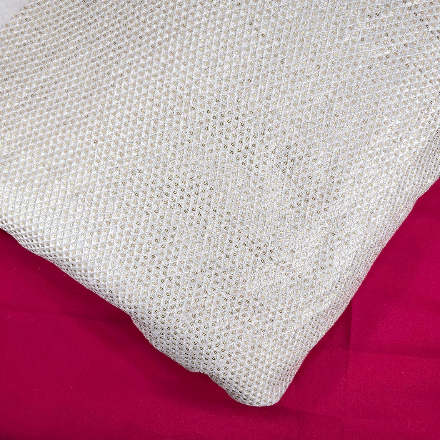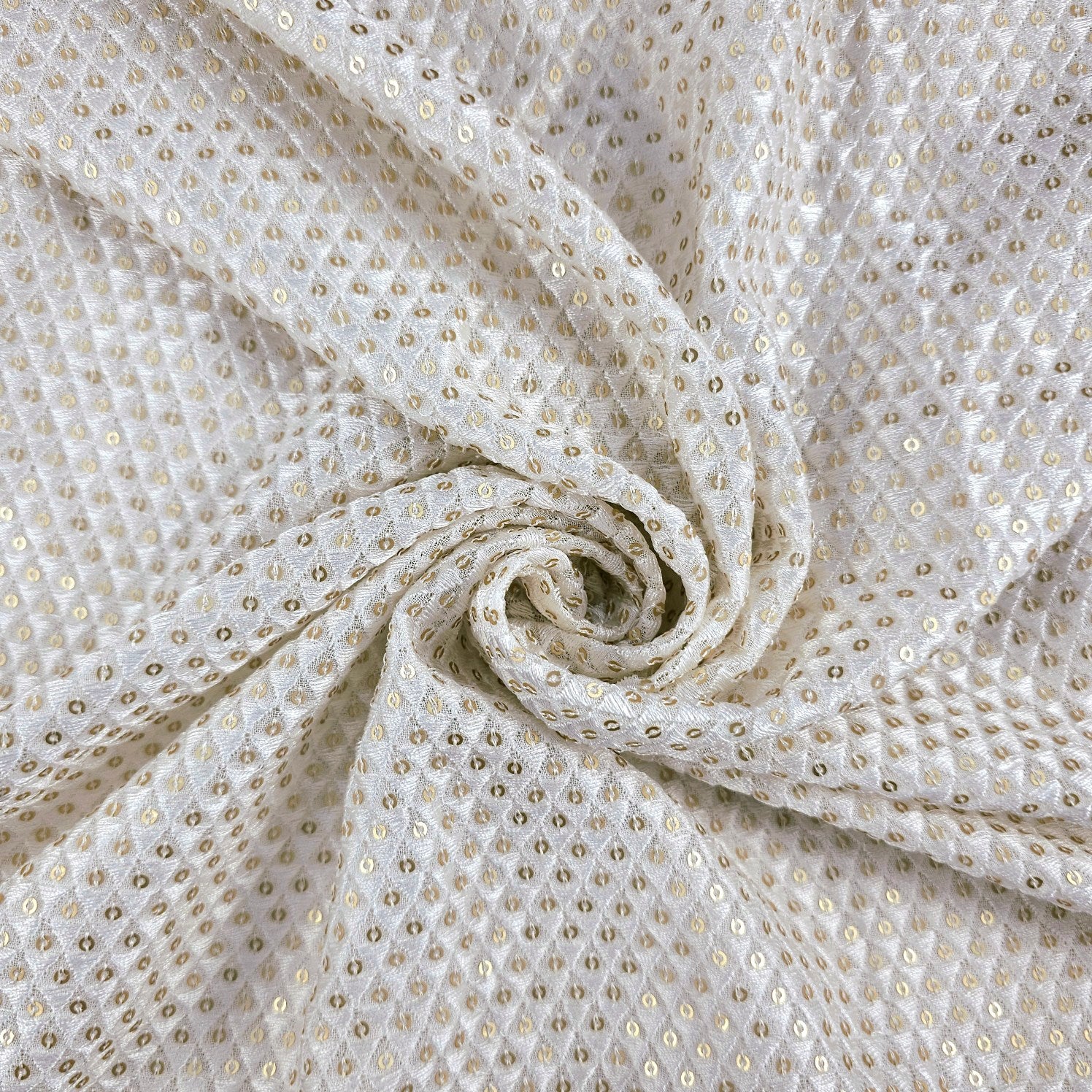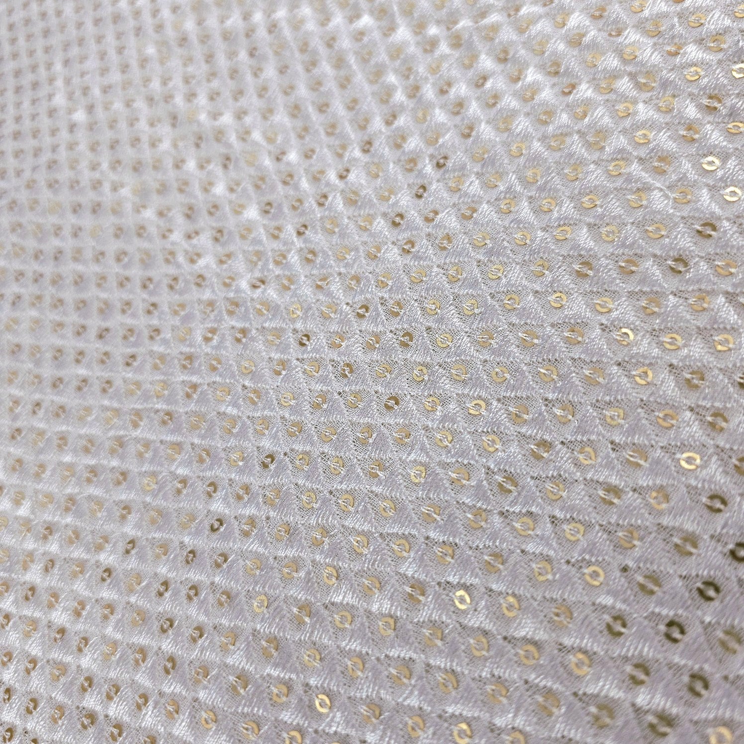 An elegant dyeable georgette fabric featuring intricate all-over resham (thread) embroidery combined with subtle gold sequin highlights. The craftsmanship creates a graceful shimmer over a soft and flowy base, allowing the fabric to be dyed in any shade while retaining its rich, ornate appearance. Perfect for luxurious ethnic or contemporary ensembles.