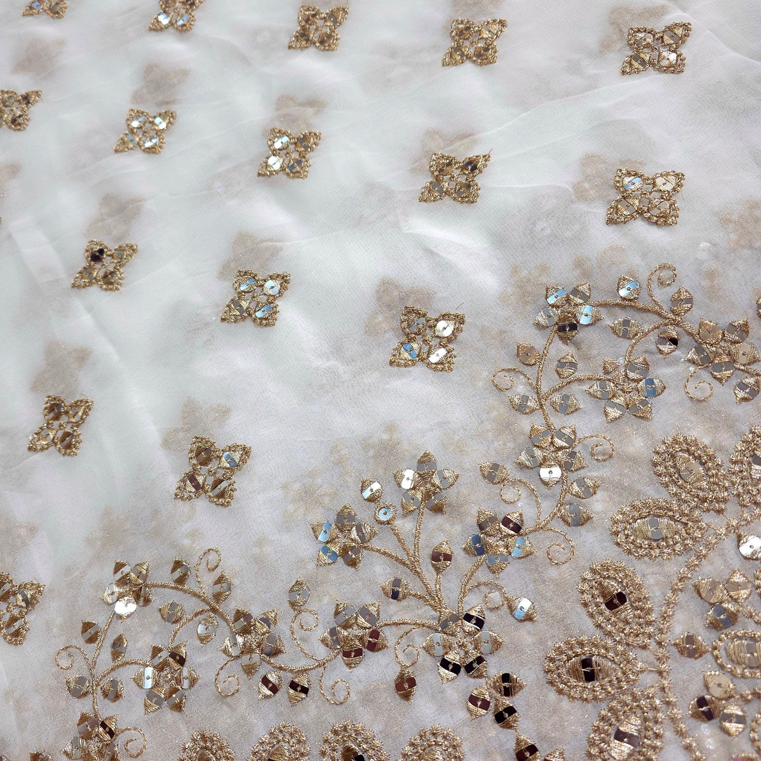 An elegant dyeable georgette fabric featuring intricate all-over butta work embroidery with gold sequin, mirror border. The craftsmanship creates a graceful shimmer over a soft and flowy base, allowing the fabric to be dyed in any shade while retaining its rich, ornate appearance. Perfect for luxurious ethnic or contemporary ensembles.