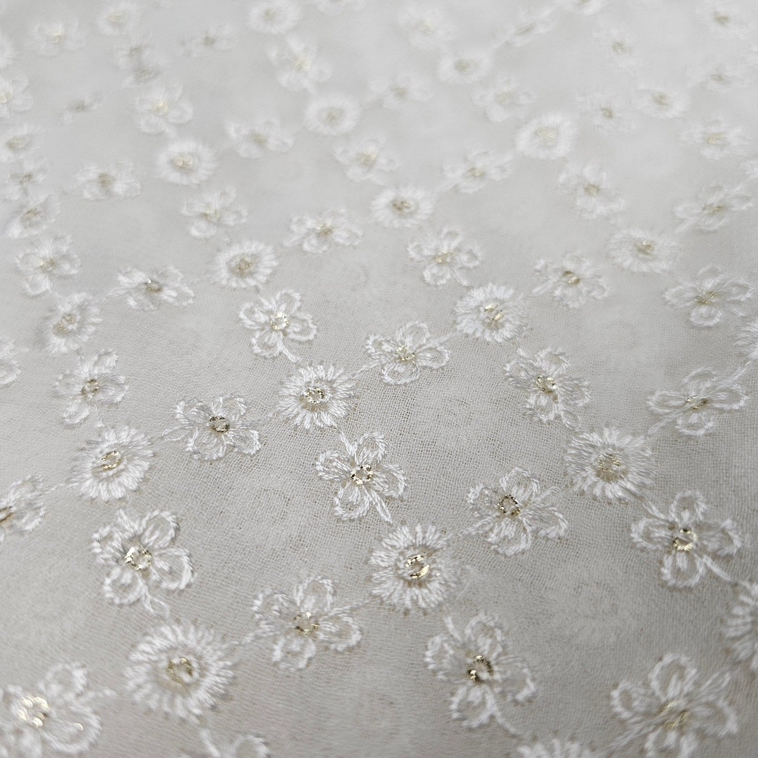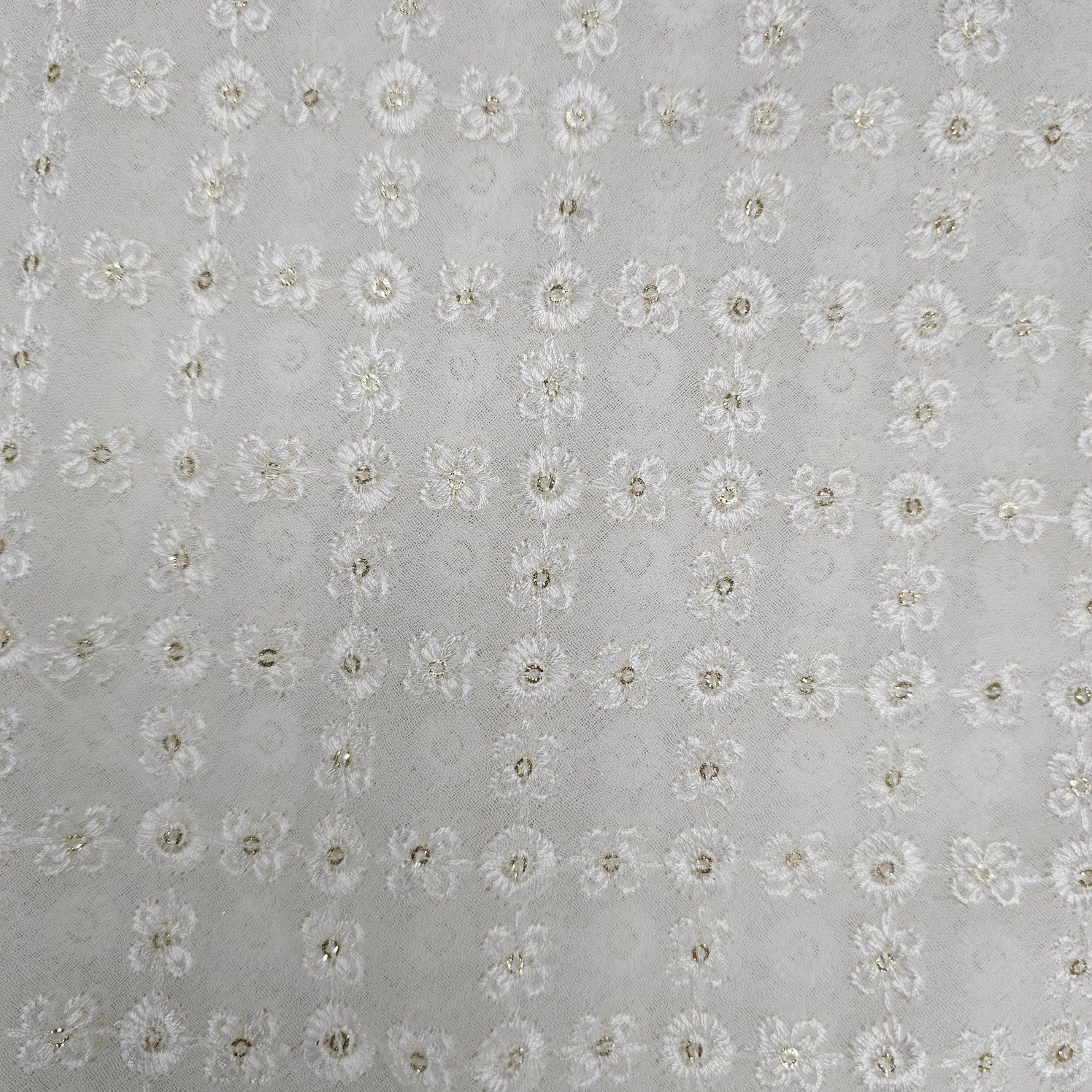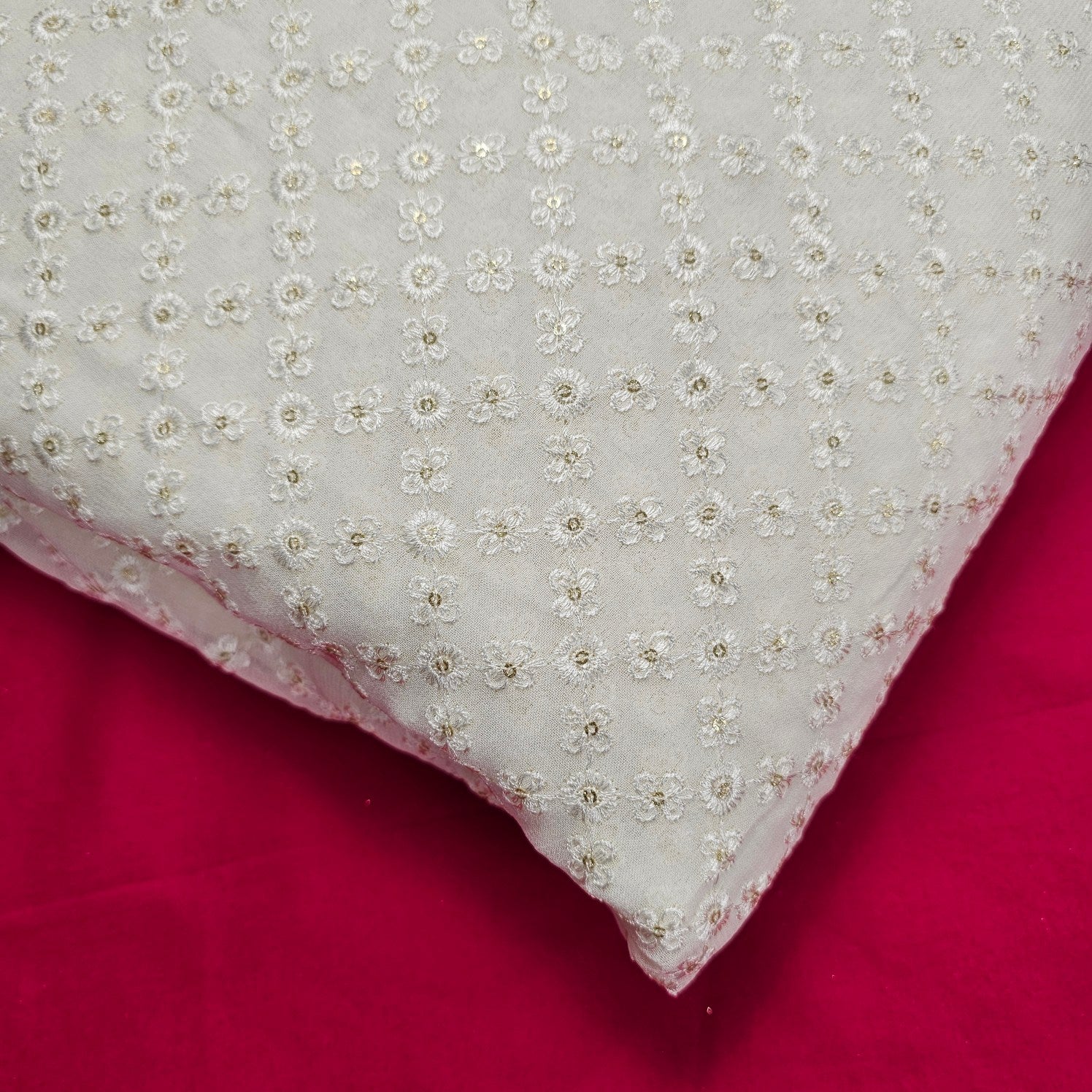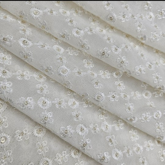 An elegant dyeable georgette fabric featuring intricate all-over resham (thread) embroidery combined with subtle gold sequin highlights. The craftsmanship creates a graceful shimmer over a soft and flowy base, allowing the fabric to be dyed in any shade while retaining its rich, ornate appearance. Perfect for luxurious ethnic or contemporary ensembles.