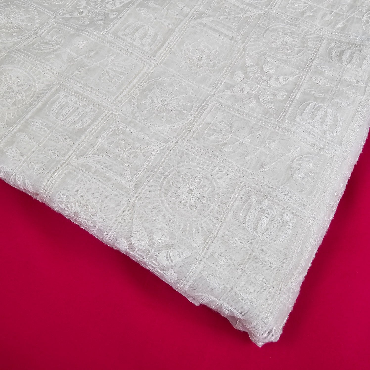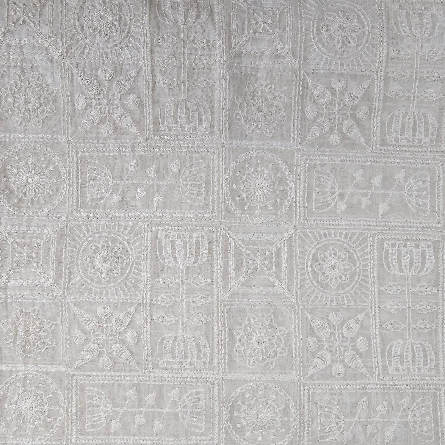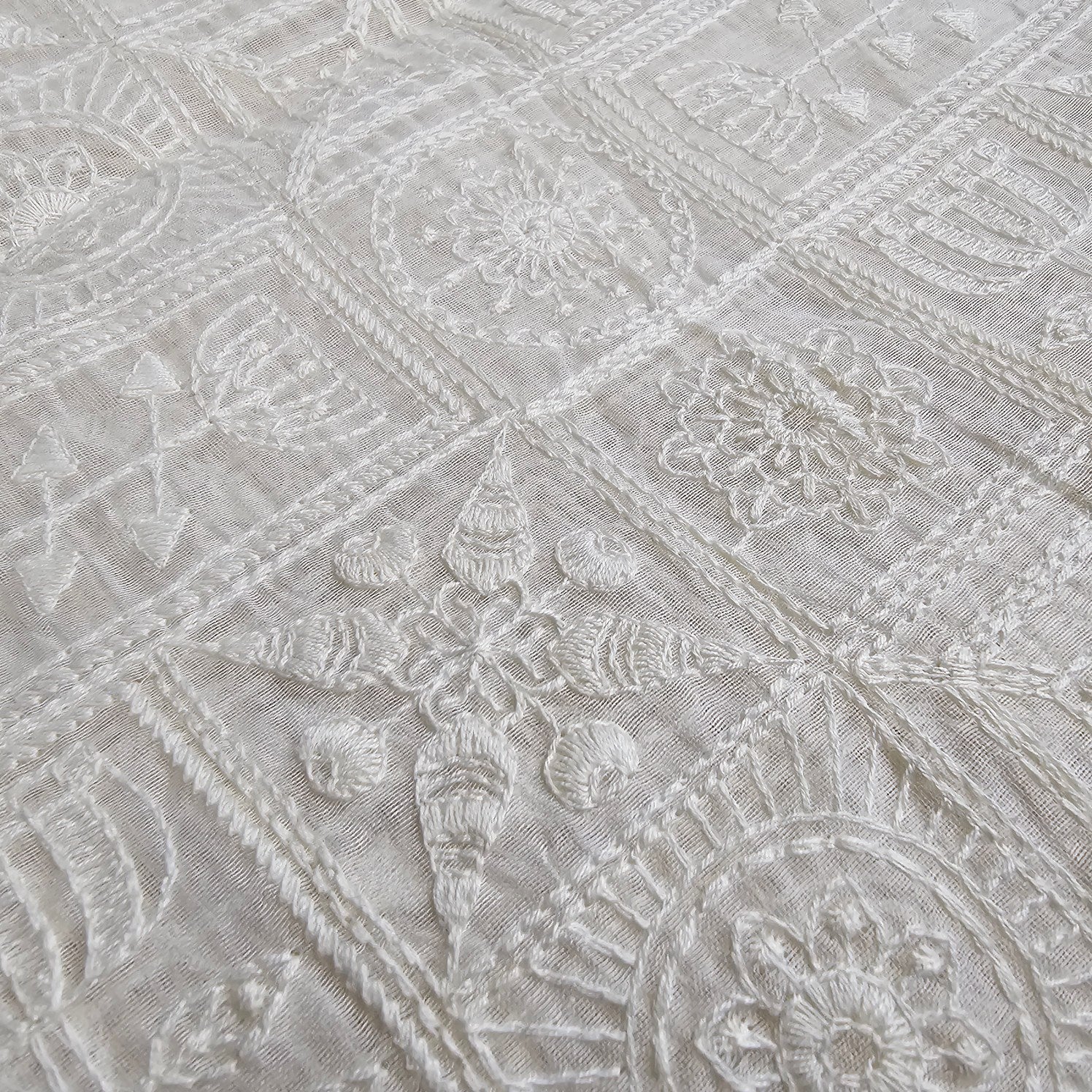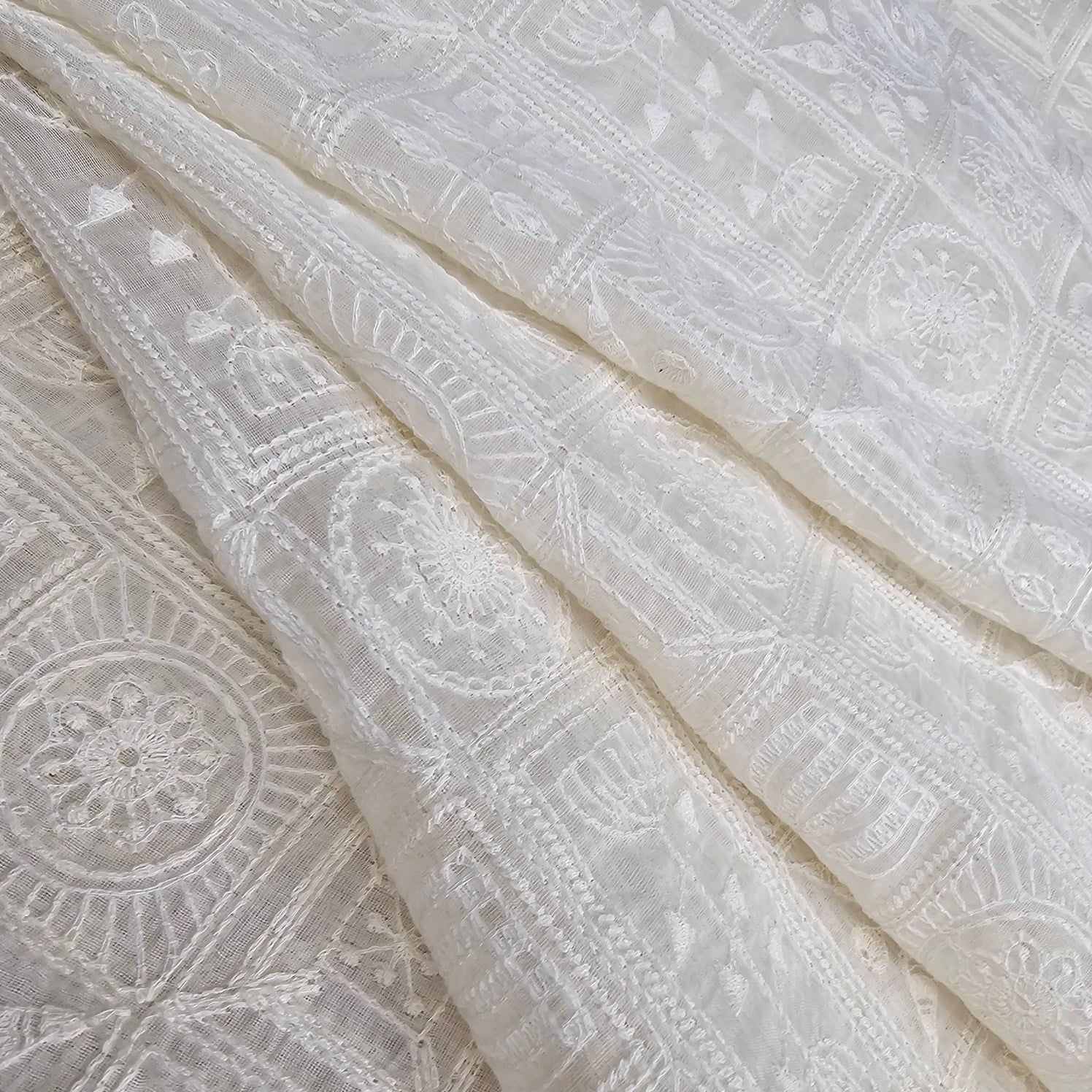 This fabric is a beautiful handcrafted or machine-assisted Chikankari embroidery on a sheer organza base. The design features geometric patch-like sections filled with floral and paisley motifs, which are typical of traditional Chikankari embroidery from Lucknow, India. The embroidery is done in tone-on-tone white thread, giving it a timeless, elegant appearance. The sheer base enhances the delicate craftsmanship, while the structured embroidery adds texture and dimension.Suitable for festive, bridal, and occasion wear, including sarees, dupattas, and lehengas