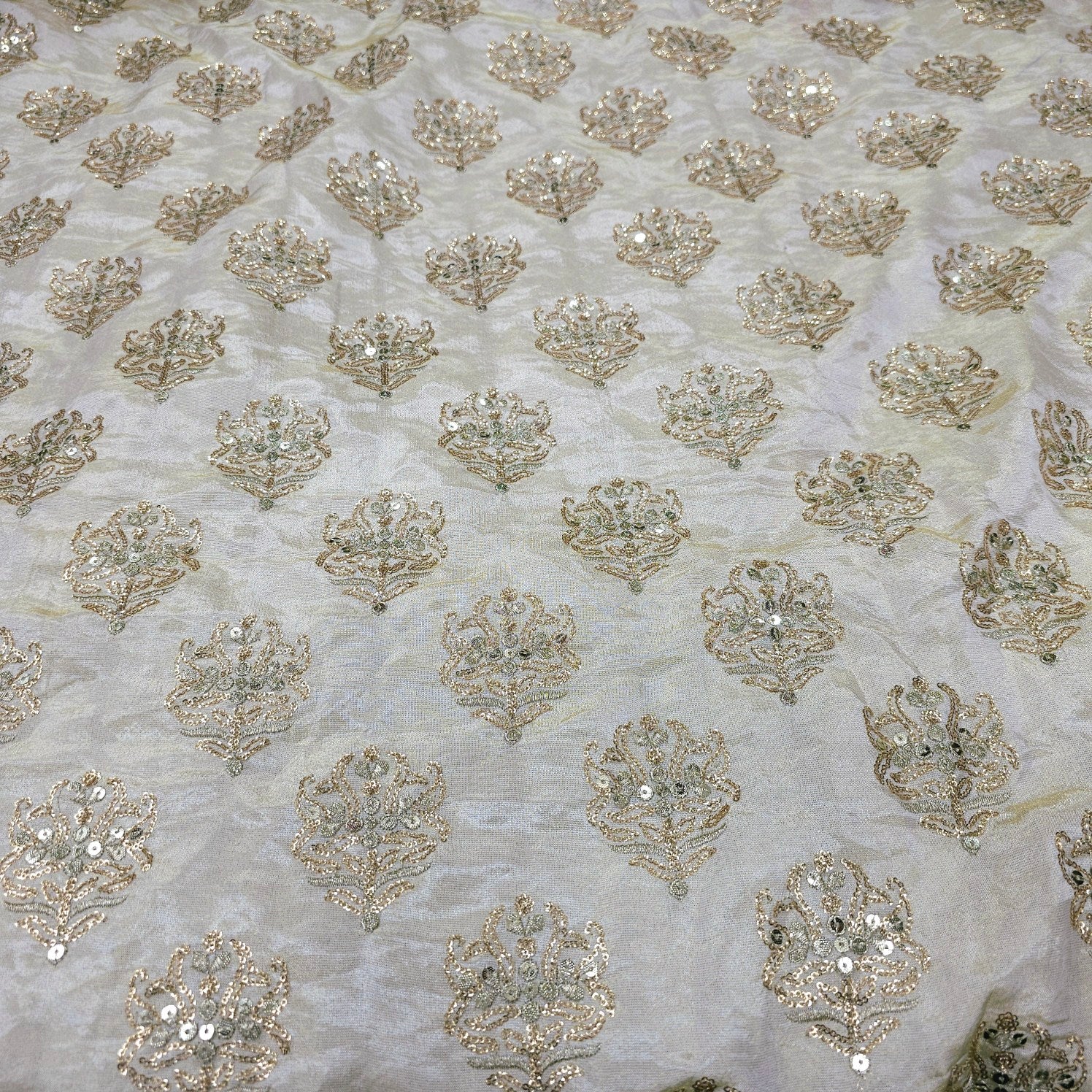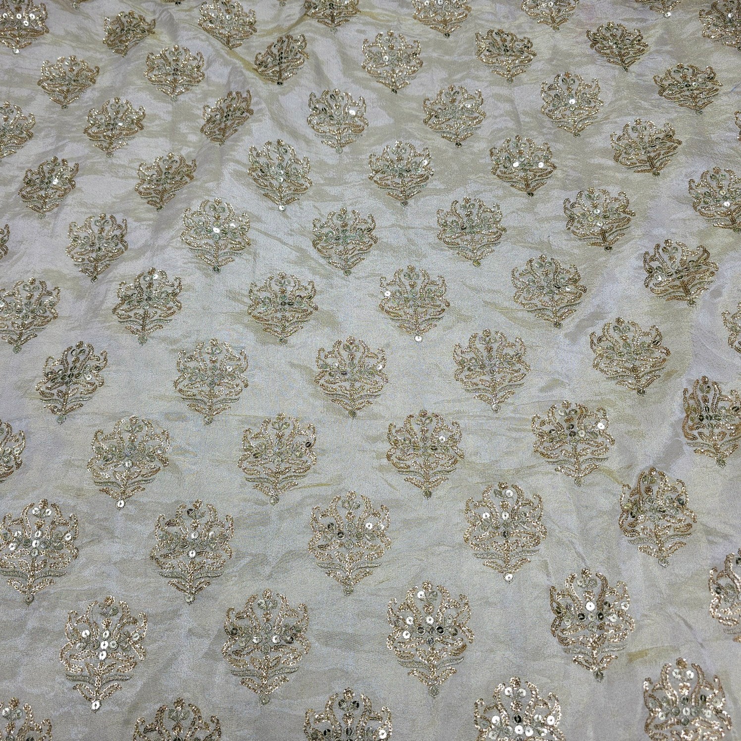 A delicate gold shimmer tissue fabric featuring tree motif zari and sequins work. The fabric has a glistening finish. Ideal for creating subtle yet sophisticated ethnic and festive outfits and the base is dyeable work will remain as it is.