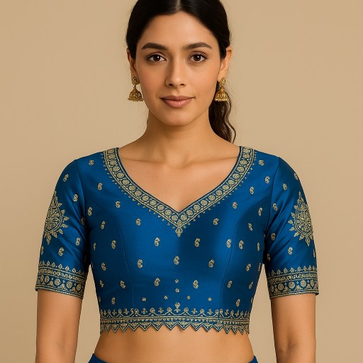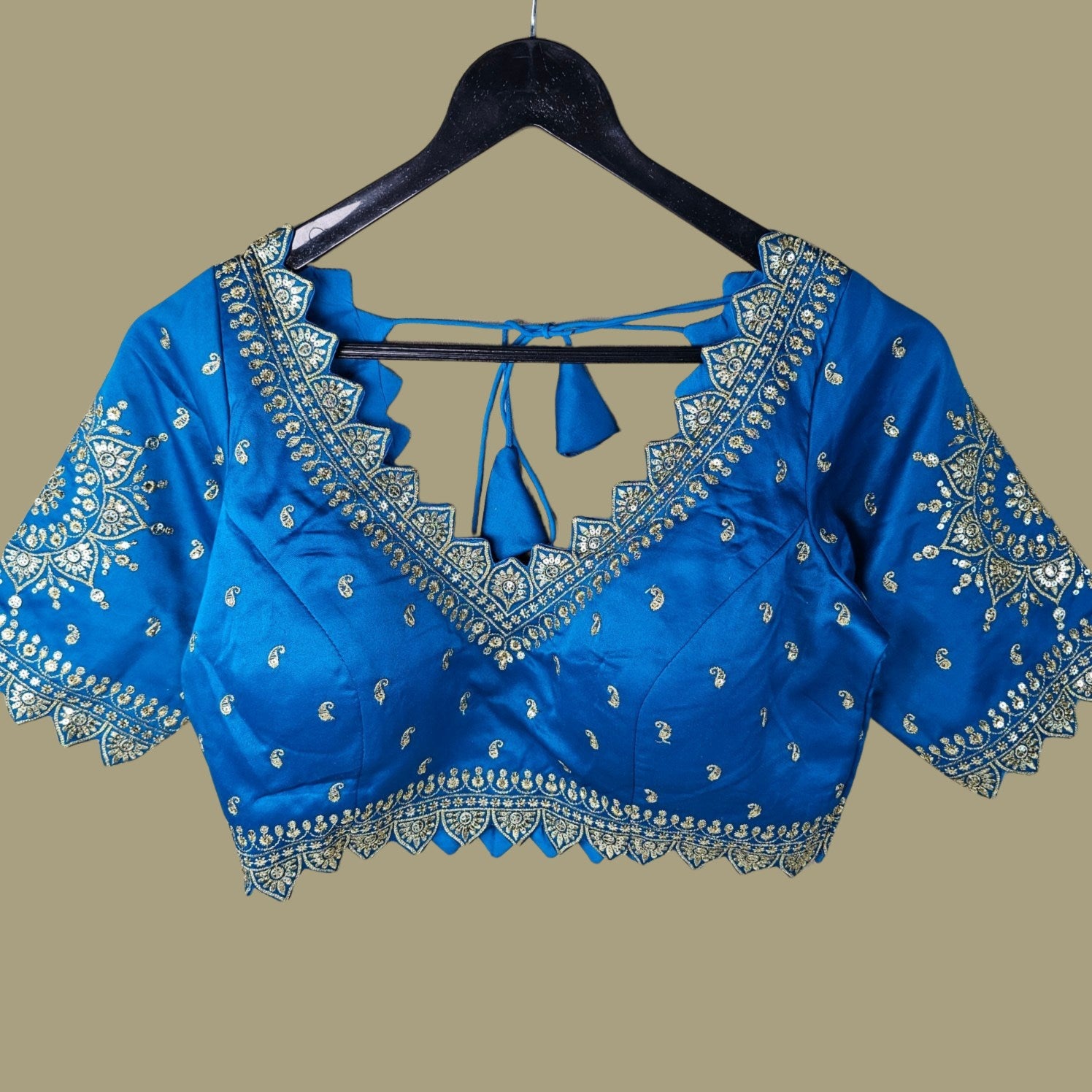 This deep sky blue color curvy V blouse features intricate golden embroidery with delicate paisley and mandala motifs. The scalloped curvy V-neckline and hem add a regal touch, while the back tie detail completes the festive look. Perfect for weddings, sangeet, and traditional celebrations.