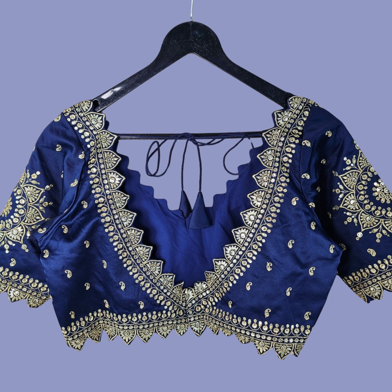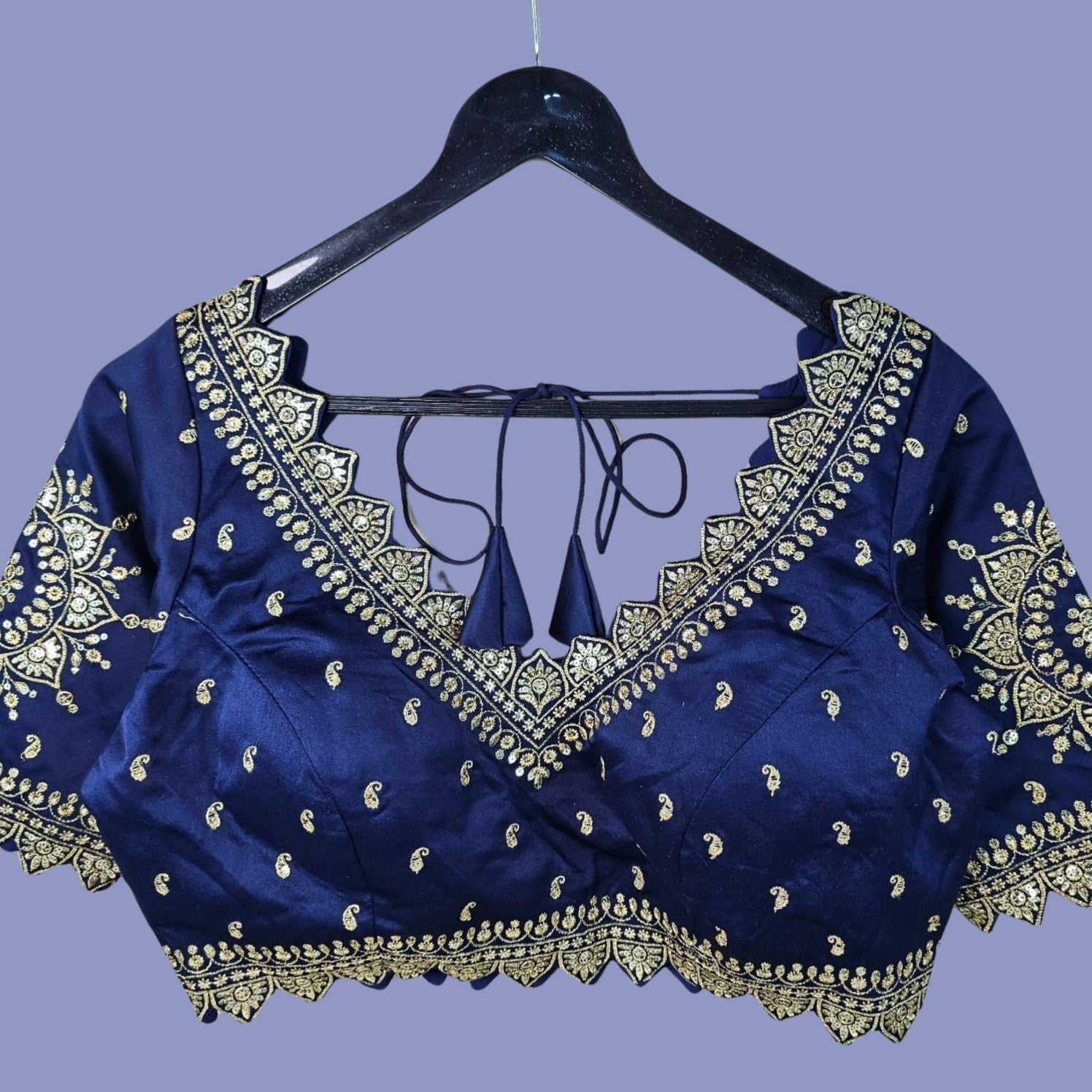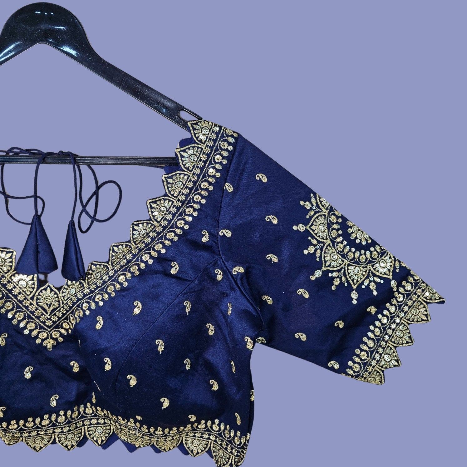 This navy blue color curvy V blouse features intricate golden embroidery with delicate paisley and mandala motifs. The scalloped curvy V-neckline and hem add a regal touch, while the back tie detail completes the festive look. Perfect for weddings, sangeet, and traditional celebrations.