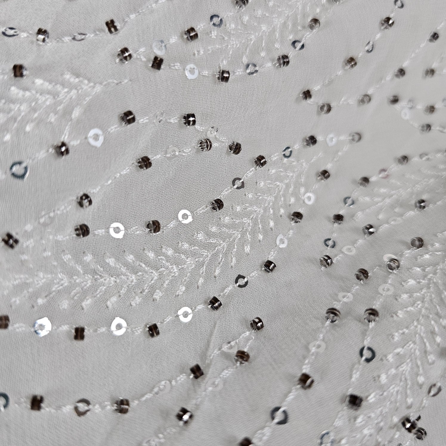 A delicate white georgette fabric featuring handwork. The fabric is very flowy. Ideal for lightweight ethnic wear.