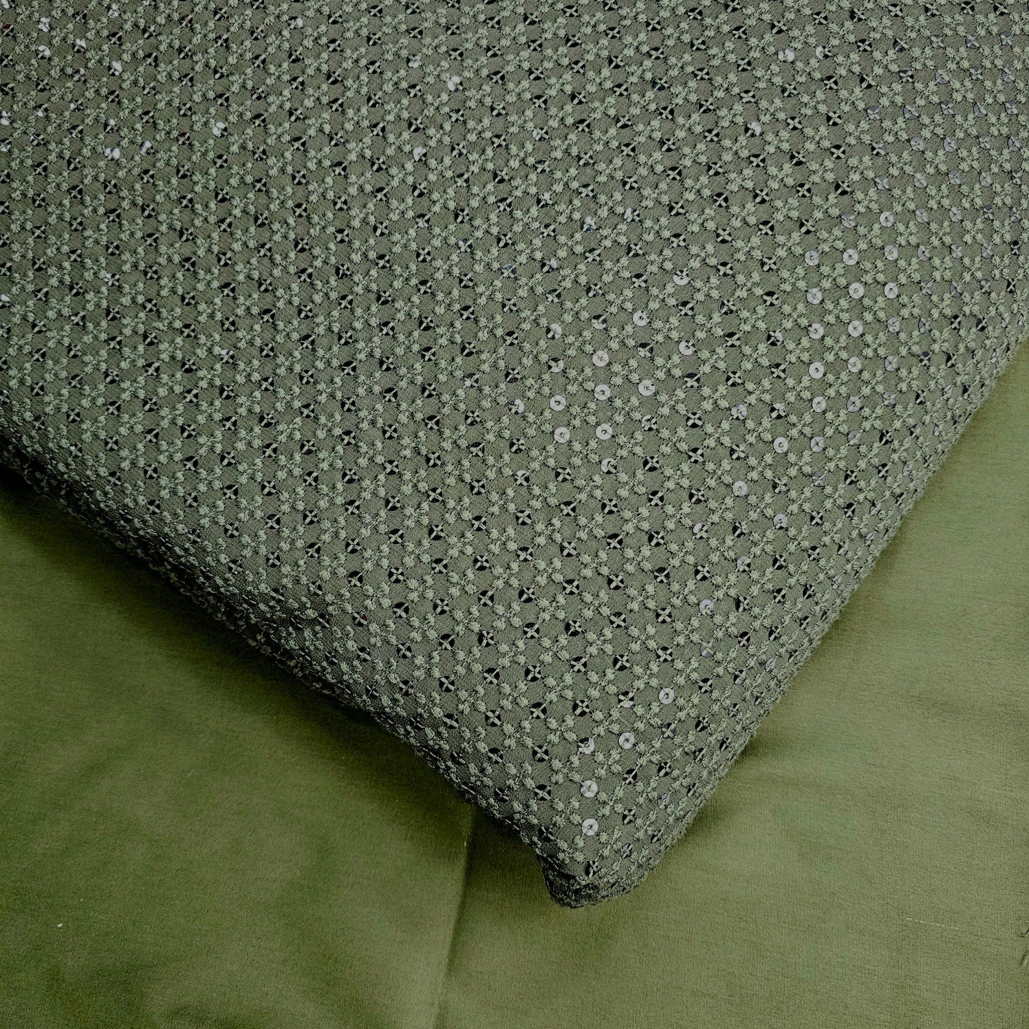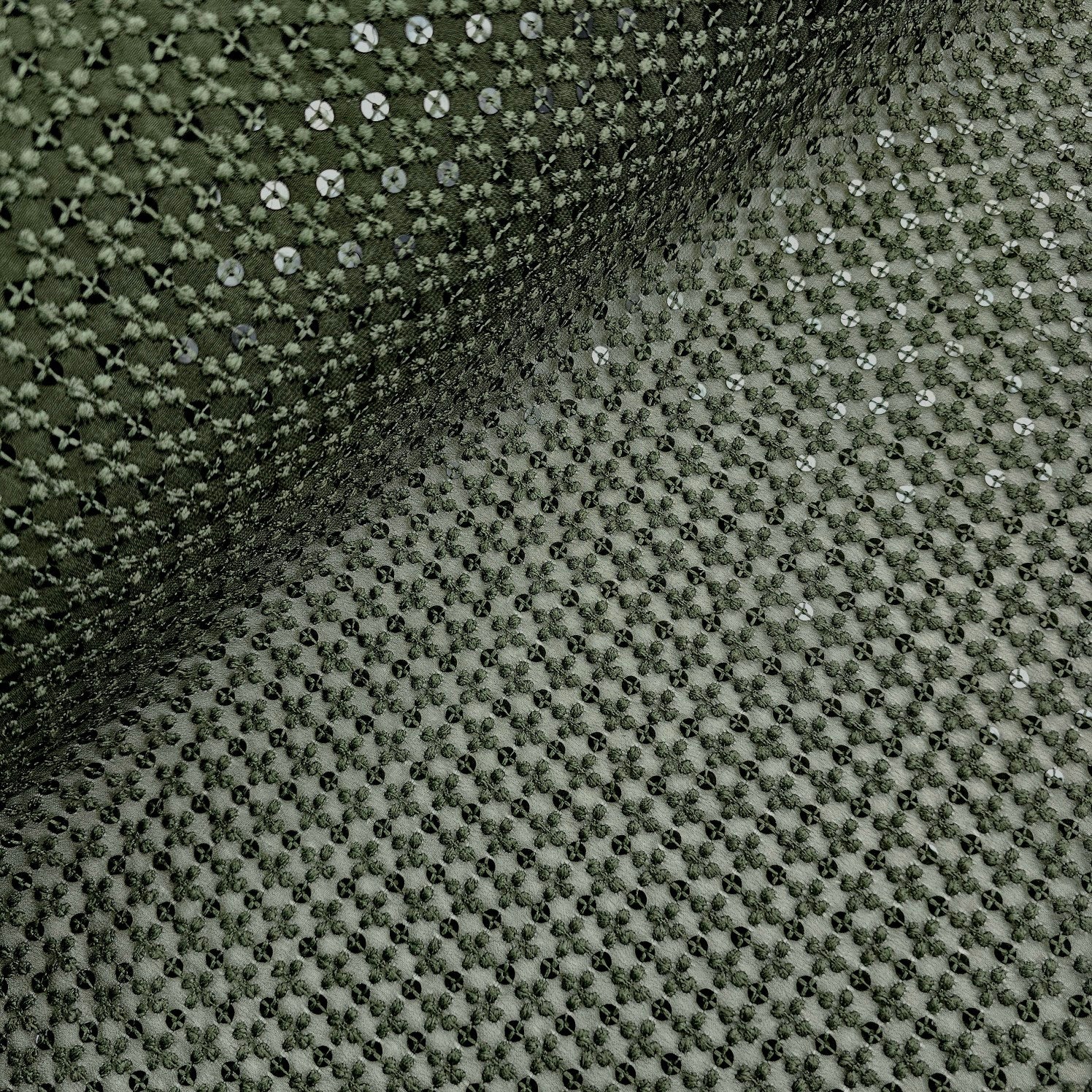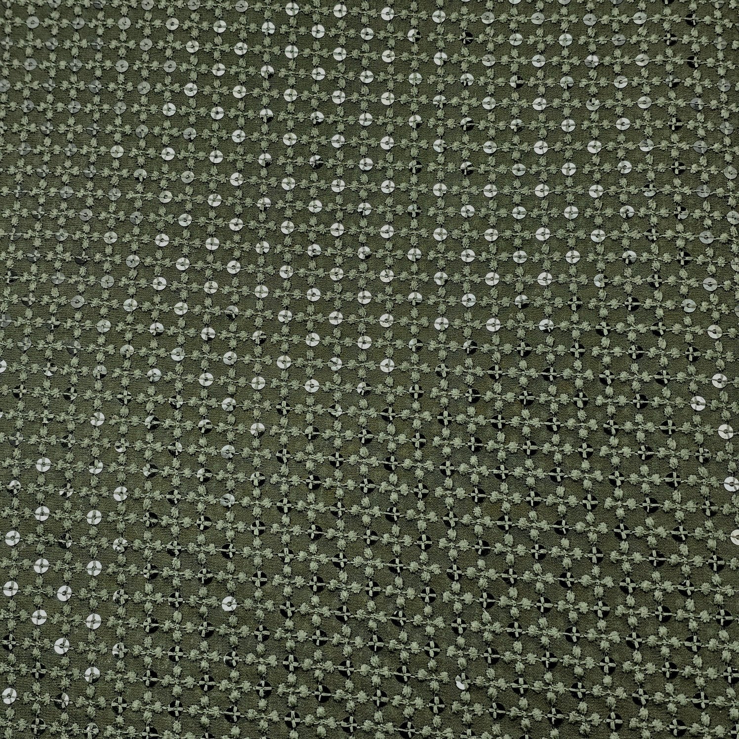 This is a delicate embroidered georgette fabric with intricate threadwork and mirror-finish sequins. The fabric has a lightweight and sheer base, making it ideal for festive and partywear outfits. The embroidery forms a geometric or floral pattern, adding texture and depth.