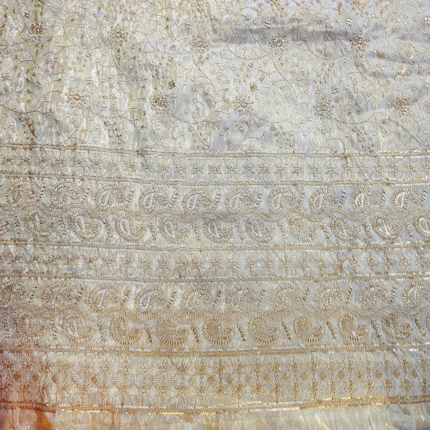 This stunning dyeable shimmer tissue fabric features detailed embroidery with sequins, zari, and threadwork, cutdana creating a perfect balance of traditional charm and modern elegance. The lower border is adorned with intricate geometric and floral motifs, while delicate vertical patterns add grace throughout the fabric. Ideal for ethnic and bridal outfits.