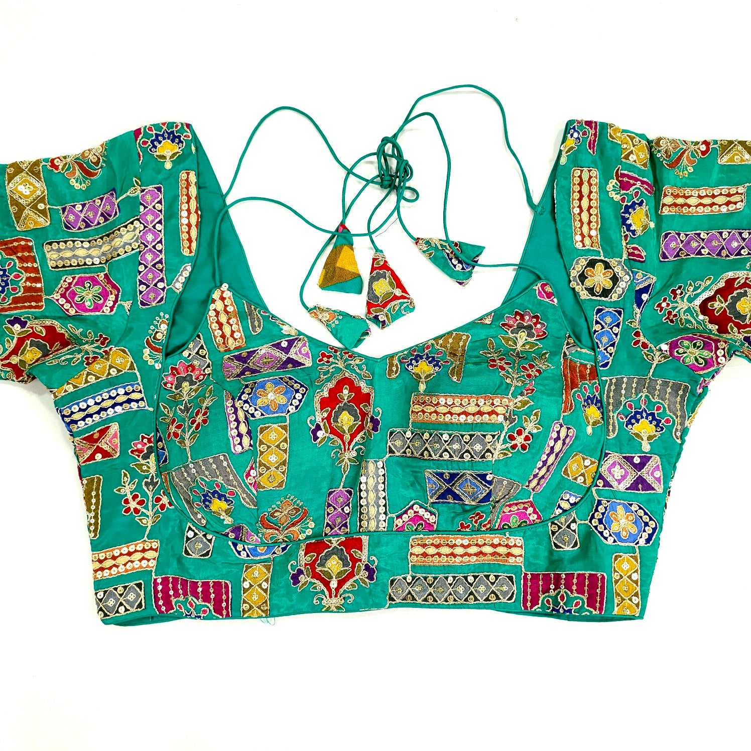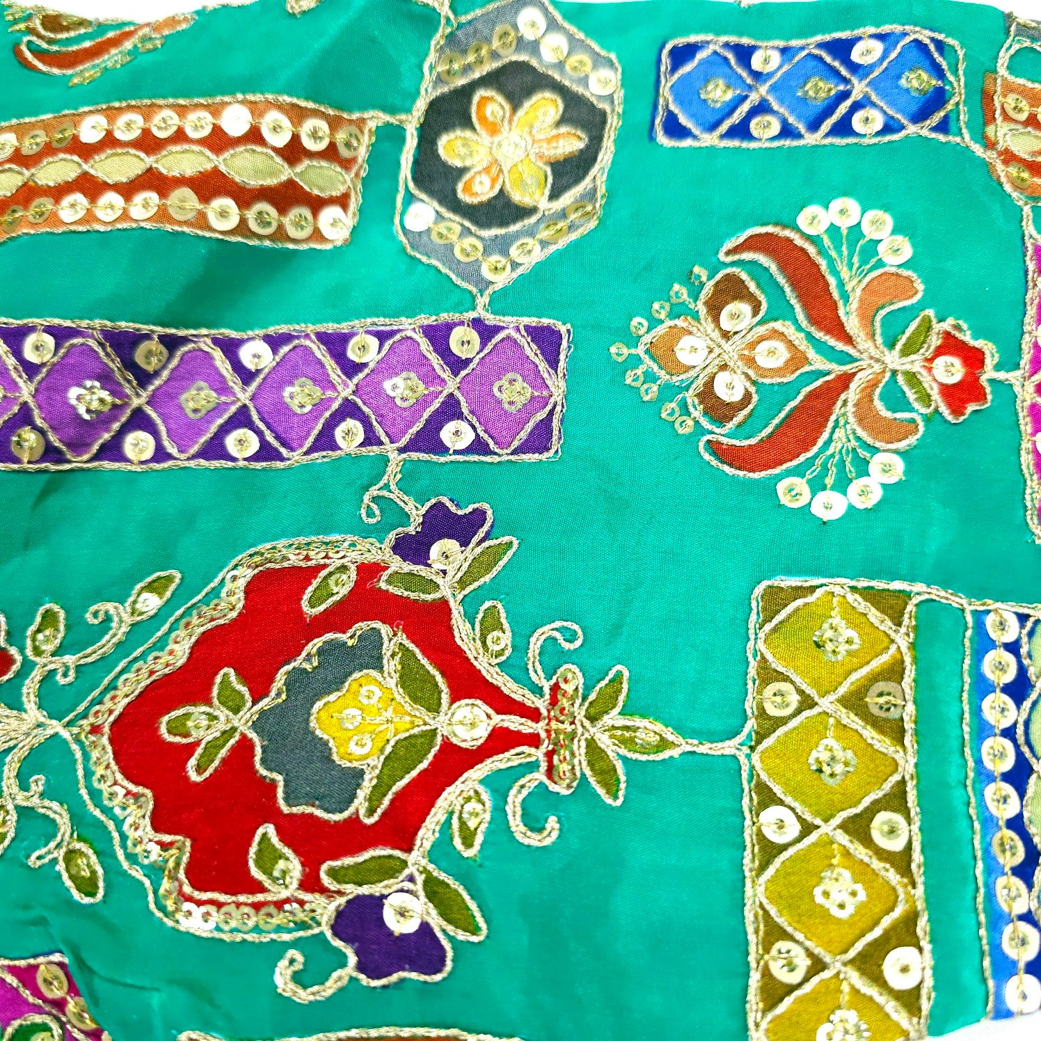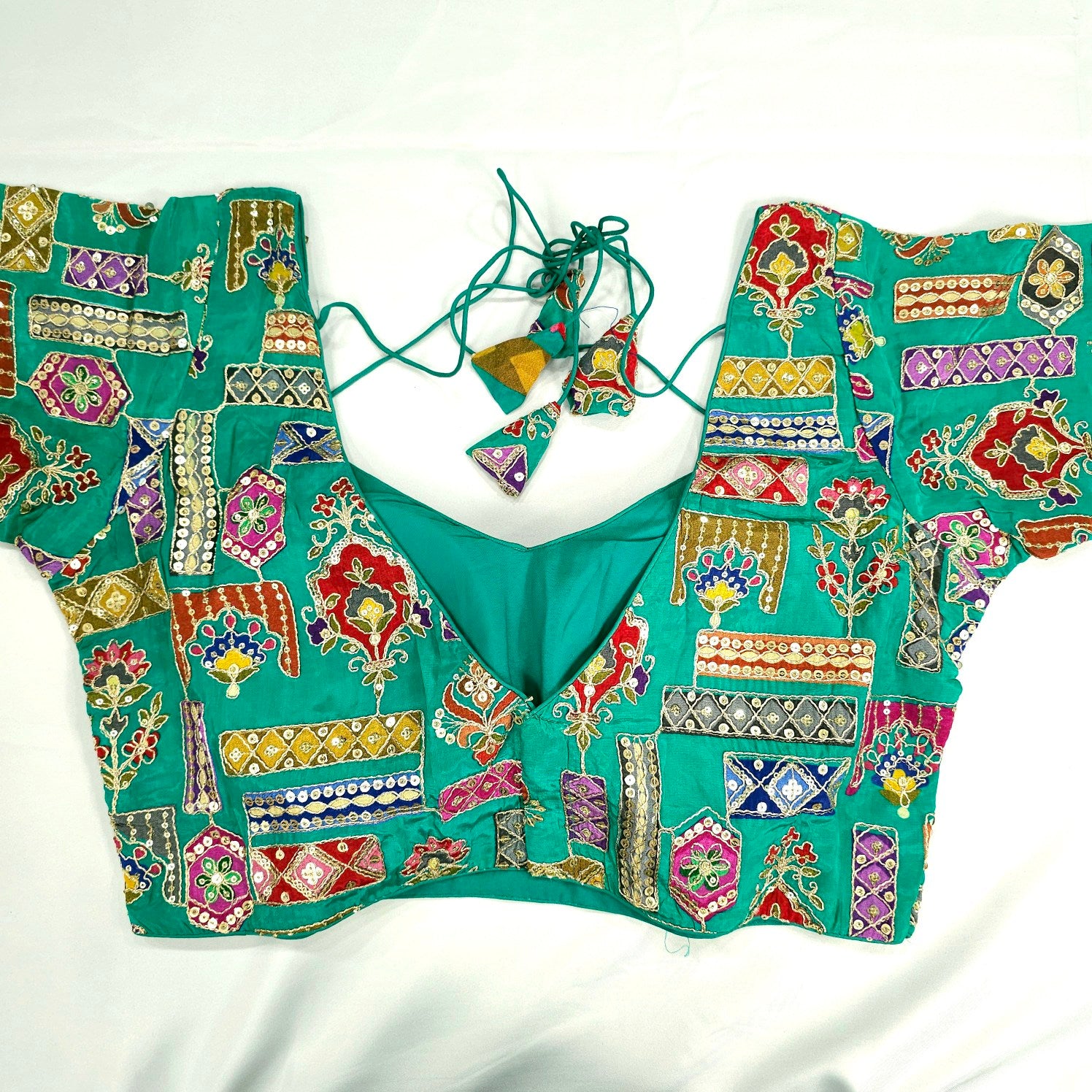 Floral zari work. Perfect for weddings, receptions, or festive celebrations. Blue Green