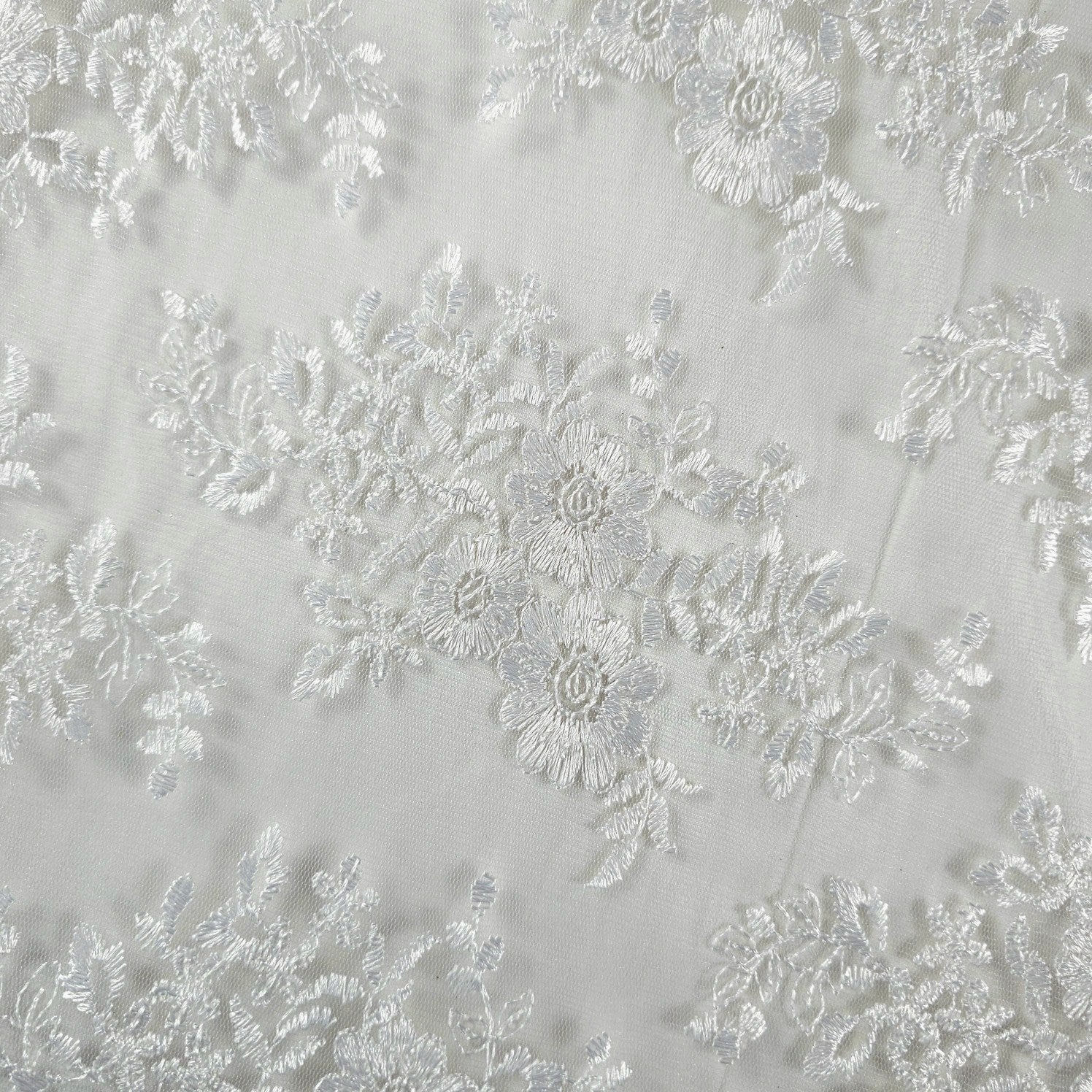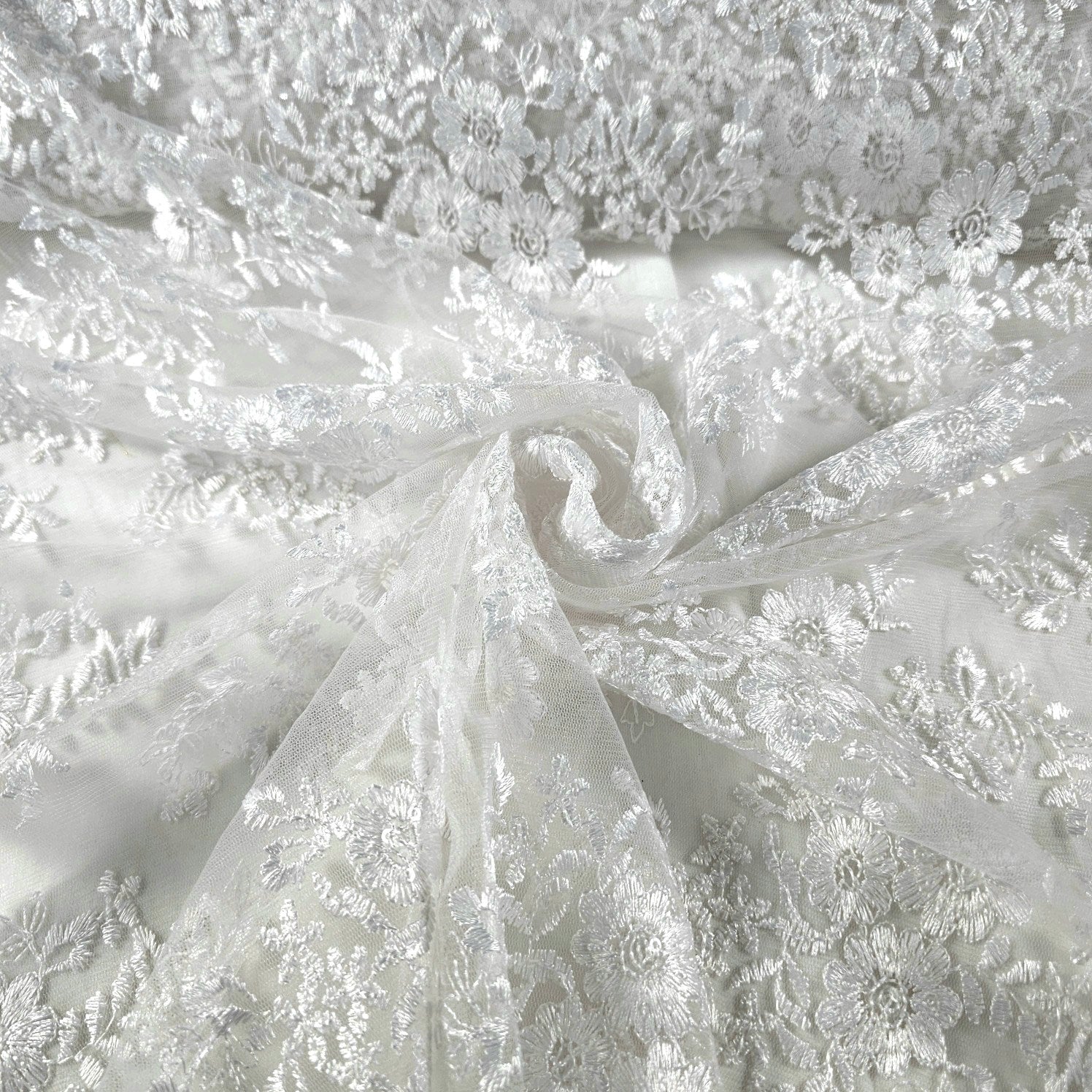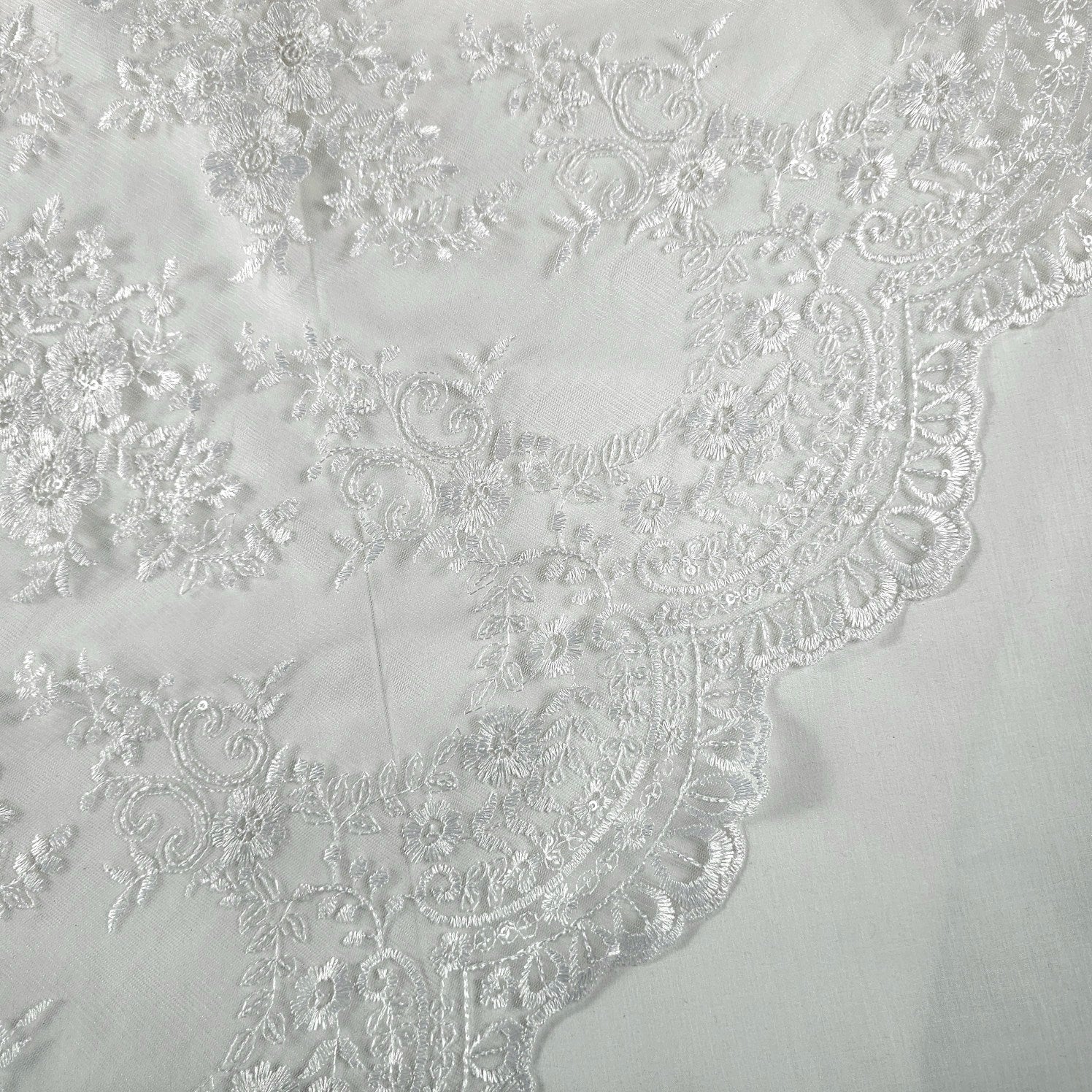 A dreamy white net fabric featuring delicate daisy-inspired floral embroidery, this textile exudes lightness and charm. The intricate threadwork mimics natural floral sprigs scattered across a translucent net, giving it an ethereal, floating effect. Paired with a beautifully scalloped border (as seen in the reference), this fabric is perfect for bridal gowns, veils, dupattas, and statement overlays.