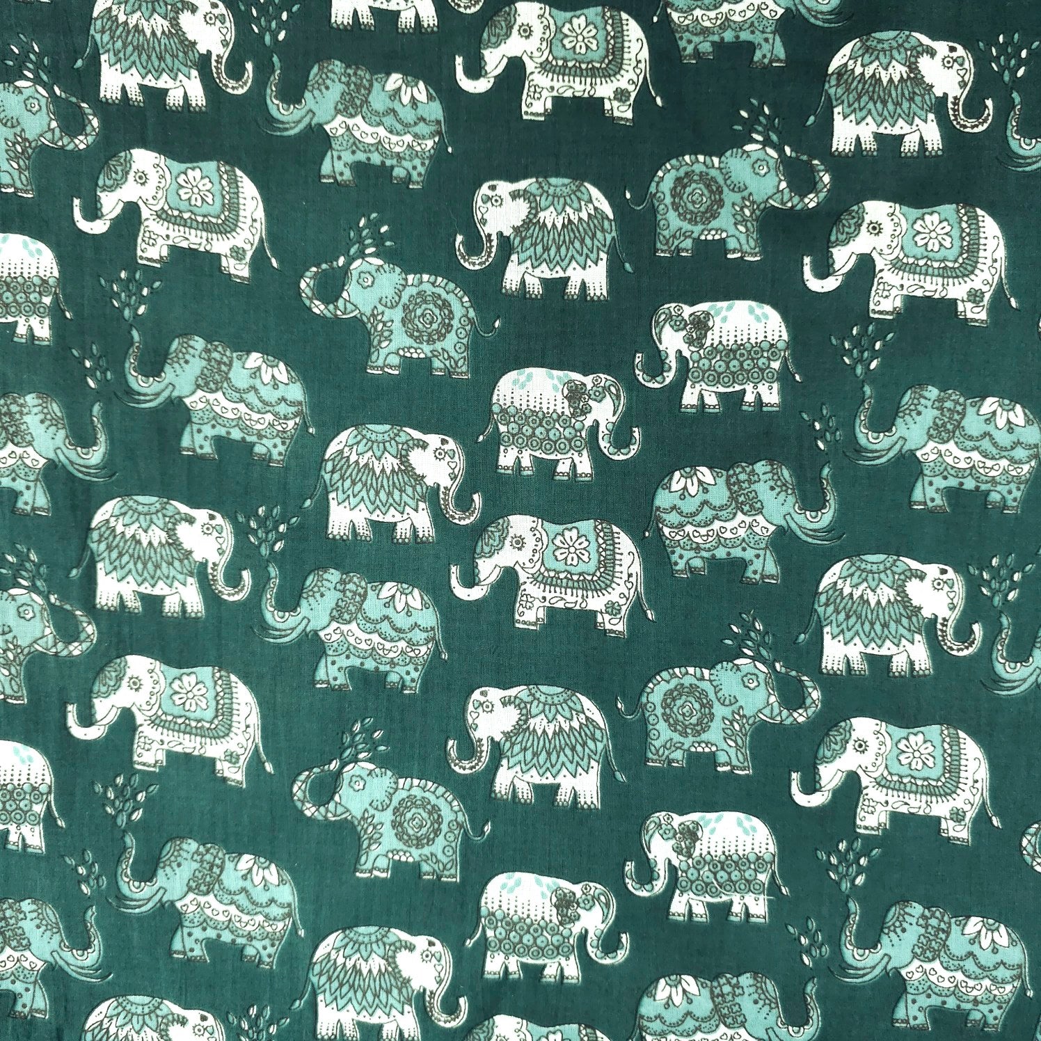 Playfully printed cotton fabric featuring a charming elephant motif in vibrant colors. The quirky and artistic design adds a fun and lively touch. Soft, breathable, and perfect for casual and creative projects.