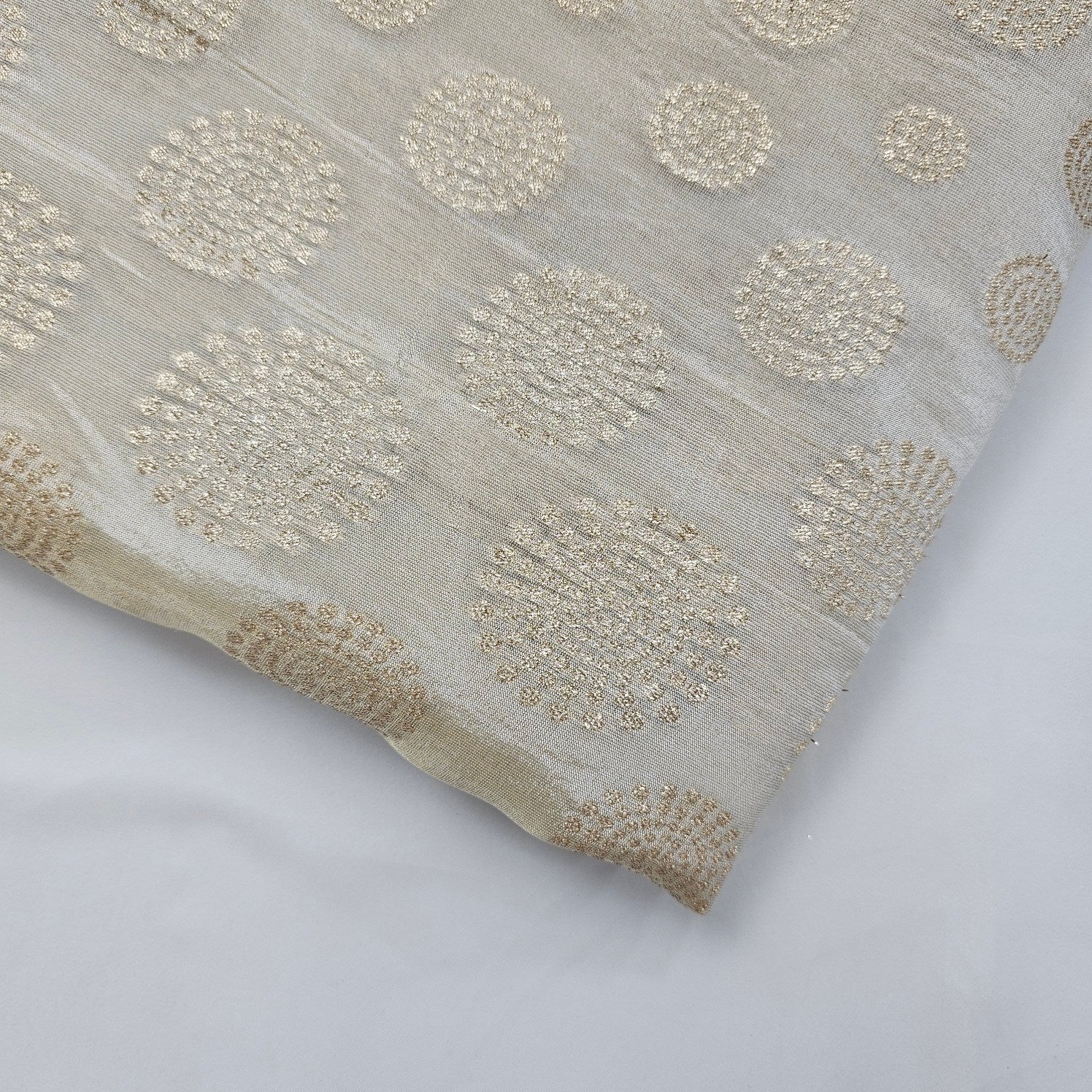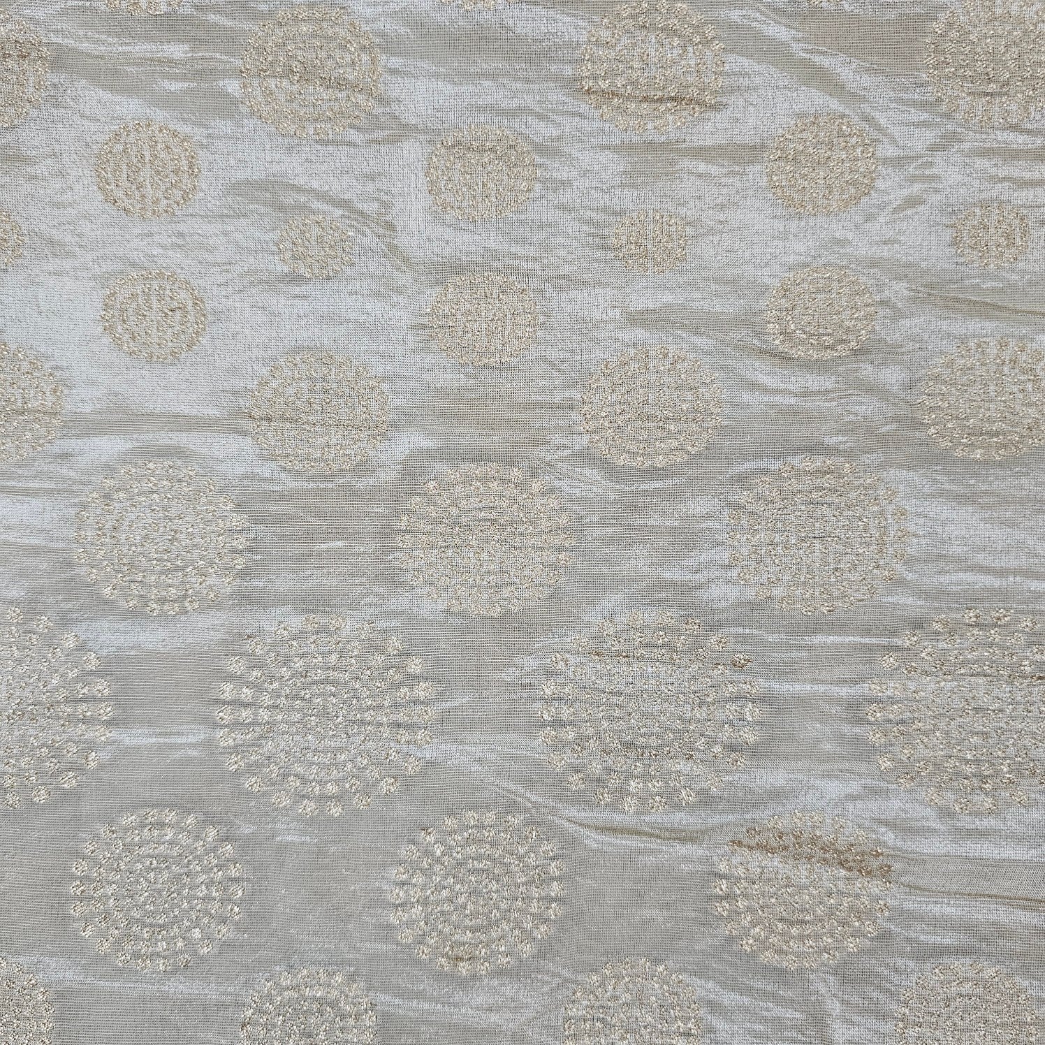 This shimmering tissue fabric features uniform embroidered circle motifs in a grid-like pattern, adding dimension and subtle sparkle. The base has a pearly silver-gold sheen, while the embroidery offers a delicate raised texture. It's ideal for chic festive garments or contemporary Indo-western fusion styles.
