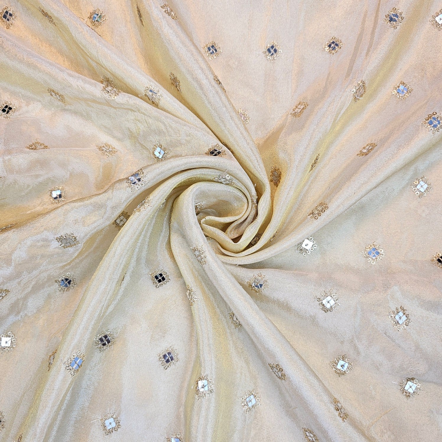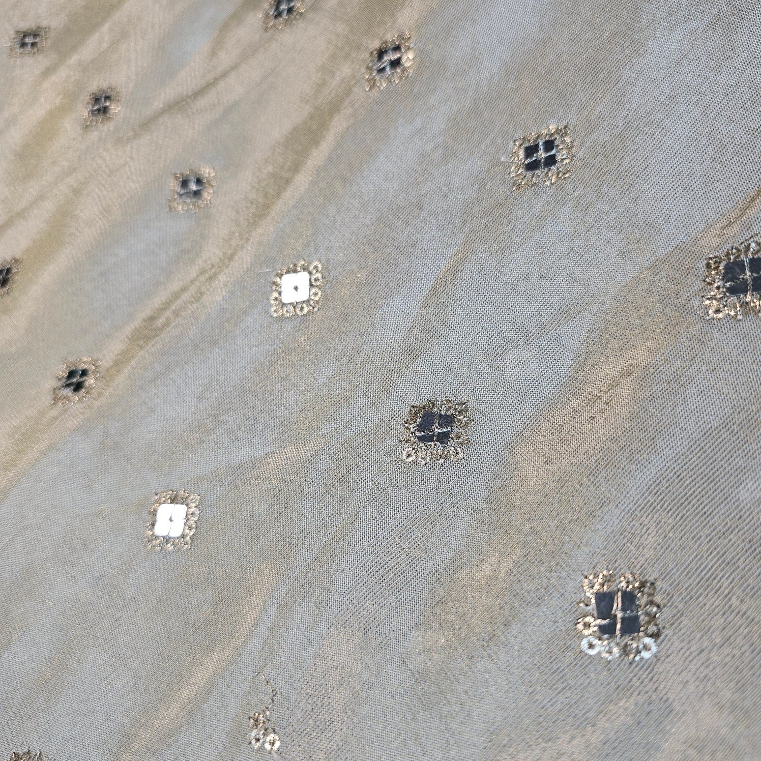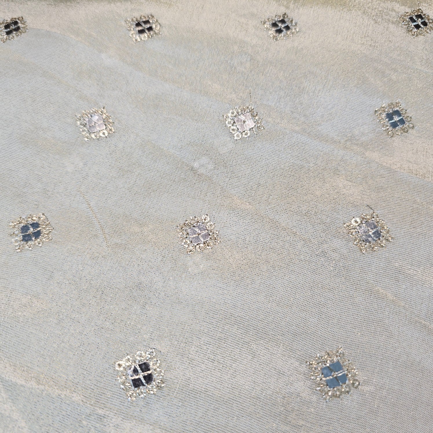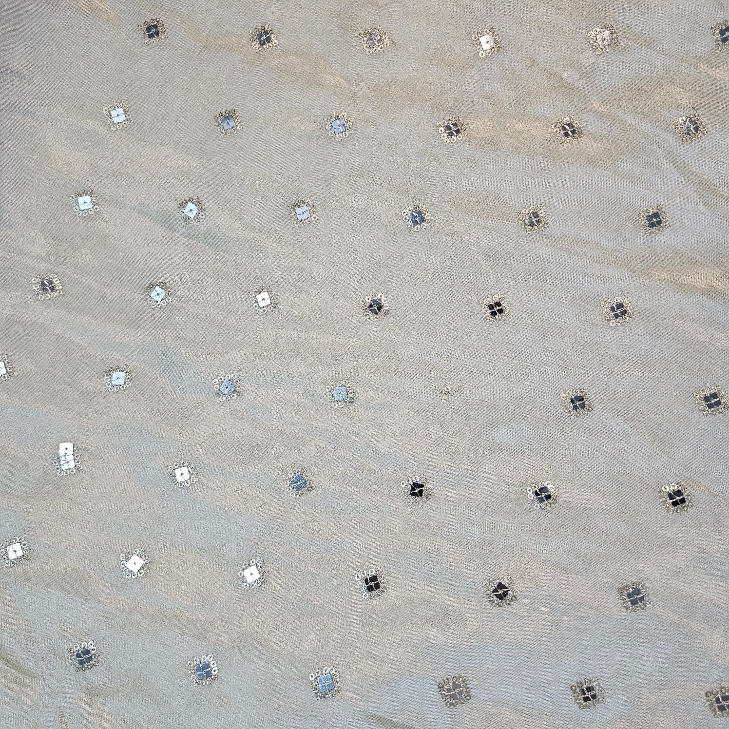 This shimmering tissue fabric features uniformly embroidered mirrors in a grid-like pattern, adding dimension and subtle sparkle. The base has a pearly silver-gold sheen, while the embroidery offers a delicate raised texture. It's ideal for chic festive garments or contemporary Indo-western fusion styles.
