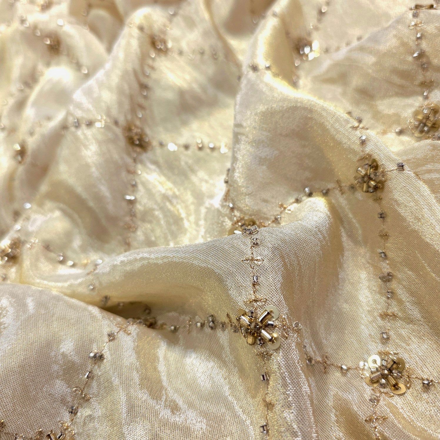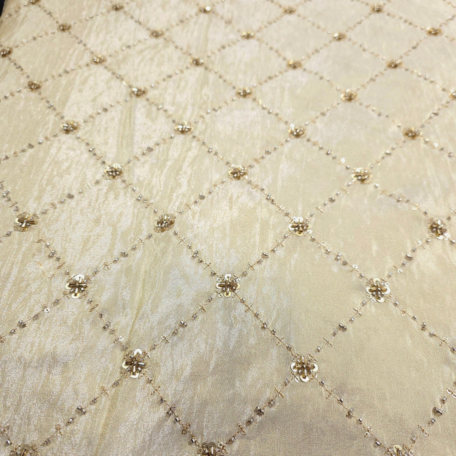 A delicate dyeable shimmer tissue fabric with fine, Checkered pattern. The sequin motifs are scattered with measured spacing, adding a touch of sparkle and charm without overpowering the base. Ideal for festive overlays and elegant occasion wear.