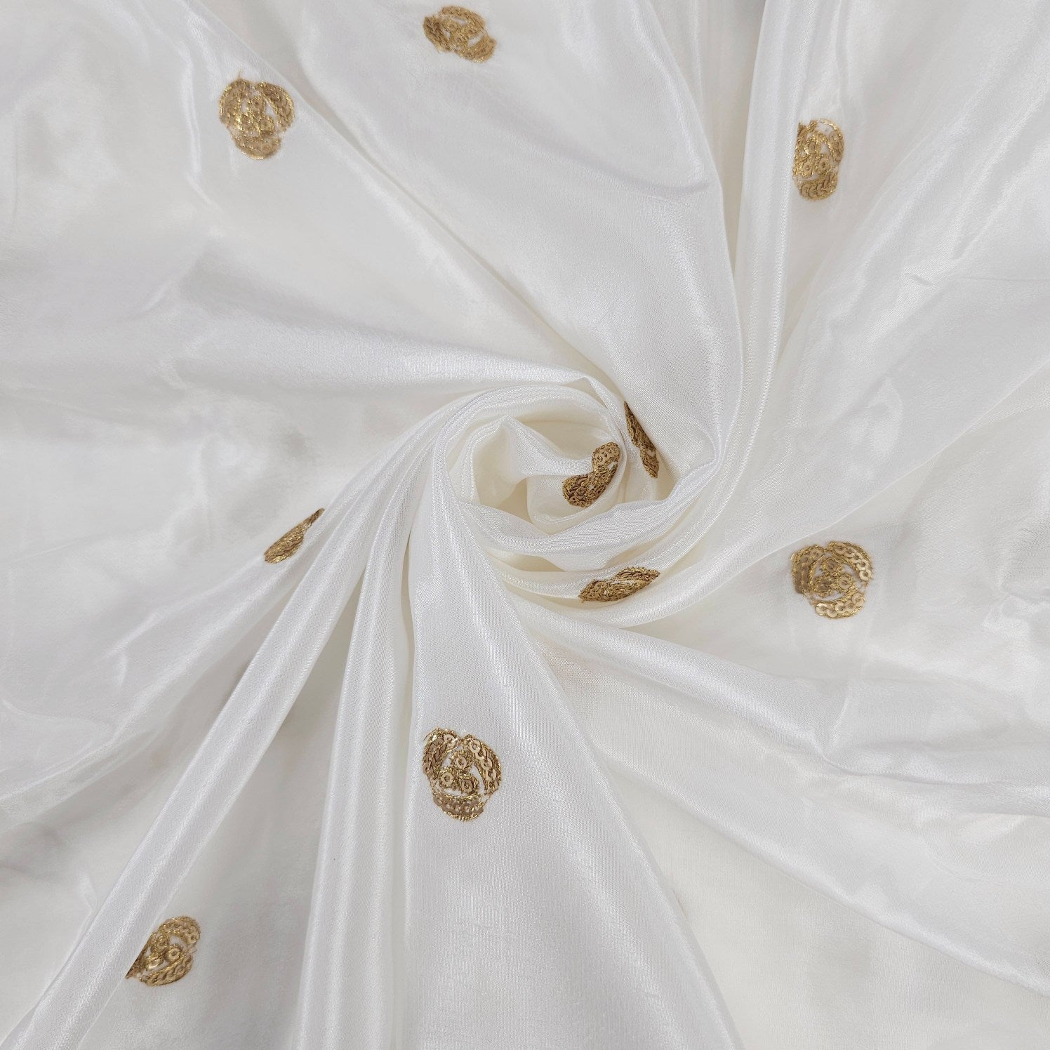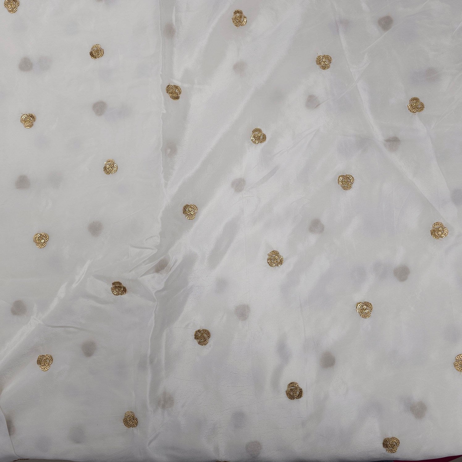 A soft dyeable white Crepe fabric with fine, all over miniature gold butta sequins. The sequin butta are scattered with measured spacing, adding a touch of sparkle and charm without overpowering the flowy base. Ideal for festive and elegant occasion wear.